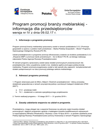 Program promocji branży meblarskiej informacja dla przedsiębiorców wersja nr IV z dnia 09.02.17 r. 1. Informacje o programie promocji. Program promocji branży meblarskiej opracowany został w ramach poddziałania 3.3.2 „Promocja gospodarki w oparciu o polskie marki produktowe – Marka Polskiej Gospodarki – Brand” Programu Operacyjnego Inteligentny Rozwój (PO IR). Udział przedsiębiorców w programie promocji sfinansowany zostanie ze środków poddziałania 3.3.3 „Wsparcie MŚP w promocji marek produktowych – Go to Brand” PO IR, za którego realizację odpowiada Polska Agencja Rozwoju Przedsiębiorczości. W ramach programu opracowany został wykaz działań promocyjnych przeznaczonych dla przedsiębiorców, który uzupełniony został o tzw. działania ogólne promujące polską branżę meblarską. Program promocji przygotowany został w taki sposób aby zapewnić komplementarność działań podejmowanych na rzecz promocji polskiego sektora meblarskiego. 2. Adresaci programu promocji. 1. Program skierowany jest do Mikro, Małych i Średnich przedsiębiorców 1, którzy prowadzą działalność gospodarczą w ramach przynajmniej jednej z poniższych kategorii działalności (PKD 20072): a. 31.0 - produkcja mebli b. 74.1 - działalność w zakresie specjalistycznego projektowania 2. Termin realizacji programu – 10 lutego 2017 r – 31 grudnia 2019 r. 3. Zasady udzielania wsparcia na udział w programie. Przedsiębiorcy, mogą ubiegać się o wsparcie finansowe na pokrycie części kosztów działań promocyjnych, objętych programem zgodnie z katalogiem kosztów kwalifikowanych wykazanych w rozporządzeniu Ministra Infrastruktury i Rozwoju z dnia 10 lipca 2015 r. w sprawie udzielania przez Polską Agencję Rozwoju Przedsiębiorczości pomocy finansowej w ramach Programu Operacyjnego Definicja Mikro, Małego i Średniego przedsiębiorcy jest określona w załączniku nr I do rozporządzenia KE nr 651/2014. Pełną Listę klasyfikacji określa Rozporządzenie Rady Ministrów z dnia 24 grudnia 2007 r. w sprawie Polskiej Klasyfikacji Działalności (Dz.U. 2007 nr 251 poz. 1885 z późn. zm.). 1 2 1 Inteligentny Rozwój 2014-2020 (Dz. U. poz. 1027). Maksymalna łączna wartość wydatków kwalifikowanych, objętych wsparciem finansowym, nie może przekroczyć kwoty 1 mln zł. Szczegółowe informacje nt. warunków udzielania wsparcia oraz przyjmowania wniosków w ramach poddziałania 3.3.3 PO IR zostaną zamieszczone na stronie internetowej Polskiej Agencji Rozwoju Przedsiębiorczości, w dniu ogłoszenia konkursu. 4. Działania promocyjne przewidziane w programie promocji dla przedsiębiorców. A. Zakres działań obligatoryjnych, w których muszą wziąć udział przedsiębiorcy korzystający z programu 1. Przedsiębiorca zobowiązany jest wybrać przynajmniej jeden (1) z poniższych pozaunijnych rynków perspektywicznych, który będzie zgodny ze strategią ekspansji firmy: a. Chiny, b. Zjednoczone Emiraty Arabskie c. Stany Zjednoczone Ameryki Północnej (USA), d. Turcja, e. Rosja, f. Kazachstan, g. Indie 2. Przedsiębiorca, w trakcie trwania całego programu, zobowiązany jest do wzięcia udziału w charakterze wystawcy w przynajmniej czterech (4) działaniach targowych, o których mowa w tabeli nr 1, przy czym przynajmniej trzy (3) z tych działań stanowić powinny imprezy targowe, w ramach których zostanie zorganizowane narodowe stoisko informacyjne, w tym przynajmniej jedno (1) z tych działań powinno stanowić imprezę targową na rynku/rynkach wybranym/wybranych w ramach pkt 4.A.1, w ramach której zostanie zorganizowane narodowe stoisko informacyjne. Tabela nr 1 L.p. Nazwa targów Miejsce odbywania się targów Termin odbywania się targów 1. Shenzhen International Furniture Exhibition Shenzhen, Chiny Marzec 2017, 2018, 2019 2. China International Furniture Fair Shanghai Szanghaj, Chiny Wrzesień 2017, 2018, 2019 3. Ismob Istanbul Furniture Fair (TBC) Stambuł, Turcja Styczeń 2018, 2019 Narodowe stoisko informacyjne Wrzesień 2018 Styczeń 2018 2 4. Index Dubaj, ZEA Maj 2017, 2018, 2019 Maj 2019 5. International Contemporary Furniture Fair Nowy Jork, USA Maj 2017, 2018, 2019 Maj 2018 6. Las Vegas Market. Furniture, Home Décor, Gift Las Vegas, USA przełom Lipca i Sierpnia 2017, Styczeń oraz przełom Lipca i Sierpnia 2018, 2019 7. Inno Design Tech Expo Hongkong, Chiny Grudzień 2017, 2018, 2019 8. Homedeco Kazachstan Marzec 2017, 2018, 2019 9. Mebel: Furniture, Fittings and Upholstery Moskwa, Rosja Listopad 2017, 2018, 2019 10. IMM Cologne Kolonia, Niemcy Styczeń 2018, 2019 11. Ambiente - Messe Frankfurt Frankfurt, Niemcy Luty 2017, 2018, 2019 12. Stockholm Furniture and Light Fair Sztokholm, Szwecja Luty 2018, 2019 Styczeń 2018 Styczeń 2019 Luty 2018 Kwiecień 2017 13. iSaloni. Salone Internazionale del Mobile Mediolan, Włochy Kwiecień 2017, 2018, 2019 Kwiecień 2018 Kwiecień 2019 14. Northmodern (poprzednio: Design Trade Copenhagen) Kopenhaga, Dania Sierpień 2017, 2018, 2019 15. Maison et Objet Paryż, Francja Wrzesień 2017, Styczeń i Wrzesień 2018, 2019 16. ORGATEC, New Visions of Work Kolonia, Niemcy Październik 2018, 3 17. January Furniture Show Birmingham, Wielka Brytania Styczeń 2018, 2019 18. M.O. W. Bad Salzuflen, Niemcy Wrzesień 2017, 2018, 2019 19. India Furniture Expo (TBC) Mumbai, Indie Sierpień 2017, 2018, 2019 100% Design Londyn, Wielka Brytania Wrzesień 2017, 2018, 2019 20. 3. Przedsiębiorca biorący udział w programie zobowiązany jest do zakupu przynajmniej jednej (1) usługi doradczej w zakresie przygotowania wejścia na rynki perspektywiczne wymienione w ramach pkt 4.A.1, w związku z udziałem w targach odbywających się na tych rynkach (tj. wnioskodawca w ramach projektu musi wziąć udział w charakterze wystawcy w targach odbywających się na terenie tych krajów). Usługi doradcze muszą zostać nabyte od podmiotu posiadającego potencjał do świadczenia usługi doradczej, w postaci oddziału firmy, jej przedst
