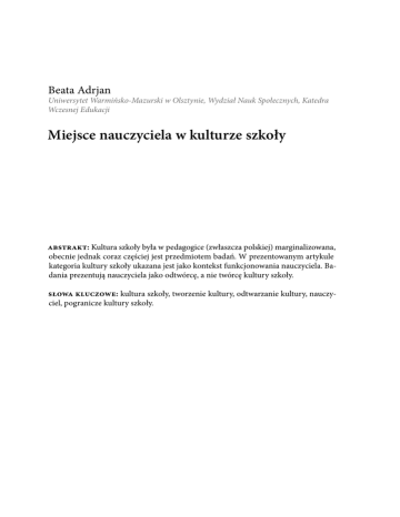 Beata Adrjan Uniwersytet Warmińsko-Mazurski w Olsztynie, Wydział Nauk Społecznych, Katedra Wczesnej Edukacji Miejsce nauczyciela w kulturze szkoły abstrakt: Kultura szkoły była w pedagogice (zwłaszcza polskiej) marginalizowana, obecnie jednak coraz częściej jest przedmiotem badań. W prezentowanym artykule kategoria kultury szkoły ukazana jest jako kontekst funkcjonowania nauczyciela. Badania prezentują nauczyciela jako odtwórcę, a nie twórcę kultury szkoły. słowa kluczowe: kultura szkoły, tworzenie kultury, odtwarzanie kultury, nauczyciel, pogranicze kultury szkoły. Kontakt: Beata Adrjan [email protected] Jak cytować: Adrjan, B. (2015). Miejsce nauczyciela w kulturze szkoły. Forum Oświatowe, 27(2), 95–102. Pobrane z: http://forumoswiatowe.pl/index.php/czasopismo/article/view/318 How to cite: Adrjan, B. (2015). Miejsce nauczyciela w kulturze szkoły. Forum Oświatowe, 27(2), 95–102. Retrieved from http://forumoswiatowe.pl/index.php/czasopismo/article/ view/318 Kultura szkoły jest obecnie pojęciem bardzo popularnym w obszarze edukacji. Jest to zagadnienie poruszane coraz częściej w badaniach edukacyjnych. Kultura jest rozumiana jako rodzaj „wytrychu” do otwarcia wrót rozumienia szkoły. Autorzy-badacze zgadzają się, że kultura szkoły jest obecna, że jest wytwarzana w szkole, że szkoła tworzy kulturę, że wszystko zależy od kultury. Nauczyciel jest nieodłączną częścią organizmu życiowego, jakim jest szkoła. „Szkoła nauczycielem stoi” utarło się w potocznym myśleniu o szkole. W swoich badaniach kultury szkoły miałam możliwość przyjrzenia się szkole w jej codziennym funkcjonowaniu. W tym artykule chcę podjąć refleksję nad uczestnictwem nauczyciela w kulturze szkoły. Przeprowadzone przeze mnie badania (por. Adrjan, 2011) były etnograficzną próbą uchwycenia kultury szkoły. Założeniem wyjściowym była teza, że każda placówka wykształca inną kulturę, będącą zespołem wzorów myślenia, działania, odczuwania, a także narzędziem przystosowania się jednostki do funkcjonowania w danej rzeczywistości (por. Tuohy, 2002). Naturalną metodą do badania zjawiska kultury szkoły, idąc tropem antropologii kulturowej, była metoda etnograficzna, która pozwoliła na wejście w daną społeczność i zobaczenie, „jak tam jest” (por. Hammersley, Atkinson, 2000; Kawecki, 1996; Woods, 1986). To jednak, co naturalne w przypadku wejścia w kulturę nową, okazało się utrudnione w badaniu kultury szkoły, doskonale znanej każdemu ludzkiemu doświadczeniu. Szukając więc modelu badawczego, porządkującego badanie kultury, trafiłam na kliniczny model kultury organizacyjnej Scheina i on się stał osią badania etnograficznego. Oczywiście, model stał się jedynie „mapą” poruszania się po kulturze szkoły, choć z perspektywy zakończonych badań, zmuszona jestem twierdzić, że była to mapa niekompletna. Model Scheina (por. Kostera, Kownacki, Szumski, 2000) wywodzi się z szerokiego nurtu teorii, dotyczących efektywności zarządzania firmami. Model Scheina pokazuje kulturę w postaci trójkąta, który ma trzy warstwy. Warstwa górna, najbardziej zauważalna i poddająca się obserwacji, to wytwory (zwane też przez autora artefaktami). Kolejna to normy i wartości, podzielane i uzewnętrzniane przez członków społeczności. Są one częściowo widoczne i uświadamiane. Najbardziej pojemną warstwą są założenia, niewidoczne i nieuświadamiane, które są, tak naprawdę, podstawą kultury. Założenia, zgodnie z koncepcją autora, uporządkowane zostały w czterech obszarach: założenia dotyczące związków z otoczeniem, natury ludzkiej, prawdy i czasu, oraz założenia dotyczące związków między ludźmi. Każdy z obsza- 96 Forum Oświatowe 27(2) Część ii. Z badań rów zawiera po 3 podobszary. W ten sposób model Scheina uzyskał postać swojego rodzaju „matrycy badawczej”, która posłużyła do opisu kultury szkoły. 1. Związek szkoły z otoczeniem a. Funkcjonujący w szkole jej obraz (misja / wizerunek); b. Powiązanie szkoły z innymi instytucjami; c. Sposób, w jaki wytycza się granice między szkołą a światem zewnętrznym. 2.Założenia o naturze ludzkiej a. Relacje między nauczycielem a uczniami w procesie kształcenia; b. Udział ucznia/rodzica/nauczyciela w życiu szkoły; c. Model ucznia preferowany w szkole. 3. Założenia, dotyczące prawdy i czasu a. Prawda jako wartość obiektywna/subiektywna; b. Historia, którą rządzi przypadek/porządek; c. Czas, koncentracja na przeszłości, teraźniejszości/przyszłości. 4. Założenia, dotyczące związków między ludźmi a. Dystrybucja statusu; b. Dystrybucja władzy; c. Życie społeczne. Mając taką mapę mentalną, badałam celowo wybrane dwie szkoły, małą wiejską i dużą miejską. Obie szkoły wcześniej znałam, znałam także osoby w nich pracujące. Badania każdej z nich zajęły mi blisko rok. Rozmawiałam z nauczycielami, dyrekcją, rodzicami, uczniami, obserwowałam lekcje, uroczystości szkolne, rady pedagogiczne, zebrania z rodzicami. Uczniowie pisali pracę „Moja zwykła–niezwykła szkoła”, do której pomysł zaczerpnęłam z tekstu Szkudlarka (1992). Analizowałam wszelkie, dostępne mi wytwory: dokumenty szkoły, wystawki, gazetki i wydawnictwa szkolne. Obserwowałam korytarze, klasy, rozmowy, zachowania, prowadziłam dzienniczek badań. Wszystkie wydarzenia rejestrowałam na taśmach dźwiękowych, następnie dokonywałam transkrypcji. Materiał badawczy poddałam kodowaniu na 12 kategorii z matrycy. W trakcie kodowania okazało się, że wiele wytworów nie pasowało do matrycy, bądź dany wytwór pasował do więcej niż jednej kategorii. Już w trakcie kodowania wiedziałam, że przygotowane narzędzie ma swoje słabości. W podjętych przeze mnie badaniach kultura szkoły, zaprezentowana w kategoriach opisu etnograficznego, ukazała się jako obszar, zawierający elementy różniące i