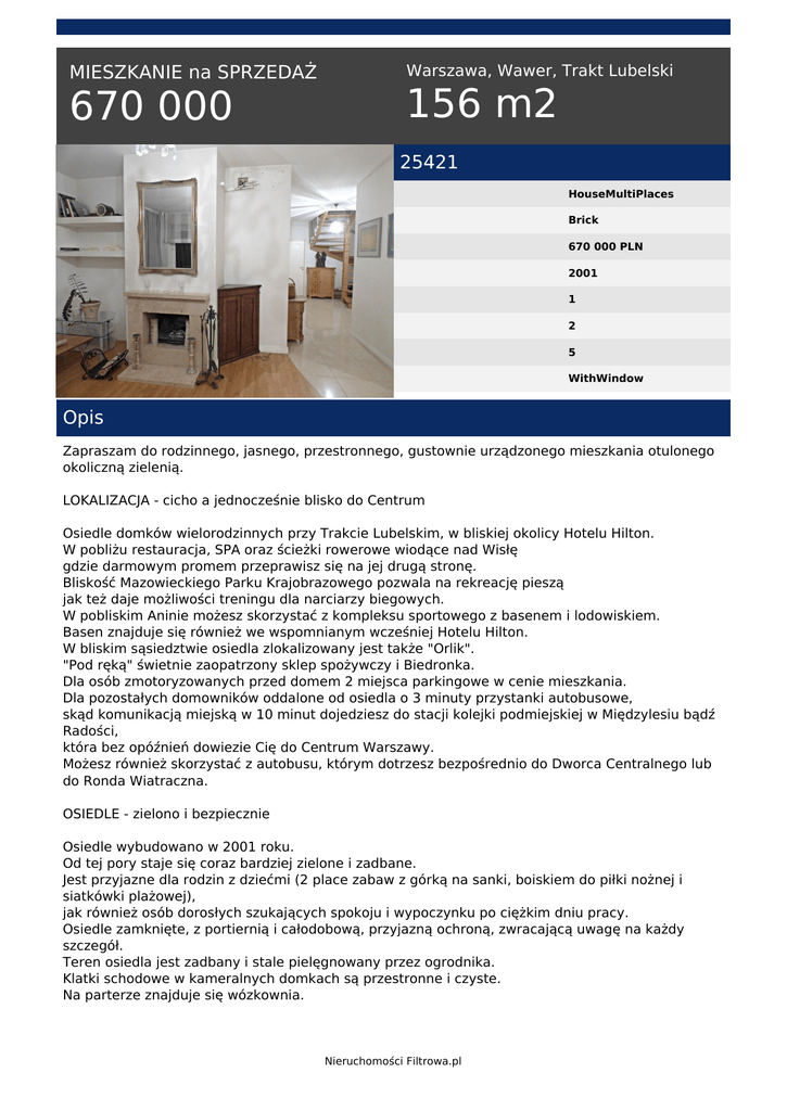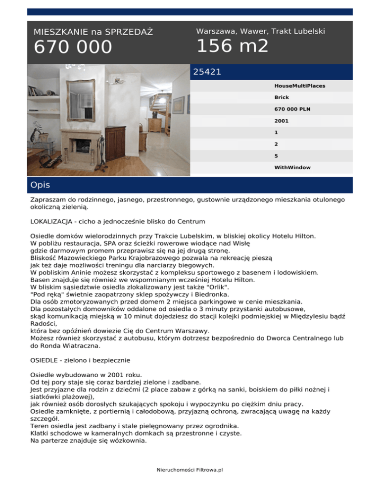 MIESZKANIE na SPRZEDAŻ 670 000 Warszawa, Wawer, Trakt Lubelski 156 m2 25421 HouseMultiPlaces Brick 670 000 PLN 2001 1 2 5 WithWindow Opis Zapraszam do rodzinnego, jasnego, przestronnego, gustownie urządzonego mieszkania otulonego okoliczną zielenią. LOKALIZACJA - cicho a jednocześnie blisko do Centrum Osiedle domków wielorodzinnych przy Trakcie Lubelskim, w bliskiej okolicy Hotelu Hilton. W pobliżu restauracja, SPA oraz ścieżki rowerowe wiodące nad Wisłę gdzie darmowym promem przeprawisz się na jej drugą stronę. Bliskość Mazowieckiego Parku Krajobrazowego pozwala na rekreację pieszą jak też daje możliwości treningu dla narciarzy biegowych. W pobliskim Aninie możesz skorzystać z kompleksu sportowego z basenem i lodowiskiem. Basen znajduje się również we wspomnianym wcześniej Hotelu Hilton. W bliskim sąsiedztwie osiedla zlokalizowany jest także "Orlik". "Pod ręką" świetnie zaopatrzony sklep spożywczy i Biedronka. Dla osób zmotoryzowanych przed domem 2 miejsca parkingowe w cenie mieszkania. Dla pozostałych domowników oddalone od osiedla o 3 minuty przystanki autobusowe, skąd komunikacją miejską w 10 minut dojedziesz do stacji kolejki podmiejskiej w Międzylesiu bądź Radości, która bez opóźnień dowiezie Cię do Centrum Warszawy. Możesz również skorzystać z autobusu, którym dotrzesz bezpośrednio do Dworca Centralnego lub do Ronda Wiatraczna. OSIEDLE - zielono i bezpiecznie Osiedle wybudowano w 2001 roku. Od tej pory staje się coraz bardziej zielone i zadbane. Jest przyjazne dla rodzin z dziećmi (2 place zabaw z górką na sanki, boiskiem do piłki nożnej i siatkówki plażowej), jak również osób dorosłych szukających spokoju i wypoczynku po ciężkim dniu pracy. Osiedle zamknięte, z portiernią i całodobową, przyjazną ochroną, zwracającą uwagę na każdy szczegół. Teren osiedla jest zadbany i stale pielęgnowany przez ogrodnika. Klatki schodowe w kameralnych domkach są przestronne i czyste. Na parterze znajduje się wózkownia. Nieruchomości Filtrowa.pl MIESZKANIE - na 3 strony świata, jasne i ciche Otoczone zielenią i mieszkającymi wśród niej ptakami, umilającymi letnie wieczory, które możesz spędzić na dużym balkonie w kształcie litery L (również grillując). Wewnątrz duży salon z kominkiem, połączony z jadalnią i kuchnią. Na tym samym poziomie jest jeszcze sypialnia, gabinet (bądź druga sypialnia) oraz łazienka i garderoba. Na drugim poziomie, na który wiodą drewniane schody znajduje się jeszcze dwie sypialnie, łazienka i pralnia (z miejscem na suszarnię i magazynek). Wszystko, urządzone ze smakiem. Na podłogach dębowy parkiet, parapety i kominek z jasnego marmuru. W mieszkaniu, na sufitach zainstalowane są czujniki przeciwpożarowe, jest również instalacja do klimatyzacji. Drzwi antywłamaniowe, metalowe z dwoma zamkami. Mieszkanie zostało powiększone o powierzchnię schowka, który przylegał do mieszkania. Zwiększyło to jego powierzchnię do 120 m2 (w pełnej wysokości ścian). Powierzchnia "pod skosami" dodaje metraż "po podłodze" co w ostateczności daje 156 m2 do wykorzystania. Zapraszam na prezentację i ... samodzielną ocenę tego urokliwego miejsca. Nieruchomości Filtrowa.pl tel. 602 109 102 email: [email protected] Nieruchomości Filtrowa.pl Powered by TCPDF (www.tcpdf.org)