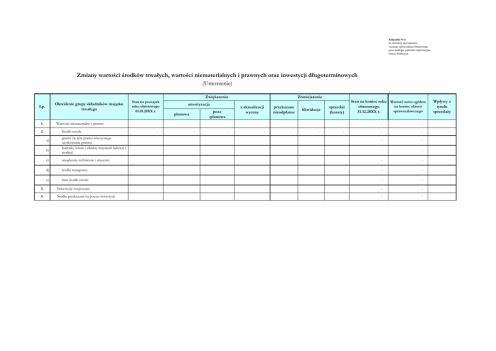 Załącznik Nr 6 do instrukcji sporządzania rocznego sprawozdania finansowego przez podległe jednostki organizacyjne Gminy Wałbrzych Zmiany wartości środków trwałych, wartości niematerialnych i prawnych oraz inwestycji długoterminowych (Umorzenie) , Zwiększenia Określenie grupy składników majątku trwałego Lp. 1. Stan na początek roku obrotowego 01.01.20XX r. amortyzacja z aktualizacji wyceny poza -planowa planowa Zmniejszenia przekazane nieodpłatne likwidacja sprzedaż (koszty) Wartości niematerialne i prawne 2. Środki trwałe a) b) grunty (w tym prawo wieczystego użytkowania gruntu) budynki, lokale i obiekty inżynierii lądowej i wodnej - - - - - - - Stan na koniec roku Wartość netto ogółem na koniec okresu obrotowego sprawozdawczego 31.12.20XX r. - - - - - - - - c) urządzenia techniczne i maszyny - - d) środki transportu - - e) inne środki trwałe - - 3. Inwestycje rozpoczęte - - 4. Środki przekazane na poczet inwestycji - - Wpływy z tytułu sprzedaży -
