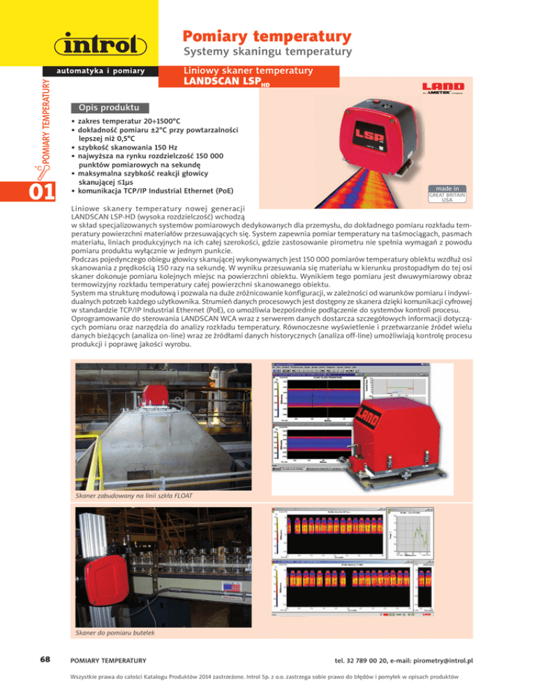 Pomiary temperatury Systemy skaningu temperatury POMIARY TEMPERATURY Liniowy skaner temperatury 01 01 LANDSCAN LSPHD Opis produktu • zakres temperatur 20÷1500°C • dokładność pomiaru ±2°C przy powtarzalności lepszej niż 0,5°C • szybkość skanowania 150 Hz • najwyższa na rynku rozdzielczość 150 000 punktów pomiarowych na sekundę • maksymalna szybkość reakcji głowicy skanującej ≤1μs • komunikacja TCP/IP Industrial Ethernet (PoE) made in GREAT BRITAIN USA Liniowe skanery temperatury nowej generacji LANDSCAN LSP-HD (wysoka rozdzielczość) wchodzą w skład specjalizowanych systemów pomiarowych dedykowanych dla przemysłu, do dokładnego pomiaru rozkładu temperatury powierzchni materiałów przesuwających się. System zapewnia pomiar temperatury na taśmociągach, pasmach materiału, liniach produkcyjnych na ich całej szerokości, gdzie zastosowanie pirometru nie spełnia wymagań z powodu pomiaru produktu wyłącznie w jednym punkcie. Podczas pojedynczego obiegu głowicy skanującej wykonywanych jest 150 000 pomiarów temperatury obiektu wzdłuż osi skanowania z prędkością 150 razy na sekundę. W wyniku przesuwania się materiału w kierunku prostopadłym do tej osi skaner dokonuje pomiaru kolejnych miejsc na powierzchni obiektu. Wynikiem tego pomiaru jest dwuwymiarowy obraz termowizyjny rozkładu temperatury całej powierzchni skanowanego obiektu. System ma strukturę modułową i pozwala na duże zróżnicowanie konfiguracji, w zależności od warunków pomiaru i indywidualnych potrzeb każdego użytkownika. Strumień danych procesowych jest dostępny ze skanera dzięki komunikacji cyfrowej w standardzie TCP/IP Industrial Ethernet (PoE), co umożliwia bezpośrednie podłączenie do systemów kontroli procesu. Oprogramowanie do sterowania LANDSCAN WCA wraz z serwerem danych dostarcza szczegółowych informacji dotyczących pomiaru oraz narzędzia do analizy rozkładu temperatury. Równoczesne wyświetlenie i przetwarzanie źródeł wielu danych bieżących (analiza on-line) wraz ze źródłami danych historycznych (analiza off-line) umożliwiają kontrolę procesu produkcji i poprawę jakości wyrobu. Skaner zabudowany na linii szkła FLOAT Skaner do pomiaru butelek 68 POMIARY TEMPERATURY tel. 32 789 00 20, e-mail: [email protected] Wszystkie prawa do całości Katalogu Produktów 2014 zastrzeżone. Introl Sp. z o.o. zastrzega sobie prawo do błędów i pomyłek w opisach produktów Pomiary temperatury POMIARY TEMPERATURY Systemy skaningu temperatury Skaner zamontowany w linii ciągłego odlewania stali COS 01 Parametry techniczne zastosowanie przemysł cementowy transport materiałów przemysł szklarski hutnictwo stali przemysł włókienniczy i papierniczy przemysł tworzyw sztucznych inne branże – piece obrotowe, przenośniki, suszarki – cement, asfalt, koks, biomasa, węgiel (dopuszczenie ATEX do strefy zagrożenia wybuchem 20) – linia produkcyjna szkła float, przemysł samochodowy, naczynia gospodarskie, gięcie, uplastycznianie/hartowanie, odprężanie, płytki ogniwa słonecznego – huta walcowania na gorąco – wejście/wyjście walcowania wstępnego, zgrzewarka taśm, zgrzewarka krawędzi, urządzenie do odlewania ciągłego/ /wielokrotnego – walcownia płyt grubych – wejście/wyjście walcowania wstępnego, prostownica do blach gorących – walcownia belek- belka, urządzenie do odlewania belek, detekcja pęczniejącej belki – wyjście pieca grzewczego, pręt i drut – huta walcowania na gorąco – strefa chłodzenia – walcownia płyt grubych – samotok odprowadzający – linia wyżarzania ciągłego (góra wylotu przed kotłem cynkowym) – piece do wyżarzania – linie ocynowywania i cynkowania z przeżarzaniem – podwozie mieszalnika, zabezpieczenie kadzi, stal powlekana – linie ocynowywania (pozycja walcem do góry) – walcowanie na zimno – linie nakładania farby – zwoje/rolki papieru, materiału – tworzywa oparte na polimerze – PCV, poliwęglany, polipropyleny, polietyleny, PET, celuloza, polistyren, cienkie tworzywo sztuczne, elementy kształtowane termiczne – wytłaczarka tworzyw sztucznych, elementy kształtowanie termiczne – procesy powlekania, produkty budowlane e-mail: [email protected], tel. 32 789 00 20 typowy zakres temperatury pomiarowej 20 ÷ 250°C 40 ÷ 400°C 100 ÷ 600°C 20 ÷ 250°C 50 ÷ 400°C 100 ÷ 600°C zalecany skaner LSPHD 60 LSPHD 61 LSPHD 62 LSPHD 60 LSPHD 61 LSPHD 62 150 ÷ 750°C 500 ÷ 1100°C LSPHD 5FL & 50 LSPHD 52 600 ÷ 1400°C 700 ÷ 1500°C LSPHD 10 LSPHD 11 200 ÷ 850°C 300 ÷ 1000°C 400 ÷ 1200°C LSPHD 20 LSPHD 21 LSPHD 22 20 ÷ 250°C 50 ÷ 400°C 100 ÷ 600°C LSPHD 60 LSPHD 61 LSP 62 50 ÷ 350°C 20 ÷ 600°C 50 ÷ 350°C LSPHD 71 LSPHD 60, 61 i 62 LSPHD 71 50 ÷ 350°C LSPHD 71 20 ÷ 250°C 50 ÷ 400°C 100 ÷ 600°C LSPHD 60 LSPHD 61 LSPHD 62 20 ÷ 600°C LSPHD 60, 61 i 62 POMIARY TEMPERATURY Wszystkie prawa do całości Katalogu Produktów 2014 zastrzeżone. Introl Sp. z o.o. zastrzega sobie prawo do błędów i pomyłek w opisach produktów 69