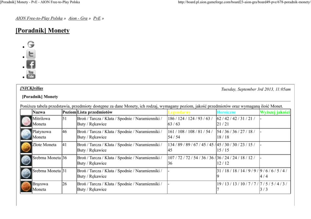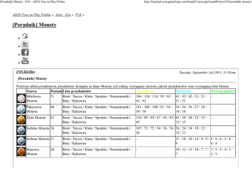 [Poradnik] Monety - PvE - AION Free-to-Play Polska http://board.pl.aion.gameforge.com/board23-aion-gra/board49-pve/678-poradnik-monety/ AION Free-to-Play Polska » Aion - Gra » PvE » [Poradnik] Monety [NICK]rillas Tuesday, September 3rd 2013, 11:05am [Poradnik] Monety Poniższa tabela przedstawia, przedmioty dostępne za dane Monety, ich rodzaj, wymagany poziom, jakość przedmiotów oraz wymaganą ilość Monet. Nazwa Poziom Lista przedmiotów Legendarny Heroiczne Wyższej jakości Mitrilowa 51 Broń / Tarcza / Klata / Spodnie / Naramienniki / 186 / 124 / 124 / 93 / 63 / 62 / 42 / 42 / 31 / 21 / Moneta Buty / Rękawice 63 / 63 21 / 21 Platynowa Moneta 46 Broń / Tarcza / Klata / Spodnie / Naramienniki / Buty / Rękawice 161 / 108 / 108 / 81 / 54 / 54 / 36 / 36 / 27 / 18 / 54 / 54 18 / 18 - Złote Moneta 41 Broń / Tarcza / Klata / Spodnie / Naramienniki / Buty / Rękawice 134 / 89 / 89 / 67 / 45 / 45 / 45 / 30 / 30 / 23 / 15 / 45 15 / 15 - Srebrna Moneta 36 Broń / Tarcza / Klata / Spodnie / Naramienniki / Buty / Rękawice 107 / 72 / 72 / 54 / 36 / 36 / 36 / 24 / 24 / 18 / 12 / 36 12 / 12 - Srebrna Moneta 31 Broń / Tarcza / Klata / Spodnie / Naramienniki / Buty / Rękawice - 31 / 18 / 18 / 14 / 9 / 9 / 9 / 6 / 6 / 5 / 4 / 9 4/4 Brązowa Moneta Broń / Tarcza / Klata / Spodnie / Naramienniki / Buty / Rękawice - 19 / 13 / 13 / 10 / 7 / 7 / 7 / 5 / 5 / 4 / 3 / 7 3/3 26 [Poradnik] Monety - PvE - AION Free-to-Play Polska Brązowa Moneta http://board.pl.aion.gameforge.com/board23-aion-gra/board49-pve/678-poradnik-monety/ 21 Broń / Tarcza / Klata / Spodnie / Naramienniki / Buty / Rękawice - - 4/3/3/2/2/ 2/2 Żelazna Moneta 16 Broń / Tarcza / Klata / Spodnie / Naramienniki / Buty / Rękawice - - 3/2/2/2/1/ 1/1 Poniższa tabela przedstawia miejsca, gdzie można wymieniać monety. Rodzaj monet Lokalizacja u Asmodian Żelazna Impetusium, Altgard Moneta Brązowa Lodowa Twierdza Morheim, Morheim Moneta Srebrna Lądowisko Prinium, Reshanta / Alsig, Morheim / Pystunny Moneta Garnizon, Morheim / Twierdza Beluslan, Beluslan Złota Moneta Lądowisko Prinium, Reshanta / Jaskinia Czerwonych Grzyw, Beluslan / Obóz Uchodźców w Besfel, Beluslan Platynowa Górska Wioska Baltasar, Brusthonin / Punkt Widokowy w Iollu, Moneta Brusthonin Mitrilowa Twierdza Gelkmaros, Gelkmaros Moneta Lokalizacja u Elyosów Relikwiarz Ardus, Verteron Twierdza Eltnen, Eltnen Lądowisko Teminon, Reshanta / Agarion, Eltnen / Pustynny Obóz Zwiadowców, Eltnen / Heiron, Heiron Lądowisko Teminon, Reshanta / Jejaparan, Heiron Wioska Obserwatorium, Theobomos / Dom Gościnny Jamanok, Theobomos Twierdza Iluzji Inggison, Inggison Źródło: Coin Guide + update w grze co do ilości wymaganych coinów PS. Czy ktoś mógłby to sformatować? [NICK]rillas Thursday, September 5th 2013, 9:55am Dzięki za poprawienie mojego tekstu - bump [NICK]nommad79 Thursday, September 5th 2013, 10:09am Sugerowałbym dodanie nowych lokalizacji wymiany monet, chodzi o skrzynki kupowane w "garnizonach". Pytanie jeszcze które mi się nasuwa, to czy analogicznie można także kupować te skrzynki za monety mitrylowe, czy ktoś ma informacje na ten temat. [NICK]rillas Thursday, September 5th 2013, 10:25am [Poradnik] Monety - PvE - AION Free-to-Play Polska http://board.pl.aion.gameforge.com/board23-aion-gra/board49-pve/678-poradnik-monety/ Jeszcze nie ogarnęłam dokładnie nowości z 4.0, więc czy mógłbyś konkretniej powiedzieć? [NICK]nommad79 tudzież jakaś nazwa / screen gdzie to jest? Thursday, September 5th 2013, 10:32am Jedynie to z relacji innych osób tego się dowiedziałem, więc także mam szczątkowe informacje w tym zakresie. Wiem, że chyba silver coin jest do wymiany w obozie na terenie laboratoriów Lefarystów w Heiron, o resztę muszę się wypytać - jestem po stronie Elyos. Nie szukałem w necie, może już jakieś tematy pojawiły się odnośnie tej tematyki. [NICK]eteric Thursday, September 5th 2013, 12:31pm Quoted from "[NICK]nommad79" Sugerowałbym dodanie nowych lokalizacji wymiany monet, chodzi o skrzynki kupowane w "garnizonach". Pytanie jeszcze które mi się nasuwa, to czy analogicznie można także kupować te skrzynki za monety mitrylowe, czy ktoś ma informacje na ten temat. Tylko za 3 Rodzaje monet mozna kupowac skrzynki. Silver ( 20 monet) Gold ( 30 Monet ) Platyna ( 40 Monet ) [NICK]rillas Friday, September 6th 2013, 10:14am Eteric, a coś dokładniej? Mam rozumieć że w garnizonach w Morheim i innych nisko-lvl zonach, kupujesz skrzynki z których lecą Monety? One są za kinahy czy płacisz czymś innym? [NICK]eteric Nie nie Rillas. To nie tak. To co napisałem to skrzyneczki za coiny ktore zbierasz. Silver,Gold i Platynki. Friday, September 6th 2013, 2:07pm [Poradnik] Monety - PvE - AION Free-to-Play Polska http://board.pl.aion.gameforge.com/board23-aion-gra/board49-pve/678-poradnik-monety/ Chodzi tu o to Ze za 20 silver coinow masz skrzyneczke z której wypadaja Scrolle,po 4-8 Enchantów L 60 lub czesci Akcesoriów E 30 Abyss (Slag Bulwark obóz)Morheim Po stronie Asmodian. Za 30 gold coinow masz skrzyneczke z której tak samo wypadaja scrolle,od 4 do 8 Enchantów L 65 chyba i Bizuteria Abyss E 40 (Oboz niedaleko Malek Mine) Beluslan po stronie Asmodian. Za 40 Paltinum Coin dostajesz skrzyneczke W której sa Scrolle,od 4 do 8 Enchantow L 70 i Bizuteria Abyss E 50. Obóz jest niedaleko Hoarfrost w Beluslan po stronie Asmo. Te skrzynki sa u Administratora obozu pod zakladka "Rewards" Tak samo w tych obozach armor pve własnie za te Coiny jest tanszy niz u zwyklego NPC. Z tych skrzynek o których wspomnialem wszystko wypada losowo.Czasem mozesz dostac tylko Scroll,czasem tylko Enchant a czasem czesc Abyss bizuteri. A czasem jest tez tak ze dostajesz po 2 Losowe rzeczy z tego przedzialu.Czyli na przyklad enchant i Abyss item lub Enchant i scroll. Musiała bys tez troche potestowac to co wypadnie ci ze skrzynek. Ja podam dokladniejze info co z nich jest jak sam znow cos wykupie bo juz kupowalem te skrzynki ale jakis 