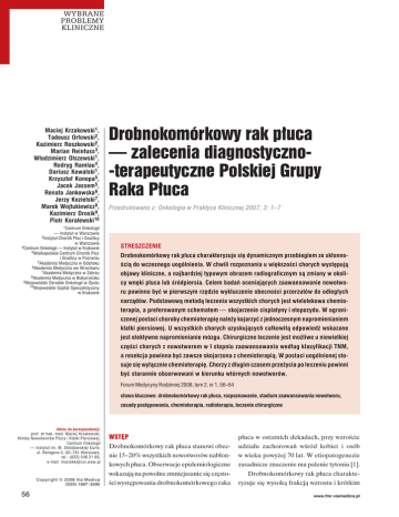 WYBRANE PROBLEMY KLINICZNE Maciej Krzakowski1, Tadeusz Orłowski2, Kazimierz Roszkowski2, Marian Reinfuss3, Włodzimierz Olszewski1, Rodryg Ramlau4, Dariusz Kowalski1, Krzysztof Konopa5, Jacek Jassem5, Renata Jankowska6, Jerzy Kozielski7, Marek Wojtukiewicz8, Kazimierz Drosik9, Piotr Koralewski10 1Centrum Onkologii — Instytut w Warszawie 2Instytut Chorób Płuc i Gruźlicy w Warszawie 3Centrum Onkologii — Instytut w Krakowie 4Wielkopolskie Centrum Chorób Płuc i Gruźlicy w Poznaniu 5Akademia Medyczna w Gdańsku 6Akademia Medyczna we Wrocławiu 7Akademia Medyczna w Zabrzu 8Akademia Medyczna w Białymstoku 9Wojewódzki Ośrodek Onkologii w Opolu 10Wojewódzki Szpital Specjalistyczny w Krakowie Drobnokomórkowy rak płuca — zalecenia diagnostyczno-terapeutyczne Polskiej Grupy Raka Płuca Przedrukowano z: Onkologia w Praktyce Klinicznej 2007; 3: 1–7 STRESZCZENIE Drobnokomórkowy rak płuca charakteryzuje się dynamicznym przebiegiem ze skłonnością do wczesnego uogólnienia. W chwili rozpoznania u większości chorych występują objawy kliniczne, a najbardziej typowym obrazem radiograficznym są zmiany w okolicy wnęki płuca lub śródpiersia. Celem badań oceniających zaawansowanie nowotworu powinno być w pierwszym rzędzie wykluczenie obecności przerzutów do odległych narządów. Podstawową metodą leczenia wszystkich chorych jest wielolekowa chemioterapia, a preferowanym schematem — skojarzenie cisplatyny i etopozydu. W ograniczonej postaci choroby chemioterapię należy kojarzyć z jednoczesnym napromienianiem klatki piersiowej. U wszystkich chorych uzyskujących całkowitą odpowiedź wskazane jest elektywne napromienianie mózgu. Chirurgiczne leczenie jest możliwe u niewielkiej części chorych z nowotworem w I stopniu zaawansowania według klasyfikacji TNM, a resekcja powinna być zawsze skojarzona z chemioterapią. W postaci uogólnionej stosuje się wyłącznie chemioterapię. Chorzy z długim czasem przeżycia po leczeniu powinni być starannie obserwowani w kierunku wtórnych nowotworów. Forum Medycyny Rodzinnej 2008, tom 2, nr 1, 56–64 słowa kluczowe: drobnokomórkowy rak płuca, rozpoznawanie, stadium zaawansowania nowotworu, zasady postępowania, chemioterapia, radioterapia, leczenie chirurgiczne Adres do korespondencji: prof. dr hab. med. Maciej Krzakowski, Klinika Nowotworów Płuca i Klatki Piersiowej, Centrum Onkologii — Instytut im. M. Skłodowskiej-Curie, ul. Rentgena 5, 02–781 Warszawa, tel.: (022) 546 21 69, e-mail: [email protected] Copyright © 2008 Via Medica ISSN 1897–3590 56 WSTĘP płuca w ostatnich dekadach, przy wzroście Drobnokomórkowy rak płuca stanowi obec- udziału zachorowań wśród kobiet i osób nie 15–20% wszystkich nowotworów nabłon- w wieku powyżej 70 lat. W etiopatogenezie kowych płuca. Obserwacje epidemiologiczne zasadnicze znaczenie ma palenie tytoniu [1]. wskazują na powolne zmniejszanie się często- Drobnokomórkowy rak płuca charakte- ści występowania drobnokomórkowego raka ryzuje się wysoką frakcją wzrostu i krótkim www.fmr.viamedica.pl Maciej Krzakowski i wsp. Drobnokomórkowy rak płuca — zalecenia diagnostyczno-terapeutyczne Polskiej Grupy Raka Płuca czasem podwojenia komórek, co klinicznie go jest możliwe zarówno na podstawie ma- przejawia się wybitną skłonnością do rozsie- teriału histologicznego (wycinek), jak i cyto- wu. Z tego powodu, u około 70% chorych logicznego (aspirat cienkoigłowy, wymaz, w chwili rozpoznania stwierdza się uogól- płyn z jamy opłucnej). nioną postać choroby (u pozostałych 30% rozpoznaje się chorobę ograniczoną) [2]. Diagnostyka różnicowa drobnokomórkowego raka płuca obejmuje inne nowotwo- Drobnokomórkowy rak płuca cechuje ry neuroendokrynne (rakowiak i rakowiak pierwotna wrażliwość na działanie leków atypowy). Ocena immunohistochemiczna cytotoksycznych i promieniowania jonizu- w kierunku neuroendokrynności w przypad- jącego, ale ze względu na wczesne występo- kach rozpoznania lub podejrzenia mikro- wanie przerzutów rokowanie jest na ogół skopowego raka drobnokomórkowego nie złe (wskaźnik 3-letniego przeżycia wynosi jest konieczna, ponieważ w 10–20% nie 12–25% w stadium choroby ograniczonej stwierdza się dodatnich odczynów immuno- i nie przekracza 2% w stadium choroby roz- histochemicznych w kierunku neuroendo- ległej) [2, 3]. krynności. W przypadkach cytologicznego Drobnokomórkowy rak płuca charakteryzuje się wysoką frakcją wzrostu i krótkim czasem podwojenia komórek, co klinicznie przejawia się wybitną skłonnością do rozsiewu rozpoznania lub podejrzenia raka drobnoPATOMORFOLOGIA komórkowego należy jednak analizować Drobnokomórkowy rak jest ściśle określo- obraz mikroskopowy łącznie z danymi kli- nym morfologicznie i biologicznie typem hi- nicznymi (np. radiograficznymi) i w przy- stologicznym raka płuca. Wraz z rakowia- padku wątpliwości powinno się dążyć do kiem, rakowiakiem atypowym i rakiem nie- pobrania wycinka do badania histologiczne- drobnokomórkowym z cechami neuroendo- go. Powtórną weryfikację mikroskopową kryności należy do grupy nowotworów neu- należy rozważyć w drobnokomórkowych ra- roendokrynnych. Z uwagi na odrębności kach płuca, w których nie występuje oczeki- epidemiologiczne, etiologiczne i biologicz- wana odpowiedź na chemioterapię [3]. ne, wymienione nowotwory nie stanowią jednej grupy w klasyfikacji Światowej Orga- OBRAZ KLINICZNY nizacji Zdrowia (WHO, World Health Orga- Drobnokomórkowy rak płuca występuje nization). najczęściej w postaci masy umiejscowionej Obowiązująca klasyfikacja WHO wyróż- przywnękowo lub w śródpiersiu. Na ogół nia typowego raka drobnokomórkowego w chwili rozpoznania obecne są objawy kli- oraz podtyp złożony (combined subtype), niczne (kaszel i duszność). Nowotwór rzad- w którym obraz histologiczny zawiera utka- ko obserwuje się w postaci pojedynczej nie zarówno raka drobnokomórkowego, jak zmian