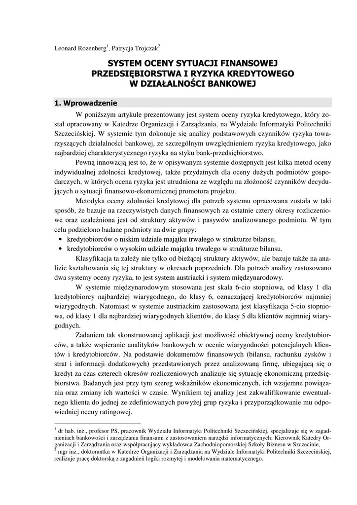 Leonard Rozenberg1, Patrycja Trojczak2 SYSTEM OCENY SYTUACJI FINANSOWEJ PRZEDSIĘBIORSTWA I RYZYKA KREDYTOWEGO W DZIAŁALNOŚCI BANKOWEJ 1. Wprowadzenie W poniższym artykule prezentowany jest system oceny ryzyka kredytowego, który został opracowany w Katedrze Organizacji i Zarządzania, na Wydziale Informatyki Politechniki Szczecińskiej. W systemie tym dokonuje się analizy podstawowych czynników ryzyka towarzyszących działalności bankowej, ze szczególnym uwzględnieniem ryzyka kredytowego, jako najbardziej charakterystycznego ryzyka na styku bank-przedsiębiorstwo. Pewną innowacją jest to, że w opisywanym systemie dostępnych jest kilka metod oceny indywidualnej zdolności kredytowej, także przydatnych dla oceny dużych podmiotów gospodarczych, w których ocena ryzyka jest utrudniona ze względu na złożoność czynników decydujących o sytuacji finansowo-ekonomicznej promotora projektu. Metodyka oceny zdolności kredytowej dla potrzeb systemu opracowana została w taki sposób, że bazuje na rzeczywistych danych finansowych za ostatnie cztery okresy rozliczeniowe oraz uzależniona jest od struktury aktywów i pasywów analizowanego podmiotu. W tym celu podzielono badane podmioty na dwie grupy: • kredytobiorców o niskim udziale majątku trwałego w strukturze bilansu, • kredytobiorców o wysokim udziale majątku trwałego w strukturze bilansu. Klasyfikacja ta zależy nie tylko od bieżącej struktury aktywów, ale bazuje także na analizie kształtowania się tej struktury w okresach poprzednich. Dla potrzeb analizy zastosowano dwa systemy oceny ryzyka, to jest system austriacki i system międzynarodowy. W systemie międzynarodowym stosowana jest skala 6-cio stopniowa, od klasy 1 dla kredytobiorcy najbardziej wiarygodnego, do klasy 6, oznaczającej kredytobiorców najmniej wiarygodnych. Natomiast w systemie austriackim zastosowana jest klasyfikacja 5-cio stopniowa, od klasy 1 dla najbardziej wiarygodnych klientów, do klasy 5 dla klientów najmniej wiarygodnych. Zadaniem tak skonstruowanej aplikacji jest możliwość obiektywnej oceny kredytobiorców, a także wspieranie analityków bankowych w ocenie wiarygodności potencjalnych klientów i kredytobiorców. Na podstawie dokumentów finansowych (bilansu, rachunku zysków i strat i informacji dodatkowych) przedstawionych przez analizowaną firmę, ubiegającą się o kredyt za czas czterech okresów rozliczeniowych analizuje się sytuację ekonomiczną przedsiębiorstwa. Badanych jest przy tym szereg wskaźników ekonomicznych, ich wzajemne powiązania oraz zmiany ich wartości w czasie. Wynikiem tej analizy jest zakwalifikowanie ewentualnego klienta do jednej ze zdefiniowanych powyżej grup ryzyka i przyporządkowanie mu odpowiedniej oceny ratingowej. 1 dr hab. inż., profesor PS, pracownik Wydziału Informatyki Politechniki Szczecińskiej, specjalizuje się w zagadnieniach bankowości i zarządzania finansami z zastosowaniem narzędzi informatycznych; Kierownik Katedry Organizacji i Zarządzania oraz współpracujący wykładowca Zachodniopomorskiej Szkoły Biznesu w Szczecinie, 2 mgr inż., doktorantka w Katedrze Organizacji i Zarządzania na Wydziale Informatyki Politechniki Szczecińskiej, realizuje pracę doktorską z zagadnień logiki rozmytej i modelowania matematycznego. 2. Metody oceny wiarygodności finansowej Ocena wiarygodności kredytowej zazwyczaj prowadzona jest w dwóch płaszczyznach, jako ocena jakościowa i ilościowa. Ponieważ ocena jakościowa jest - z oczywistych powodów oceną subiektywną, przeto niełatwo jest podać uniwersalny algorytm jej oszacowania. Inaczej jest w przypadku oceny ilościowej. Ta opiera się wyłącznie na dostarczonych dokumentach, posiada jasno określone reguły analizy i z tego powodu możliwe jest jej całkowite zautomatyzowanie i - co nie mniej ważne – daje to możliwość obiektywizacji oceny ilościowej. Obecnie istnieje wiele obiektywnych metod oceny sytuacji finansowej, opartych na analizach matematycznych danych zawartych w dokumentach finansowych. Dzięki temu możliwe jest stworzenie systemów informatycznych dla automatycznej, kompleksowej oceny standingu finansowego podmiotów gospodarczych. Bardzo często stosuje się tutaj metody statystyczne, które wykorzystują techniki ilościowe, opierające się o opracowane modele matematyczne. Metody statystyczne są coraz powszechniej stosowane z uwagi na fakt, że rozwój technik informatycznych pozwolił na proste implementowanie ich przy użyciu komputerów osobistych. Modele matematyczne, stosowane w metodach statystycznych podzielić można na parametryczne i nieparametryczne. Modele nieparametryczne nie wymagają w praktyce odnośnie relacji występujących między badanymi zmiennymi, ale wymagają zapewnienia dużego zbioru danych do badań (jest to często ograniczenie dość istotne, bowiem wiele firm w naszym kraju ma krótką historię). Modele parametryczne zaś, to modele oparte na wielowymiarowej analizie wariancyjnej, analizie dyskryminacyjnej oraz modele logitowe i probitowe. Modele nieparametryczne bazują też na sieciach neuronowych, drzewach klasyfikacyjnych oraz najbliższego sąsiedztwa. Modele logitowy i probitowy można sporządzić w wyniku następującego podejścia. Niech xi oznacza wektor wybranych cech kredytobiorcy, przy czym liczność tych cech wynosi N, czyli, że i=1,..N. Zmienna yi oznaczać będzie zdolność kredytobiorcy do wywiązywania się z umowy (w naszym przypadku kredytowej), czyli wywiązywalność. Zakładamy, że zmienna yi=1 dla przypadku, gdy pewna ukryta nieobserwowalna zmienna yi* ≥0, zaś yi =0, jeżeli zmienna nieobserwowalna yi*<0. Ponadto zachodzi zależność yi* = β’xi + εi. W przypadku modelu logitowego zaburzenie εi ma rozkład logistyczny, zaś w przypadku modelu probitowego ma ono rozkład normalny Metoda najbliższego sąsiedztwa polega z kolei na wprowadzeniu do przestrzeni cech pewnej metryki, tj. miary „odległości”. Za jej pomoc