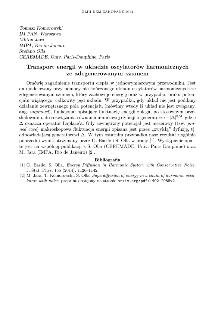 XLIII KZM ZAKOPANE 2014 Tomasz Komorowski IM PAN, Warszawa Milton Jara IMPA, Rio de Janeiro Stefano Olla CEREMADE, Univ. Paris-Dauphine, Paris Transport energii w układzie oscylatorów harmonicznych ze zdegenerowanym szumem Omówię zagadnienie transportu ciepła w jednowymiarowym przewodniku. Jest on modelowany przy pomocy nieskończonego układu oscylatorów harmonicznych ze zdegenerowanym szumem, który zachowuje energię oraz w przypadku braku potencjału wiążącego, całkowity pęd układu. W przypadku, gdy układ nie jest poddany działaniu zewnętrznego pola potencjału (mówimy wtedy iż układ nie jest związany, ang. unpinned), funkcjonał opisujący fluktuację energii zbiega, po stosownym przeskalowaniu, do rozwiązania równania ułamkowej dyfuzji o generatorze −|∆|3/4 , gdzie ∆ oznacza operator Laplace’a. Gdy zewnętrzny potencjał jest niezerowy (tzw. pinned case) makroskopowa fluktuacja energii opisana jest przez „zwykłą” dyfuzję, tj. odpowiadającą generatorowi ∆. W tym ostatnim przypadku nasz rezultat uogólnia poprzedni wynik otrzymany przez G. Basile i S. Olla w pracy [1]. Wystąpienie oparte jest na wspólnej publikacji z S. Olla (CEREMADE, Univ. Paris-Dauphine) oraz M. Jara (IMPA, Rio de Janeiro) [2]. Bibliografia [1] G. Basile, S. Olla, Energy Diffusion in Harmonic System with Conservative Noise, J. Stat. Phys. 155 (2014), 1126–1142. [2] M. Jara, T. Komorowski, S. Olla, Superdiffusion of energy in a chain of harmonic oscillators with noise, preprint dostępny na stronie arxiv.org/pdf/1402.2988v2