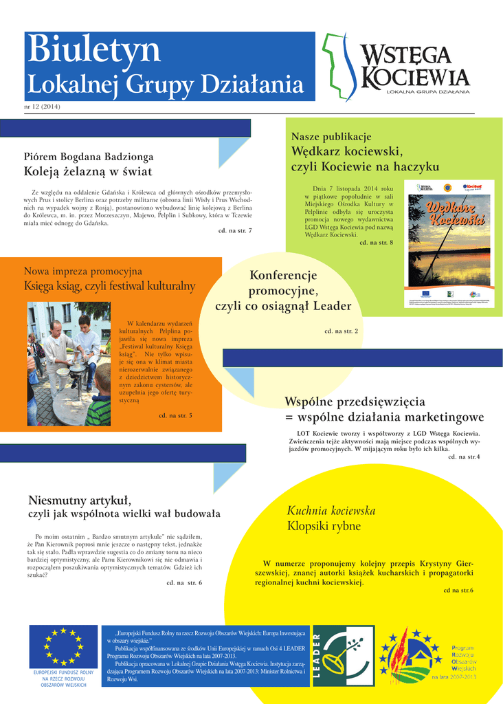 Biuletyn Lokalnej Grupy Działania nr 12 (2014) Nasze publikacje Wędkarz kociewski, czyli Kociewie na haczyku Piórem Bogdana Badzionga Koleją żelazną w świat Ze względu na oddalenie Gdańska i Królewca od głównych ośrodków przemysłowych Prus i stolicy Berlina oraz potrzeby militarne (obrona linii Wisły i Prus Wschodnich na wypadek wojny z Rosją), postanowiono wybudować linię kolejową z Berlina do Królewca, m. in. przez Morzeszczyn, Majewo, Pelplin i Subkowy, która w Tczewie miała mieć odnogę do Gdańska. cd. na str. 7 Nowa impreza promocyjna Księga ksiąg, czyli festiwal kulturalny Dnia 7 listopada 2014 roku w piątkowe popołudnie w sali Miejskiego Ośrodka Kultury w Pelplinie odbyła się uroczysta promocja nowego wydawnictwa LGD Wstęga Kociewia pod nazwą Wędkarz Kociewski. cd. na str. 8 Konferencje promocyjne, czyli co osiągnął Leader W kalendarzu wydarzeń kulturalnych Pelplina pojawiła się nowa impreza „Festiwal kulturalny Księga ksiąg”. Nie tylko wpisuje się ona w klimat miasta nierozerwalnie związanego z dziedzictwem historycznym zakonu cystersów, ale uzupełnia jego ofertę turystyczną cd. na str. 5 cd. na str. 2 Wspólne przedsięwzięcia = wspólne działania marketingowe LOT Kociewie tworzy i współtworzy z LGD Wstęga Kociewia. Zwieńczenia tejże aktywności mają miejsce podczas wspólnych wyjazdów promocyjnych. W mijającym roku było ich kilka. cd. na str.4 Niesmutny artykuł, czyli jak wspólnota wielki wał budowała Po moim ostatnim „ Bardzo smutnym artykule” nie sądziłem, że Pan Kierownik poprosi mnie jeszcze o następny tekst, jednakże tak się stało. Padła wprawdzie sugestia co do zmiany tonu na nieco bardziej optymistyczny, ale Panu Kierownikowi się nie odmawia i rozpocząłem poszukiwania optymistycznych tematów. Gdzież ich szukać? cd. na str. 6 Europejski Fundusz Rolny na rzecz rozwoju obszarów wiejskich Kuchnia kociewska Klopsiki rybne W numerze proponujemy kolejny przepis Krystyny Gierszewskiej, znanej autorki książek kucharskich i propagatorki regionalnej kuchni kociewskiej. „Europejski Fundusz Rolny na rzecz Rozwoju Obszarów Wiejskich: Europa Inwestująca w obszary wiejskie.” Publikacja współfinansowana ze środków Unii Europejskiej w ramach Osi 4 LEADER Programu Rozwoju Obszarów Wiejskich na lata 2007-2013. Publikacja opracowana w Lokalnej Grupie Działania Wstęga Kociewia. Instytucja zarządzająca Programem Rozwoju Obszarów Wiejskich na lata 2007-2013: Minister Rolnictwa i Rozwoju Wsi. cd na str.6 2 Konferencje promocyjne „Leader w praktyce” cd. ze str. 1 W październiku w każdej z gmin odbyła się konferencja promocyjna. W jej programie znalazły się wystąpienia zaproszonych gości, prezentacja dokonań Programu Leader na obszarze Powiatu Tczewskiego, prezentacja działań zrealizowanych przez beneficjentów programu (wnioskodawcy przedstawili rezultaty swoich projektów). Kierownik Biura przedstawił prezentację poświęconą działalności Biura LGD w zakresie Funkcjonowania LGD, nabywania umiejętności i aktywizacji oraz zrealizowane Projekty współpracy. Ponadto zebranym przedstawiona została informacja o programie Leader w latach 2014-2020, czyli założenia Projekty Leadera małe projekty W plenerze też kolorowo Gmina Morzeszczyn kontynuując swoją linię promocji opartą na hafcie kociewskim, zrealizowała w 2014 roku kolejny mały projekt, który ubarwi naszą przestrzeń. Projekt pn. „Zakup i udostępnianie społeczności lokalnej letniego miasteczka plenerowego w gminie Morzeszczyn - zakup namiotów wraz z wyposażeniem” został już zakończony i rozliczony. Europejski Fundusz Rolny na rzecz rozwoju obszarów wiejskich nowego okresu programowania oraz wprowadzenie do budowania Lokalnej Strategii Rozwoju na lata 20142020. Wszystkich uczestników zaproszono do wspólnego jej tworzenia oraz zgłaszania swoich pomysłów do LGD). Następnie miejsce miała krótka dyskusja, którą zakończono podsumowaniem. Spotkania odbywały się przy słodkim poczęstunku. Uczestnikami konferencji byli sympatycy programu LEADER, partnerzy fundacji, mieszkańcy obszaru wdrażania, beneficjenci oraz działacze organizacji pozarządowych. W ramach realizacji operacji zakupiono trzy namioty plenerowe – dwa małe i jeden duży, ławki oraz stoły. Celem projektu było między innymi udostępnianie zakupionego w ramach przedsięwzięcia sprzętu, a także stworzenie społeczności lokalnej możliwości uczestniczenia w wydarzeniach kulturalnych o wysokim standardzie. Mając również cały czas na uwadze promocję haftu kociewskiego, ściany namiotów zostały pokryte kolorową grafiką związaną właśnie z wzornictwem kociewskim. W sezonie letnim 2014 odbyło się na terenie gminy Morzeszczyn szereg imprez, na których wykorzystano nowy sprzęt. Całkowity koszt projektu wyniósł 20 575 zł, natomiast kwota dofinansowania to 13 360 zł. Magdalena Tkaczyk UG Morzeszczyn Departament Programów Rozwoju Obszarów Wiejskich Urz¹d Marsza³kowski Województwa Pomorskiego ul. Okopowa 21/27 80-810 Gdañsk siedziba Departamentu: ul. Augustyñskiego 2 tel. 58 326 86 50 fax 58 326 86 73 e-mail: [email protected] www.pomorskie.eu/pl/dprow 3 Wszystkim Partnerom, Sympatykom, Przyjaciołom i mieszkańcom Powiatu Tczewskiego zdrowych, pogodnych i pełnych radości Świąt Bożego Narodzenia oraz wszelkiej pomyślności w Nowym 2015 Roku życzą Zarząd i Pracownicy Biura LGD Wstęga Kociewia Gniew w programie Leader- próba podsumowania W ostatniej edycji realizacji programu Leader, poprzez zrealizowane działania w gminie Gniew, zauważyć można skuteczną aktywizację społeczności wiejskich. Dzięki programowi Leader Gmina Gniew w latach 2009 – 2014 pozyskała łącznie 821.838, 17 złotych na realizację różnych przedsięwzięć i inwestycji. Wiele prac poczyniono na rzecz świetlic wiejskich. Do takich inwestycji, zaliczyć można np. kompleksową modernizację świetlicy wiejsk