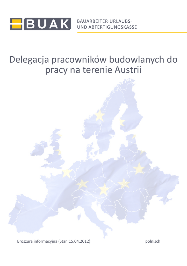 Delegacja pracowników budowlanych do pracy na terenie Austrii Broszura informacyjna (Stan 15.04.2012)polnisch Delegacja do pracy na terenie Austrii PODSTAWY SYSTEMU URLOPOWEGO W AUSTRIA CKIEJ BRANŻY BUDOWLANEJ Z uwagi na specyfikę branży budowlanej, charakteryzującej się częstymi zmianami pracodawcy jak również częstymi przerwami w zatrudnieniu, austriackie prawo przewiduje szczególne regulacje urlopowe dla pracowników budowlanych, które zostały określone w ustawie o prawie urlopowym pracowników budowlanych (BUAG). Celem ustawy jest ochrona prawa do urlopu wypoczynkowego i zagwarantowanie pełnego wymiaru urlopu, pomimo przerw w zatrudnieniu. Realizacji tego celu służy wprowadzenie postępowania urlopowego, zarządzanego przez austriacką Kasę Urlopową Parcowników Budowlanych (BUAK), w ramach którego pracodawca odprowadza do BUAK miesięczną składkę urlopową na poczet przyszłego roszczenia urlopowego pracownika. Kasa Urlopowa Pracowniów Budowlanych (BUAK) jest organizacją prawa publicznego, mającą za zadanie wprowadzenie w życie i egzekwowanie przepisów ustawy o BUAG oraz organizaję procesów administracyjnych związanych z naliczaniem składek i wypłatą roszczeń urlopowych. Niniejsza broszura służy przybliżeniu zasad postępowania urlopowego w przypadku tymczasowej delegacji pracowników do pracy na terenie Austrii. w w w . b u a k . a t 2 Delegacja do pracy na terenie Austrii INFORMACJE OGÓLNE Pracownicy zatrudnieni przez przedsiębiorstwo lub agencję pracy tymczasowej z siedzibą poza granicami Austrii i oddelegowani przez zatrudniającego ich pracodawcę do wykonania prac budowlanych na terenie Austrii zostają objęci regulacjami postępowania urlopowego w rozumieniu ustawy o prawie urlopowym pracowników budowlanych (BUAG) prowadzonego przez BUAK. Do delegacji pracowników w rozumieniu ustawy o BUAG dochodzi wówczas, gdy spełnione są natępujące warunki: Przedsiębiortwo w ramach trwajacego stosunku pracy oddelegowuje pracownika, zatrudnionego poza granicami Austrii, na okres maksy malnie 12-tu miesięcy (jednorazowe przedłużenie o kolejne 12 miesięcy z powodu nieprzewidzianych okoliczności jest dopuszczalne) do wykonania prac budowlanych w rozumieniu ustawy o BUAG na terenie Austrii. Postępowaniu urlopowemu prowadzonemu przez BUAK podlegają również pracownicy, którzy byli dotychczas zatrudnieni na terenie Austrii, i zostali zatrudnieni przez nowego pracodawcę, którego siedziba mieści się poza granicami Austrii. Rodzaj pracy wykonywanej przez delegowanego pracownika jest czynnikem decyduącym o obowiązku stosowania w jego przypadku postępowania urlopowego zgodnie z zakresem obowiązywania ustawy o BUAG. W przypadku, kiedy delegowany pracownik wykonuje zarówno prace budowlane objęte ustawą o BUAG, jak również takie, których ustawa nie obejmuje, czynnikiem decydującym o stosowaniu postępowania urlopowego jest przewaga godzin pracy, w czasie których wykonywane były prace budowlane w rozumieniu przepisów ustawy o BUAG. Jeśli opisane powyżej warunki zostają spełnione w przypadku oddelegowanego pracownika budowlanego, to w czasie całego okresu trwania delegacji do Austrii podlega on austriackiemu prawu urlopowemu, a tymsamym ustawie o BUAG, niezależnie od pozostałych obowiązujacych przepisów prawa krajowego czy unijnego. w w w . b u a k . a t 3 Delegacja do pracy na terenie Austrii W rezultacie pracodawcy delegujący pracowników do Austrii są w czasie całego okresu trwania delegacji zobowiązani do odprowadzania do BUAK składki urlopowej. Obowiązkowi odprowadzania składek urlopowych podlega pracodawca od pierwszego dnia delegacji danego pracownika. Odprowadzane składki dotyczą wyłącznie zakresu świadczeń urlopowych i zapewniają pracownikowi prawo do ubiegania się o wypłatę roszczenia urlopowego bezpośrednio z BUAK. OBOWIĄZEK ZGŁOSZENIA DELEGACJI Pracodawca podlega prawnemu obowiązkowi zgłoszenia do BUAK delegacji swoich pracowników do pracy w austriackiej branży buowlanej. W tym celu zostały przygotowane przez BUAK odpowiednie formularze zgłoszeniowe, które udostępnione są na naszej stronie internetowej www.buak.at/Europaverfahern. Pierwszy formularz (Erstmeldung gemäß § 33g BUAG Teil I: Informationen zum/zur ArbeitgeberIn) służy do podania danych dotyczących firmy delegującej pracowników, natomiast drugi (Erstmeldung gemäß § 33g BUAG Teil II: Informationen zum/zur ArbeitnehmerIn) do podania danych dotyczących pracownika. Zgłoszenie należy przesłać do BUAK w przeciągu 14-tu dni od rozpoczęcia prac budowlanych w rozumieniu ustawy o BUAG, jednak jest to konieczne tylko w przypadku, kiedy zgłoszenie planowanego oddelegowania pracowników nie zostało już złożone do Centralnego Organu Kontroli Zatrudnienia przy Ministerstwie Finansów (Zentrale Koordinationsstelle des Bundesministeriums für Finanzen für die Kontrolle illegaler Beschäftigung – ZKO). Jeśli delegacja przekracza miesięczny okres trwania, firma jest zobowiązana do przesyłania do BUAK do 15-tego dnia następnego miesiąca comiesięcznego zgłoszenia dotyczącego czasu pracy w Austrii oddelegowanych pracowników w minionym miesiącu. Do Centralnego Organu Kontroli Zatrudnienia (ZKO) pracodawca winien przesłać każde zgłoszenie delegacji pracowników do pracy na terenie Austrii najpóźniej na tydzień przed rozpoczęciem prac. Zgłoszenia dotyczące prac budowlanych zostają przekazane dalej do BUAK i są równoznaczne z oddaniem formularza zgłoszeniowego BUAK. w w w . b u a k . a t 4 Delegacja do pracy na terenie Austrii NALICZANIE I ODPROWADZANIE SKŁADEK Pracodawca jest zobowiązany do odprowadzania za każdy dzień pracy składek urlopowych. Składki odprowadzane są na poczet przysługującego pracownikowi w przyszłości roszczenia urlopwego. Faktorami warunkującymi wysokość odprowadzanej składki są rodzaj wykonywanej przez danego pracownika pracy i wysokość stawki godzinowej. 