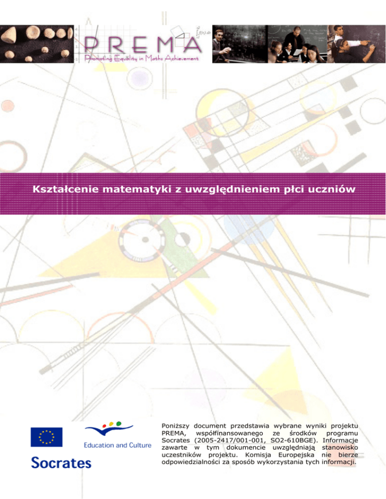 E Kształcenie matematyki z uwzględnieniem płci uczniów Poniższy document przedstawia wybrane wyniki projektu PREMA, współfinansowanego ze środków programu Socrates (2005-2417/001-001, SO2-610BGE). Informacje zawarte w tym dokumencie uwzględniają stanowisko uczestników projektu. Komisja Europejska nie bierze odpowiedzialności za sposób wykorzystania tych informacji. Wprowadzenie Osiągnięcie celów strategii lizbońskiej, ustalonych przez Unię Europejską w Marcu 2000 roku jest uzależnione od stopnia, w jakim Europa będzie w stanie wykorzystać posiadane zasoby ludzkie oraz bogate dziedzictwo społeczne i kulturowe. Jednym z istotnych problemów obserwowanych obecnie, także w wymiarze światowym jest niska reprezentacja kobiet w stosunku do mężczyzn w obszarze nauk ścisłych oraz inżynieryjnych. Są to obszary, które nie tylko wpływają istotnie na rozwój gospodarki, ale również pełnią istotną rolę w rozwiązywaniu istotnych problemów społecznych. Niska reprezentacja kobiet w dziedzinach o istotnym znaczeniu ekonomicznym, w tym ich niska reprezentacja w obszarze nauk ścisłych i inżynieryjnych, nauczanie matematyki oraz niższe wyniki osiągane przez kobiety niż mężczyzn w tym zakresie stanowią istotne problemy współczesnej Europy. Także w Stanach Zjednoczonych trwa debata w ramach programu „najbardziej konkurencyjna gospodarka” nad poprawą wyników osiąganych z matematyki przez uczniów. Prezydenci trzech czołowych uniwersytetów (Stanford, MIT, Princeton) w ostatnim okresie opublikowali wspólnie artykuł w którym stwierdzają „Nasz kraj [USA] zmaga się z rosnącą konkurencją z zagranicy w obszarze innowacji technologicznych … w tym samym momencie wyniki osiągane przez studentów oraz uczniów w obszarze matematyki oraz innych pokrewnych przedmiotów pozostają poniżej poziomu osiąganego w wielu innych krajach. Biorąc to pod uwagę, jest niezbędnym podjęcie kroków mających na celu odkrywanie uzdolnionych zarówno kobiet jak i mężczyzn w tym zakresie. Dopóty kobiety nie są równie obecne w obszarze matematyki, nauk ścisłych i inżynieryjnych, dopóty nasz kraj [USA] będzie stanowił mniejszą wartość jak całość, niż suma poszczególnych elementów … „ (Stanford Report, 11 luty 2005, str. 1). W Europie już od pojawienia się raportu Bergeman’a ten temat został uznany również za problematyczny oraz stanowi temat aktualnych rozmów. Stereotypy związane z ofertą programów studiów, podręczniki oraz postawa nauczycieli wobec uczniów wpływają w sposób istotny na ich wybory edukacyjne i zawodowe. Wiele obszarów jest wciąż związanych z jedną płcią. Dla przykładu w Europie kobiety chętniej wybierają, jako kierunek studiów nauki humanistyczne, artystyczne lub medycynę, podczas gdy mężczyźni wybierają kierunki inżynieryjne, matematykę, informatyczne lub nauki ścisłe. Relatywnie nowe kierunki związane z obszarem technologii informacyjnych (które to zwykle wymagają dobrej znajomości matematyki) pogłębiają dystans dzielący znaczenie mężczyzn i kobiet w tym obszarze. Obecnie kobiety mają mniejsze szanse na zatrudnienie w obszarze technologii informacyjnych. Ponadto uważa się, że mają niższe umiejętności obsługi sprzętu komputerowego i oprogramowania niż mężczyźni. (…) Dysproporcje pomiędzy kobietami a mężczyznami w obszarze technologii informacyjnych są wciąż w dużej mierze słabo poznanym zagadnieniem i wymagają dalszych badań w relacji do wyników osiąganych z matematyki (UNECE’s Gender Statistics Website for Europe & North America). Optymistycznym akcentem jest fakt, że następuje powolna poprawa sytuacji w ostatnich latach. Szczególnie w USA, kiedy to odsetek kobiet w stosunku do wszystkich osób uzyskujących tytuł doktora wzrósł z 0,3% w roku 1966 do 16,9% w roku 2002. W Europie, na stronach poświęconych Kobietom w nauce (Komisja Europejska) można odnaleźć stwierdzenia, że pomimo faktu że procentowo więcej kobiet obecnie uzyskuje wykształcenie wyższe w wieku do 30 lat, to są one nie dość liczne w obszarach związanych z nauką oraz stanowiskach decyzyjnych w tym zakresie. Można tą sytuację rozpatrywać jako zarówno stratę cennych zasobów ludzkich, jak również przeszkodę dla rozwoju nauk w Europie jako całość. Przewaga mężczyzn nad kobietami w obszarze edukacji matematycznej zarysowuje się szczególnie w wieku 16 do 19 lat (Boaler, 2000). Kolejnym aktualnym problemem dotykającym znaczną część mieszkańców Europy jest zjawisko określane anglojęzycznym terminem digital divide. Termin oznacza dysproporcje w zakresie stopnia znajomości i korzystania z komputerów, nowoczesnego sprzętu elektronicznego oraz stosownego oprogramowania. Dokument Challenge of the Digital Divide formułuje ten problem w sposób następujący „Zanim zaczniemy rozmawiać o problematyce gender gap, musimy zrozumieć jego przyczyny. Dysproporcja pomiędzy kobietami a mężczyznami (ang. gender gap) w obszarze społeczeństwa informacyjnego wynika z tradycyjnie definiowanych ról poszczególnych płci oraz zwykle z nieświadomych zachowań i postaw promowanych w szkołach. Uprzedzenia ze względu na płeć w zakresie stylu uczenia, przekazywanych stereotypów w koedukacyjnych klasach, treści niektórych podręczników utrudniają wkroczenie kobietom w świat matematyki i technologii. Niedobór kobiet w obszarze nauk komputerowych ma swoje korzenie w starym, zaniedbywanym problemie związanym z wykluczeniem kobiet w edukacji, zwłaszcza w obszarze matematyki i nauk ścisłych. Z tego względu powołana została fundacja celem poprawy sytuacji w przyszłości”: http://www.global-society-dialogue.org. Niektórzy specjaliści twierdzą, że jedną z przyczyn problemu są relatywnie niższe oceny z matematyki osiągane przez dziewczynki w trakcie różnych testów „Kobiety nieustannie osiągają niższe rezultaty niż mężczyźni na