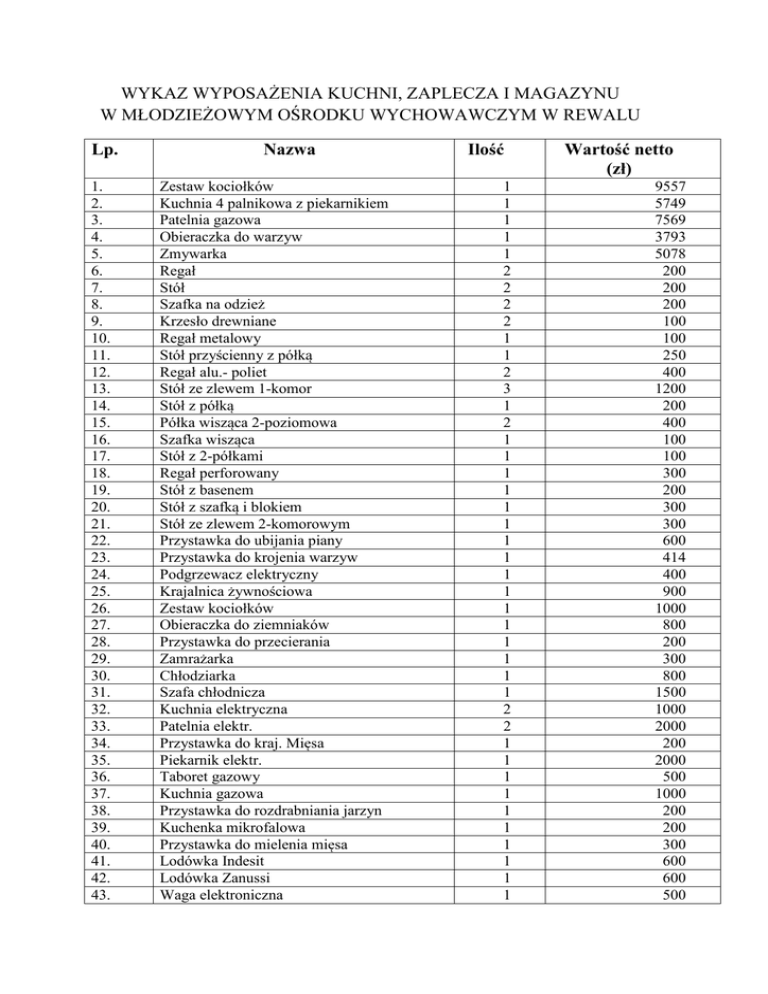 WYKAZ WYPOSAŻENIA KUCHNI, ZAPLECZA I MAGAZYNU W MŁODZIEŻOWYM OŚRODKU WYCHOWAWCZYM W REWALU Lp. 1. 2. 3. 4. 5. 6. 7. 8. 9. 10. 11. 12. 13. 14. 15. 16. 17. 18. 19. 20. 21. 22. 23. 24. 25. 26. 27. 28. 29. 30. 31. 32. 33. 34. 35. 36. 37. 38. 39. 40. 41. 42. 43. Nazwa Zestaw kociołków Kuchnia 4 palnikowa z piekarnikiem Patelnia gazowa Obieraczka do warzyw Zmywarka Regał Stół Szafka na odzież Krzesło drewniane Regał metalowy Stół przyścienny z półką Regał alu.- poliet Stół ze zlewem 1-komor Stół z półką Półka wisząca 2-poziomowa Szafka wisząca Stół z 2-półkami Regał perforowany Stół z basenem Stół z szafką i blokiem Stół ze zlewem 2-komorowym Przystawka do ubijania piany Przystawka do krojenia warzyw Podgrzewacz elektryczny Krajalnica żywnościowa Zestaw kociołków Obieraczka do ziemniaków Przystawka do przecierania Zamrażarka Chłodziarka Szafa chłodnicza Kuchnia elektryczna Patelnia elektr. Przystawka do kraj. Mięsa Piekarnik elektr. Taboret gazowy Kuchnia gazowa Przystawka do rozdrabniania jarzyn Kuchenka mikrofalowa Przystawka do mielenia mięsa Lodówka Indesit Lodówka Zanussi Waga elektroniczna Ilość 1 1 1 1 1 2 2 2 2 1 1 2 3 1 2 1 1 1 1 1 1 1 1 1 1 1 1 1 1 1 1 2 2 1 1 1 1 1 1 1 1 1 1 Wartość netto (zł) 9557 5749 7569 3793 5078 200 200 200 100 100 250 400 1200 200 400 100 100 300 200 300 300 600 414 400 900 1000 800 200 300 800 1500 1000 2000 200 2000 500 1000 200 200 300 600 600 500 44. 45. 46. 47. 48. 49. 50. 51. 52. 53. 54. 55. 56. 57. 58. 59. 60. 61. 62. 63. 64. 65. 66. 67. Napęd + stojak Przystawka do tarcia sera Taborek grzewczy gaz Przystawka do ostrzenia Kloc do mięsa Stół z blatem Paleta PCV Basen 2-komorowy Separator skrobi Podstawa do zmywarki Uzdatniacz do wody Regały magazynowe Szafka Stół ze zlewem 1 komor. Regał alu - polietyl Krzesło drewniane Biurko Zamrażarka Zamrażarka Zanussi Lodówka na jaja Naświetlacz do jaj Lodówka Waga dziesiętna Kosz nierdzewny Spis zakończono na poz. 67. 1 1 2 1 1 1 3 1 1 1 1 1 1 3 4 1 1 4 1 1 1 3 1 1 500 100 3000 100 100 300 600 1500 500 300 200 200 100 3000 800 100 100 2000 1000 500 700 1500 100 100