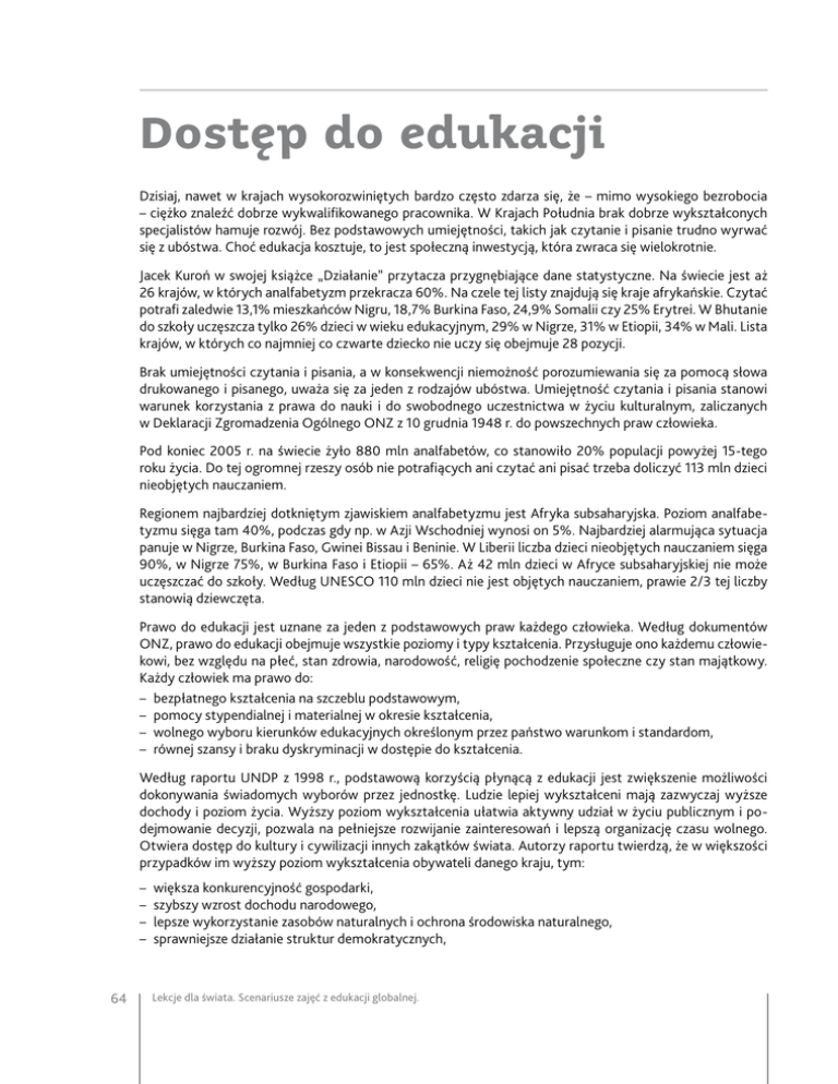Dostęp do edukacji Dzisiaj, nawet w krajach wysokorozwiniętych bardzo często zdarza się, że – mimo wysokiego bezrobocia – ciężko znaleźć dobrze wykwalifikowanego pracownika. W Krajach Południa brak dobrze wykształconych specjalistów hamuje rozwój. Bez podstawowych umiejętności, takich jak czytanie i pisanie trudno wyrwać się z ubóstwa. Choć edukacja kosztuje, to jest społeczną inwestycją, która zwraca się wielokrotnie. Jacek Kuroń w swojej książce „Działanie” przytacza przygnębiające dane statystyczne. Na świecie jest aż 26 krajów, w których analfabetyzm przekracza 60%. Na czele tej listy znajdują się kraje afrykańskie. Czytać potrafi zaledwie 13,1% mieszkańców Nigru, 18,7% Burkina Faso, 24,9% Somalii czy 25% Erytrei. W Bhutanie do szkoły uczęszcza tylko 26% dzieci w wieku edukacyjnym, 29% w Nigrze, 31% w Etiopii, 34% w Mali. Lista krajów, w których co najmniej co czwarte dziecko nie uczy się obejmuje 28 pozycji. Brak umiejętności czytania i pisania, a w konsekwencji niemożność porozumiewania się za pomocą słowa drukowanego i pisanego, uważa się za jeden z rodzajów ubóstwa. Umiejętność czytania i pisania stanowi warunek korzystania z prawa do nauki i do swobodnego uczestnictwa w życiu kulturalnym, zaliczanych w Deklaracji Zgromadzenia Ogólnego ONZ z 10 grudnia 1948 r. do powszechnych praw człowieka. Pod koniec 2005 r. na świecie żyło 880 mln analfabetów, co stanowiło 20% populacji powyżej 15-tego roku życia. Do tej ogromnej rzeszy osób nie potrafiących ani czytać ani pisać trzeba doliczyć 113 mln dzieci nieobjętych nauczaniem. Regionem najbardziej dotkniętym zjawiskiem analfabetyzmu jest Afryka subsaharyjska. Poziom analfabetyzmu sięga tam 40%, podczas gdy np. w Azji Wschodniej wynosi on 5%. Najbardziej alarmująca sytuacja panuje w Nigrze, Burkina Faso, Gwinei Bissau i Beninie. W Liberii liczba dzieci nieobjętych nauczaniem sięga 90%, w Nigrze 75%, w Burkina Faso i Etiopii – 65%. Aż 42 mln dzieci w Afryce subsaharyjskiej nie może uczęszczać do szkoły. Według UNESCO 110 mln dzieci nie jest objętych nauczaniem, prawie 2/3 tej liczby stanowią dziewczęta. Prawo do edukacji jest uznane za jeden z podstawowych praw każdego człowieka. Według dokumentów ONZ, prawo do edukacji obejmuje wszystkie poziomy i typy kształcenia. Przysługuje ono każdemu człowiekowi, bez względu na płeć, stan zdrowia, narodowość, religię pochodzenie społeczne czy stan majątkowy. Każdy człowiek ma prawo do: – bezpłatnego kształcenia na szczeblu podstawowym, – pomocy stypendialnej i materialnej w okresie kształcenia, – wolnego wyboru kierunków edukacyjnych określonym przez państwo warunkom i standardom, – równej szansy i braku dyskryminacji w dostępie do kształcenia. Według raportu UNDP z 1998 r., podstawową korzyścią płynącą z edukacji jest zwiększenie możliwości dokonywania świadomych wyborów przez jednostkę. Ludzie lepiej wykształceni mają zazwyczaj wyższe dochody i poziom życia. Wyższy poziom wykształcenia ułatwia aktywny udział w życiu publicznym i podejmowanie decyzji, pozwala na pełniejsze rozwijanie zainteresowań i lepszą organizację czasu wolnego. Otwiera dostęp do kultury i cywilizacji innych zakątków świata. Autorzy raportu twierdzą, że w większości przypadków im wyższy poziom wykształcenia obywateli danego kraju, tym: – większa konkurencyjność gospodarki, – szybszy wzrost dochodu narodowego, – lepsze wykorzystanie zasobów naturalnych i ochrona środowiska naturalnego, – sprawniejsze działanie struktur demokratycznych, 64 Lekcje dla świata. Scenariusze zajęć z edukacji globalnej. – większy ład i bezpieczeństwo społeczne, – większy spadek bezrobocia, – mniejsze obszary ubóstwa i marginesu społecznego, – większa przeciętna długość życia. Korzyści z inwestycji w kształcenie czerpie cała gospodarka narodowa, ponieważ edukacja przyczynia się do większej aktywności mieszkańców danego kraju. Sytuacja w Afganistanie Każde dziecko ma prawo się uczyć. Tymczasem wiele z nich nie może z tego prawa skorzystać – obecnie na całym świecie 93 milionów dzieci w wieku szkolnym nie ma takiej możliwości. W rezultacie ponad 780 milionów dorosłych nie potrafi czytać i pisać. Polska Akcja Humanitarna (PAH) od kilku lat realizuje projekty, których celem jest dawanie szansy na edukację dzieciom w najbiedniejszych krajach świata. Wynika to z silnego przekonania, że właśnie edukacja jest jednym ze sposobów ograniczania skrajnego ubóstwa. W ramach tych działań PAH odbudowuje szkoły, dystrybuuje wyprawki szkolne, organizuje zajęcia pozwalające zdobyć lub rozwinąć umiejętności zawodowe. W styczniu 2008 Ministerstwo Edukacji Afganistanu opublikowało raport z badania przeprowadzonego w 2007 roku. Wyniki pokazują skalę problemu dostępu do edukacji w tym kraju i ogromne wyzwanie, przed jakim stoi społeczność międzynarodowa, która stara się ten problem rozwiązać. Tylko 60% dzieci (6 milionów) w wieku kwalifikującym do szkoły podstawowej było zapisanych na zajęcia. 1/10 z nich nie było na zajęciach gdy przeprowadzano badanie. 15% w ogóle nie chodziło na zajęcia od początku roku szkolnego. W niektórych prowincjach na zajęciach obecnych było mniej niż 65% zapisanych do szkoły uczniów. W efekcie prawie 22% nie kwalifikuje się na końcowe egzaminy z powodu braków w obecnościach. 2/3 zapisanych uczniów to chłopcy. Dziewczynek jest coraz mniej w starszych klasach – w pierwszej prawie 40% to dziewczynki, w ostatnich klasach – już tylko 25%. Tylko ok. 27% nauczycieli to kobiety. Utrudnia to tworzenie klas tylko dla dziewczynek – a tego potrzebują niektóre, konserwatywne społeczności lokalne. Na jedną szkolną salę przypada w Afganistanie średnio 135 zapisanych uczniów. W niektórych prowincjach wskaźnik ten sięga 300 dzieci. W całym kraju więcej jest szkó