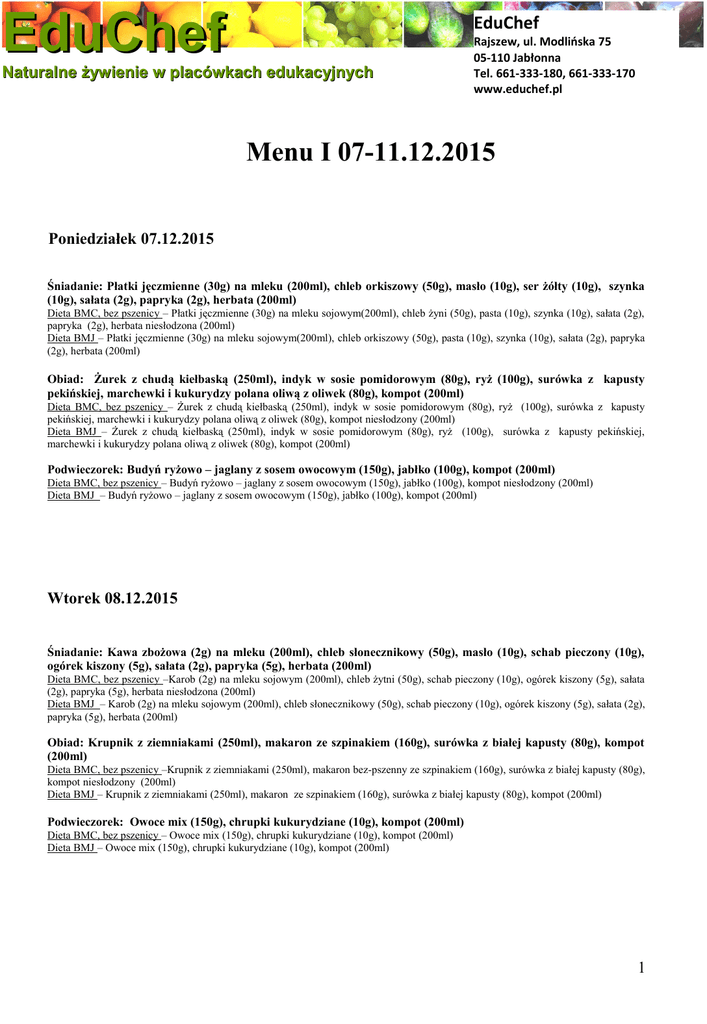 EduChef EduChef Naturalne żywienie w placówkach edukacyjnych Rajszew, ul. Modlińska 75 05-110 Jabłonna Tel. 661-333-180, 661-333-170 www.educhef.pl Menu I 07-11.12.2015 Poniedziałek 07.12.2015 Śniadanie: Płatki jęczmienne (30g) na mleku (200ml), chleb orkiszowy (50g), masło (10g), ser żółty (10g), szynka (10g), sałata (2g), papryka (2g), herbata (200ml) Dieta BMC, bez pszenicy – Płatki jęczmienne (30g) na mleku sojowym(200ml), chleb żyni (50g), pasta (10g), szynka (10g), sałata (2g), papryka (2g), herbata niesłodzona (200ml) Dieta BMJ – Płatki jęczmienne (30g) na mleku sojowym(200ml), chleb orkiszowy (50g), pasta (10g), szynka (10g), sałata (2g), papryka (2g), herbata (200ml) Obiad: Żurek z chudą kiełbaską (250ml), indyk w sosie pomidorowym (80g), ryż (100g), surówka z kapusty pekińskiej, marchewki i kukurydzy polana oliwą z oliwek (80g), kompot (200ml) Dieta BMC, bez pszenicy – Żurek z chudą kiełbaską (250ml), indyk w sosie pomidorowym (80g), ryż (100g), surówka z kapusty pekińskiej, marchewki i kukurydzy polana oliwą z oliwek (80g), kompot niesłodzony (200ml) Dieta BMJ – Żurek z chudą kiełbaską (250ml), indyk w sosie pomidorowym (80g), ryż (100g), surówka z kapusty pekińskiej, marchewki i kukurydzy polana oliwą z oliwek (80g), kompot (200ml) Podwieczorek: Budyń ryżowo – jaglany z sosem owocowym (150g), jabłko (100g), kompot (200ml) Dieta BMC, bez pszenicy – Budyń ryżowo – jaglany z sosem owocowym (150g), jabłko (100g), kompot niesłodzony (200ml) Dieta BMJ – Budyń ryżowo – jaglany z sosem owocowym (150g), jabłko (100g), kompot (200ml) Wtorek 08.12.2015 Śniadanie: Kawa zbożowa (2g) na mleku (200ml), chleb słonecznikowy (50g), masło (10g), schab pieczony (10g), ogórek kiszony (5g), sałata (2g), papryka (5g), herbata (200ml) Dieta BMC, bez pszenicy –Karob (2g) na mleku sojowym (200ml), chleb żytni (50g), schab pieczony (10g), ogórek kiszony (5g), sałata (2g), papryka (5g), herbata niesłodzona (200ml) Dieta BMJ – Karob (2g) na mleku sojowym (200ml), chleb słonecznikowy (50g), schab pieczony (10g), ogórek kiszony (5g), sałata (2g), papryka (5g), herbata (200ml) Obiad: Krupnik z ziemniakami (250ml), makaron ze szpinakiem (160g), surówka z białej kapusty (80g), kompot (200ml) Dieta BMC, bez pszenicy –Krupnik z ziemniakami (250ml), makaron bez-pszenny ze szpinakiem (160g), surówka z białej kapusty (80g), kompot niesłodzony (200ml) Dieta BMJ – Krupnik z ziemniakami (250ml), makaron ze szpinakiem (160g), surówka z białej kapusty (80g), kompot (200ml) Podwieczorek: Owoce mix (150g), chrupki kukurydziane (10g), kompot (200ml) Dieta BMC, bez pszenicy – Owoce mix (150g), chrupki kukurydziane (10g), kompot (200ml) Dieta BMJ – Owoce mix (150g), chrupki kukurydziane (10g), kompot (200ml) 1 EduChef Naturalne żywienie w placówkach edukacyjnych EduChef Rajszew, ul. Modlińska 75 05-110 Jabłonna Tel. 661-333-180, 661-333-170 www.educhef.pl Środa 09.12.2015 Śniadanie: Płatki ryżowe z rodzynkami i cynamonem (30g) z mlekiem (200ml), chleb żytni (50g), masło (10g), pasta z zielonej soczewicy (10g), szynka drobiowa (10g), ogórek świeży (5g), sałata (2g), herbata (200ml) Dieta BMC, bez pszenicy – Płatki ryżowe z rodzynkami i cynamonem (30g) z mlekiem sojowym (200ml), chleb żytni (50g), pasta z zielonej soczewicy (10g), szynka (10g), ogórek świeży (5g), sałata (2g), herbata niesłodzona (200ml) Dieta BMJ – Płatki ryżowe z rodzynkami i cynamonem (30g) z mlekiem sojowym (200ml), chleb żytni (50g), pasta z zielonej soczewicy (10g), szynka drobiowa (10g), ogórek świeży (5g), sałata (2g), herbata (200ml) Obiad: Zupa kalafiorowa z ziemniakami (250ml), pulpety wieprzowe w sosie koperkowym (80g), mix kasz (100g), surówka z czerwonej kapusty (80g), kompot (200ml) Dieta BMC, bez pszenicy – Zupa kalafiorowa nie-zabielana z ziemniakami (250ml), pulpety wieprzowe w sosie koperkowym (80g), mix kasz (100g), surówka z czerwonej kapusty (80g), kompot niesłodzony (200ml) Dieta BMJ – Zupa kalafiorowa nie-zabielana z ziemniakami (250ml), pulpety wieprzowe w sosie koperkowym (80g), mix kasz (100g), surówka z czerwonej kapusty (80g), kompot (200ml) Podwieczorek: Galaretka na soku z owoców (150g), owoce mix (100g), herbata ziołowa (200ml) Dieta BMC, bez pszenicy – Galaretka na soku z owoców (150g), owoce mix (100g), herbata ziołowa (200ml) Dieta BMJ – Galaretka na soku z owoców (150g), owoce mix (100g), herbata ziołowa (200ml) Czwartek 10.12.2015 Śniadanie: Musli z quinoa (30g) na mleku (200ml), chleb razowy (50g), masło (10g), pasztet EduChefa (10g), papryka (5g), pomidor (5g), herbata (200ml) Dieta BMC, bez pszenicy – Płatki kukurydziane (30g) na mleku sojowym (200ml), chleb żytni (50g), pasztet EduChefa (10g), papryka (5g), pomidor (5g), herbata niesłodzona (200ml) Dieta BMJ – Musli z quinoa (30g) na mleku sojowym (200ml), chleb razowy (50g), pasztet EduChefa (10g), papryka (5g), pomidor (5g), herbata (200ml) Obiad: Krem z zielonych warzyw z grzankami razowymi (250ml), racuchy z serem i jabłkami (160g), marchewka z jabłuszkiem (80g), kompot (200ml) Dieta BMC, bez pszenicy – Krem z zielonych warzyw z grzankami razowymi (250ml), bez-mleczne, bez-pszenne racuchy z jabłkami (160g), marchewka z jabłuszkiem (80g), kompot niesłodzony (200ml) Dieta BMJ – Krem z zielonych warzyw z grzankami razowymi (250ml), bez-mleczne, bez-jajeczne racuchy z jabłkami (160g), marchewka z jabłuszkiem (80g), kompot (200ml) Podwieczorek: Grahamka (50g) twarożek z rzodkiewką i szczypiorkiem (10g), kompot (200ml) Dieta BMC, bez pszenicy – Chleb żytni (50g) pasta warzywna (10g), kompot niesłodzony (200ml) Dieta BMJ – Grahamka (50g) pasta warzywna (10g), kompot (200ml) 2 EduChef Naturalne żywienie w placówkach edukacyjnych EduChef Rajszew, ul. Modlińska 75 05-110 Jabłonna Tel. 661-333-180, 661-333-170 www.educhef.pl Piątek 11.12.2015 Śniadanie: Kakao (2g) na mleku (200ml), bułka