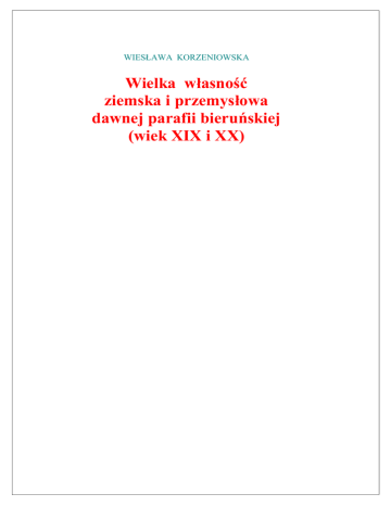 WIES„ AWA KORZENIOWSKA Wielka wśasnosc ziemska i przemysśowa dawnej parafii bierunskiej (wiek XIX i XX) ł Wielka wśasnoscziemska i przemysśowa ...ó WSTE P ___________________________________________________________________3 Rozdzia I _________________________________________________________________4 STRUKTURA WIELKIEJ WŚ ASNOS CI I STAN POSIADANIA - DO ROKU 1922 _____ 4 1. Ogo lna charakterystyka wielkiej wśasnosci; Stosunki wśasnosciowe ____________________________ 4 2. Gospodarka w wieku XIX i w poczatkach XX ________________________________ ____________ 11 2.1. Gospodarka rolna, hodowlana, przetwo rcza, lesna i stawowa. ____________________________ 12 2.2. Poczatki i rozwo j gospodarki kapitalistycznej ________________________________ _________ 17 Rozdzia II _______________________________________________________________ 21 STRUKTURA WIELKIEJ WŚ ASNOS CI, STAN POSIADANIA I GOSPODARKA W DWUDZIESTOLECIU MIEDZYWOJENNYM ____________________________________ 21 1. Sytuacja polityczna i gospodarcza po roku 1922 ________________________________ ___________ 21 2. Struktura wielkiej wśasnosci i stan posiadania. ________________________________ ____________ 24 3. Gospodarka rolna, hodowlana i przetwo rcza ________________________________ ____________ 29 Rozdzia III_______________________________________________________________ 31 STYL Z YCIA _________________________________________________________________ 31 UWAGI KON COWE __________________________________________________________ 33 Wiesśawa Korzeniowska 2 ł Wielka wśasnoscziemska i przemysśowa ...ó WSTE P Likwidacja wielkiej wśasnosci ziemskiej i przemysśowej ń po roku 1945 w pan stwach podporzadkowanych wpśywom ZSRR zerwaśa ogniwo stanowiace od wieko w istotny element przemian gospodarczych i spośecznych ń zaro wno w dziejach powszechnych, jak i w historii poszczego lnych pan stw. Analiza tych dziejo w uczy, ze warstwa ta zawsze byśa organiczna czescia narodu, a jej zlikwidowanie postrzegac mozna jako zadanie rany caśemu narodowi. Juz w dwudziestoleciu wojennym Oskar Spengler przestrzegaś przed tym piszac: ł Armie rozbita (...) mozna odbudowac, utracona pozycje wsro d poteg mozna znowu odzyskac, ale wewnetrznie okaleczone ciaśo narodu bardzo trudno uzdrowic(...)1 Faktem jest, ze na tle pozostaśych ziem polskich wielka wśasnosc go rnoslaska, postrzegana byśa przez ostatnie po świecze nie jako niezbedna czescspośeczen stwa, ale jako niepotrzebny balast na jego organizmie. I o ile, wielkiej wśasnosci ziemskiej czy przemysśowej pozostaśych regiono w Polski zarzucano jedynie wrogosc klasowa i ł obszarnictwoó , to na Go rnym Slasku zaliczona zostaśa ona niemalze do kategorii przestepco w gospodarczych i politycznych. Z tych zatem powodo w, problematyka ta, do kon ca lat osiemdziesiatych, nie stanowiśa przedmiotu badan w nauce polskiej. Nawet w opracowaniach dotyczacych przemian gospodarczych na Go rnym Slasku zrecznie pomijano dane, kto re mogśyby jednoznacznie ukazacsile sprawca tych przemian. Istotne zmiany w postrzeganiu pozytywnej roli tej grupy spośecznej zachodziczacześy dopiero od lat dziewiecdziesiatych, z tym, ze w latach 1997ń 2000 zainteresowanie tymi zagadnieniami zacześo systematycznie narastac. Dodac tu jednak nalezy, ze, jak dotad, w kregu zainteresowan znalazśy sie przede wszystkim potezne rody go rnoslaskie. Pomijane sa z reguśy pozostaśe grupy wielkiej wśasnosci, kto re przeciez takze pozostawiśy swo j slad w przemianach kulturowych regionu. Prezentowana praca stanowi pierwsze tego typu opracowanie koncentrujace sie na niewielkim obszarze tj. dawnej parafii bierun skiej, a od roku 1933 ń tworzacym tzw. Obwo d Wiejski Urzedu Okregowego Bierun Stary2 ń (jednak bez Bijasowic, ale za to z Bojszowami) i prezentujace grupe spośeczna mieszkajaca tu ń jesli nie od wieko w, to co najmniej od dziesiecioleci. Grupa ta, skśadajaca sie zaro wno z potomko w czy powinowatych szlachty go rnoslaskiej, jak i z przedstawicieli typowej mśodej burzuazji ń przyczyniśa sie w znacznym stopniu do szeroko rozumianych przemian gospodarczych. Dodactu jeszcze trzeba, ze ze wzgledu na fakt, iz nigdy nie prowadzono badan socjologicznych tej tak bardzo zro znicowanej warstwy, opis caśego srodowiska wielkiej wśasnosci jest niezmiernie trudny. Kontrowersyjna moze tez byc ocena tej grupy ń ze wzgledu na odwieczna wielokulturowoscSlaska. Jednak wśasnie owa wielokulturowoscpowinna stanowicpunkt wyjscia dla wszelkich sado w. Ona tez powinna stanowicpodstawy podejmowania pro b innego spojrzenia na interesujacy nas problem badawczy. 1 O. Spengler, Historia, kultura, polityka. Wybo r pism. Wybo r i wstep A. Kośakowski. Prześozyli A. Kośakowski, J. „ ozin ski, Warszawa 1990, s. 265. 2 ł Urzedo wka Starostwa Pszczyn skiegoó 1933, nr 224, s. 93, bt. Wiesśawa Korzeniowska 3 ł Wielka wśasnoscziemska i przemysśowa ...ó RozdziaŻI STRUKTURA WIELKIEJ WŚ ASNOS CI I STAN POSIADANIA - DO ROKU 1922 1. Ogo lna charakterystyka wielkiej wśasnosci; Stosunki wśasnosciowe Wielka wśasnosc ziemska i przemysśowa na Go rnym slaska, a zatem i na obszarach dawnej parafii bierun skiej ń w wieku XIX i XX ń dzieliśa sie na kilka grup. Ogo lnie jednak, wyodrebnic z nich mozna dwie zasadnicze: ziemian stwo i wielka wśasnoscburzuazyjna. O ile ta pierwsza, tj. ziemian stwo siegaśa tradycjami wieko w minionych, a czesto i sredniowiecza, to druga byśa efektem przemian gospodarczych; reprezentowaśa bogate mieszczan stwo, kto re stosunkowo wczesnie zacześo upominacsie o prawa ro wne prawom warstw uprzywilejowanych. Stosunkowo tez szybko przedstawiciele tej warstwy zaczeli nasladowacowe warstwy niemalze we wszystkim. Analiza dziejo w samego ziemian stwa na interesujacym nas obszarze ukazuje trzy, ro zniace sie pochodzeniem, zasadnicze grupy. Najstarsza, siegaśa korzeniami rycerstwa i szlachty polskiej, ewentualnie czeskiej, morawskiej czy innej. slady tych korzeni nader widoczne byśy na interesujacym nas obszarze. P