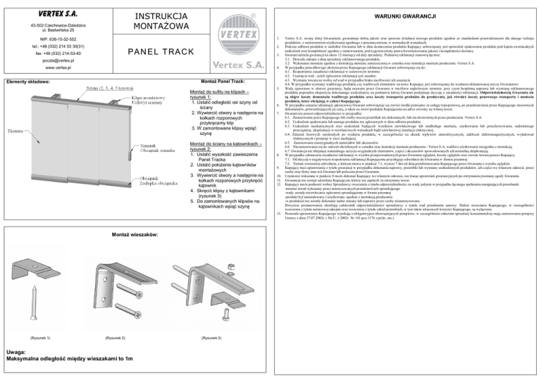 VERTEX S.A. INSTRUKCJA MONTAŻOWA 43-502 Czechowice-Dziedzice ul. Bestwińska 25 WARUNKI GWARANCJI NIP: 638-15-32-552 1. tel.: +48 (032) 214 53 30(31) 2. P A N E L T RA C K fax: +48 (032) 214-53-40 3. [email protected] www.vertex.pl 4. Montaż Panel Track: Elementy składowe: Montaż do sufitu na klipach – rysunek 1: 1. Ustalić odległość osi szyny od ściany 2. Wywiercić otwory a następnie na kołkach rozporowych przykręcamy klip 3. W zamontowane klipsy wpiąć szynę Montaż do ściany na kątownikach – rysunek 2: 1. Ustalić wysokość zawieszenia Panel Tracka 2. Ustalić położenie kątowników montażowych 3. Wywiercić otwory a następnie na kołkach rozporowych przykręcić kątownik 4. Skręcić klipsy z kątownikami (rysunek 3) 5. Do zamontowanych klipsów na kątownikach wpiąć szynę 5. 6. 7. 8. 9. 10. 11. 12. 13. Montaż wieszaków: (Rysunek 1) (Rysunek 2) Uwaga: Maksymalna odległość między wieszakami to 1m (Rysunek 3) Vertex S.A. zwany dalej Gwarantem, gwarantuje dobrą jakość oraz sprawne działanie nowego produktu zgodnie ze standardami przewidzianymi dla danego rodzaju produktów, z zastrzeżeniem użytkowania zgodnego z przeznaczeniem, w normalnych warunkach. Podczas odbioru produktu w siedzibie Gwaranta lub w dniu dostarczenia produktu Kupujący zobowiązany jest sprawdzić opakowanie produktu pod kątem ewentualnych uszkodzeń oraz kompletność zgodnie z zamówieniem, pod rygorem utraty prawa kwestionowania jakości i kompletności dostawy. Gwarant udziela gwarancji na okres 12 miesięcy od daty sprzedaży. Podstawę reklamacji stanowią łącznie: 3.1. Dowodu zakupu z datą sprzedaży reklamowanego produktu. 3.2. Wykonanie montażu zgodnie z instrukcją montażu zamieszczoną w cenniku oraz instrukcji montażu producenta -Vertex S.A. W przypadku prawidłowego złożenia przez Kupującego reklamacji Gwarant zobowiązuje się do: 4.1. Rozpatrzenia zasadności reklamacji w ustawowym terminie. 4.2. Usunięcia wad - jeżeli zgłoszenie reklamacji jest zasadne. 4.3. Wymiany towaru na wolny od wad w przypadku braku możliwości ich usunięcia 4.4. W przypadku wymiany wadliwego produktu czy wadliwych elementów na nowe Kupujący jest zobowiązany do wydania reklamowanej rzeczy Gwarantowi. Wady ujawnione w okresie gwarancji, będą usuwane przez Gwaranta w możliwie najkrótszym terminie, przy czym bezpłatną naprawę lub wymianę reklamowanego produktu poprzedza ekspertyza dokonanego uszkodzenia, na podstawie której Gwarant podejmuje decyzję o zasadności reklamacji. Odpowiedzialnością Gwaranta nie są objęte koszty demontażu wadliwego produktu oraz koszty transportu produktu do producenta, jak również koszty ponownego transportu i montażu produktu, które obciążają w całości Kupującego. W przypadku uznania reklamacji jakościowej Gwarant zobowiązuje się zwróci środki pieniężne za usługę transportową, po przedstawieniu przez Kupującego stosownych dokumentów, potwierdzających jej cenę, a także na zwrot produktu Kupującemu na adres zwrotny na własny koszt. Gwarant nie ponosi odpowiedzialności w przypadku: 6.1. Zastosowania przez Kupującego lub osoby trzecie przeróbek nie dokonanych, lub nie dozwolonych przez producenta -Vertex S.A. 6.2. Uszkodzeń opakowania lub samego produktu nie zgłoszonych w dniu odbioru produktu. 6.3. Uszkodzeń mechanicznych oraz uszkodzeń będących wynikiem niewłaściwego lub niedbałego montażu, użytkowania lub przechowywania, nadmiernego przeciążenia, eksploatacji w niewłaściwych warunkach bądź niewłaściwej instalacji elektrycznej. 6.4. Zdarzeń losowych zaistniałych po wydaniu produktu, w szczególności na skutek wpływów atmosferycznych, zakłóceń elektromagnetycznych, wyładowań elektrycznych i przepięć w sieci zasilającej. 6.5. Zastosowanie nieoryginalnych materiałów lub akcesoriów. 6.6. Niezastosowania się do zaleceń określonych w cenniku oraz instrukcji montażu producenta –Vertex S.A. wadliwe użytkowanie niezgodne z instrukcją. 6.7. Gwarancja nie obejmuje naturalnego zużycia oryginalnych elementów, części i akcesoriów spowodowanych ich normalną eksploatacją. W przypadku odrzucenia zasadności reklamacji w wyniku przeprowadzonych przez Gwaranta oględzin, koszty oględzin oraz zwrotu towaru ponosi Kupujący. 7.1. Od decyzji o negatywnym rozpatrzeniu reklamacji Kupującemu przysługuje odwołanie do Gwaranta w formie pisemnej. 7.2. Termin wniesienia odwołania, o którym mowa w punkcie 7.1, wynosi 7 dni od dnia poinformowania Kupującego przez Gwaranta o wyniku oględzin. Kupujący traci uprawnienia z tytułu gwarancji w przypadku dokonania naprawy, przeróbki lub wymiany uszkodzonych produktów, ich części we własnym zakresie, przez osoby oraz firmy inne niż Gwarant lub polecone przez Gwaranta. Czynności wskazane w punkcie 8 może dokonać Kupujący we własnym zakresie, nie tracąc uprawnień gwarancyjnych po otrzymaniu pisemnej zgody Gwaranta. Gwarancja nie zostaje udzielona Kupującym, którzy nie zapłacili za otrzymany towar. Kupujący może podnosić wobec Sprzedawcy roszczenia z tytułu odpowiedzialności za wady jedynie w przypadku łącznego spełnienia następujących przesłanek: -montaż został wykonany przez autoryzowanych przedstawicieli sprzedającego -wady zostały niezwłocznie zgłoszone sprzedającemu w formie pisemnej -produkt był zainstalowany i użytkowany zgodnie z instrukcją producenta -w produkcie nie zostały dokonane żadne zmiany lub naprawy przez osoby nieautoryzowane. Powyższe postanowienia określają całokształt odpowiedzialności sprzedawcy z tytułu wad przedmiotu umowy. Dalsze roszczenia Kupującego, w szczególności roszczenia z tytułu ustawowej rękojmi oraz roszczenia z tytułu szkód pośrednich, w tym także utraconych korzyści Kupującego, są wyłączone. Pozostałe uprawnienia Kupującego wynikają z obligatoryjnie obowiązujących przepisów, w szczególności odnośnie sprzedaży konsumenckiej ma