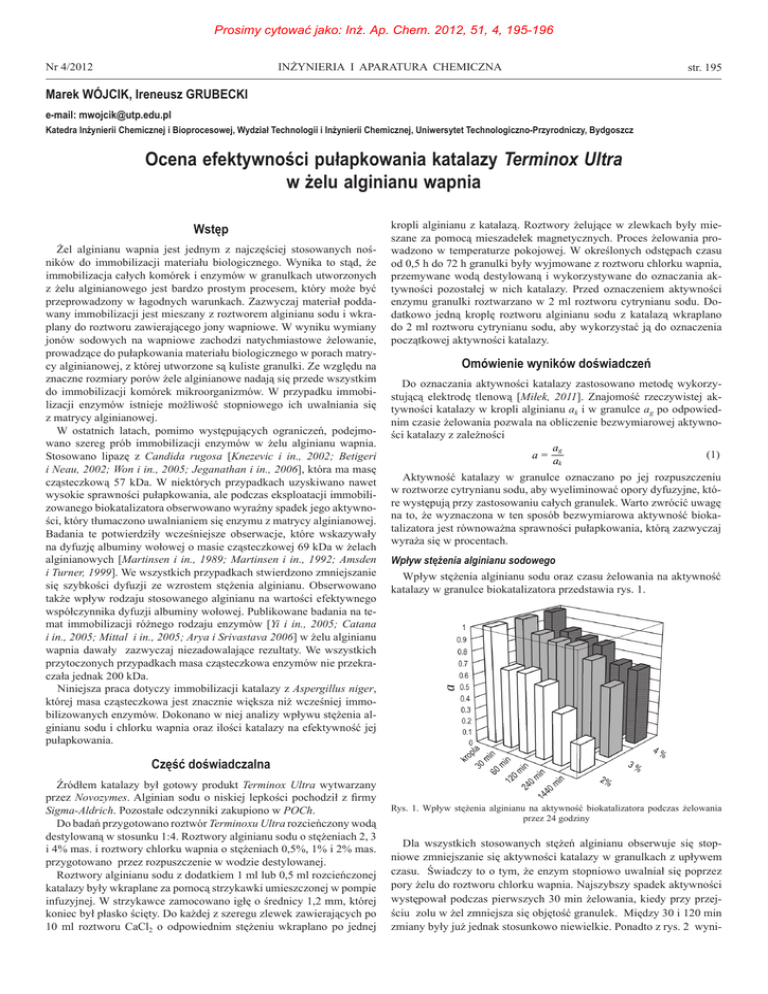 Prosimy cytować jako: Inż. Ap. Chem. 2012, 51, 4, 195-196 INŻYNIERIA I APARATURA CHEMICZNA Nr 4/2012 str. 195 Marek WÓJCIK, Ireneusz GRUBECKI e-mail: [email protected] Katedra Inżynierii Chemicznej i Bioprocesowej, Wydział Technologii i Inżynierii Chemicznej, Uniwersytet Technologiczno-Przyrodniczy, Bydgoszcz Ocena efektywności pułapkowania katalazy Terminox Ultra w żelu alginianu wapnia Wstęp Żel alginianu wapnia jest jednym z najczęściej stosowanych nośników do immobilizacji materiału biologicznego. Wynika to stąd, że immobilizacja całych komórek i enzymów w granulkach utworzonych z żelu alginianowego jest bardzo prostym procesem, który może być przeprowadzony w łagodnych warunkach. Zazwyczaj materiał poddawany immobilizacji jest mieszany z roztworem alginianu sodu i wkraplany do roztworu zawierającego jony wapniowe. W wyniku wymiany jonów sodowych na wapniowe zachodzi natychmiastowe żelowanie, prowadzące do pułapkowania materiału biologicznego w porach matrycy alginianowej, z której utworzone są kuliste granulki. Ze względu na znaczne rozmiary porów żele alginianowe nadają się przede wszystkim do immobilizacji komórek mikroorganizmów. W przypadku immobilizacji enzymów istnieje możliwość stopniowego ich uwalniania się z matrycy alginianowej. W ostatnich latach, pomimo występujących ograniczeń, podejmowano szereg prób immobilizacji enzymów w żelu alginianu wapnia. Stosowano lipazę z Candida rugosa [Knezevic i in., 2002; Betigeri i Neau, 2002; Won i in., 2005; Jeganathan i in., 2006], która ma masę cząsteczkową 57 kDa. W niektórych przypadkach uzyskiwano nawet wysokie sprawności pułapkowania, ale podczas eksploatacji immobilizowanego biokatalizatora obserwowano wyraźny spadek jego aktywności, który tłumaczono uwalnianiem się enzymu z matrycy alginianowej. Badania te potwierdziły wcześniejsze obserwacje, które wskazywały na dyfuzję albuminy wołowej o masie cząsteczkowej 69 kDa w żelach alginianowych [Martinsen i in., 1989; Martinsen i in., 1992; Amsden i Turner, 1999]. We wszystkich przypadkach stwierdzono zmniejszanie się szybkości dyfuzji ze wzrostem stężenia alginianu. Obserwowano także wpływ rodzaju stosowanego alginianu na wartości efektywnego współczynnika dyfuzji albuminy wołowej. Publikowane badania na temat immobilizacji różnego rodzaju enzymów [Yi i in., 2005; Catana i in., 2005; Mittal i in., 2005; Arya i Srivastava 2006] w żelu alginianu wapnia dawały zazwyczaj niezadowalające rezultaty. We wszystkich przytoczonych przypadkach masa cząsteczkowa enzymów nie przekraczała jednak 200 kDa. Niniejsza praca dotyczy immobilizacji katalazy z Aspergillus niger, której masa cząsteczkowa jest znacznie większa niż wcześniej immobilizowanych enzymów. Dokonano w niej analizy wpływu stężenia alginianu sodu i chlorku wapnia oraz ilości katalazy na efektywność jej pułapkowania. kropli alginianu z katalazą. Roztwory żelujące w zlewkach były mieszane za pomocą mieszadełek magnetycznych. Proces żelowania prowadzono w temperaturze pokojowej. W określonych odstępach czasu od 0,5 h do 72 h granulki były wyjmowane z roztworu chlorku wapnia, przemywane wodą destylowaną i wykorzystywane do oznaczania aktywności pozostałej w nich katalazy. Przed oznaczeniem aktywności enzymu granulki roztwarzano w 2 ml roztworu cytrynianu sodu. Dodatkowo jedną kroplę roztworu alginianu sodu z katalazą wkraplano do 2 ml roztworu cytrynianu sodu, aby wykorzystać ją do oznaczenia początkowej aktywności katalazy. Omówienie wyników doświadczeń Do oznaczania aktywności katalazy zastosowano metodę wykorzystującą elektrodę tlenową [Miłek, 2011]. Znajomość rzeczywistej aktywności katalazy w kropli alginianu ak i w granulce ag po odpowiednim czasie żelowania pozwala na obliczenie bezwymiarowej aktywności katalazy z zależności ag (1) a= ak Aktywność katalazy w granulce oznaczano po jej rozpuszczeniu w roztworze cytrynianu sodu, aby wyeliminować opory dyfuzyjne, które występują przy zastosowaniu całych granulek. Warto zwrócić uwagę na to, że wyznaczona w ten sposób bezwymiarowa aktywność biokatalizatora jest równoważna sprawności pułapkowania, którą zazwyczaj wyraża się w procentach. Wpływ stężenia alginianu sodowego Wpływ stężenia alginianu sodu oraz czasu żelowania na aktywność katalazy w granulce biokatalizatora przedstawia rys. 1. Część doświadczalna Źródłem katalazy był gotowy produkt Terminox Ultra wytwarzany przez Novozymes. Alginian sodu o niskiej lepkości pochodził z firmy Sigma-Aldrich. Pozostałe odczynniki zakupiono w POCh. Do badań przygotowano roztwór Terminoxu Ultra rozcieńczony wodą destylowaną w stosunku 1:4. Roztwory alginianu sodu o stężeniach 2, 3 i 4% mas. i roztwory chlorku wapnia o stężeniach 0,5%, 1% i 2% mas. przygotowano przez rozpuszczenie w wodzie destylowanej. Roztwory alginianu sodu z dodatkiem 1 ml lub 0,5 ml rozcieńczonej katalazy były wkraplane za pomocą strzykawki umieszczonej w pompie infuzyjnej. W strzykawce zamocowano igłę o średnicy 1,2 mm, której koniec był płasko ścięty. Do każdej z szeregu zlewek zawierających po 10 ml roztworu CaCl2 o odpowiednim stężeniu wkraplano po jednej Rys. 1. Wpływ stężenia alginianu na aktywność biokatalizatora podczas żelowania przez 24 godziny Dla wszystkich stosowanych stężeń alginianu obserwuje się stopniowe zmniejszanie się aktywności katalazy w granulkach z upływem czasu. Świadczy to o tym, że enzym stopniowo uwalniał się poprzez pory żelu do roztworu chlorku wapnia. Najszybszy spadek aktywności występował podczas pierwszych 30 min żelowania, kiedy przy przejściu zolu w żel zmniejsza się objętość granulek. Między 30 i 120 min zmiany były już jednak stosunkowo niewielkie. Ponadto z rys. 2 wyni- Prosimy cytować jako: Inż. Ap. Chem. 2012, 51, 4, 195-196 str. 196 INŻYNIERIA I APARATURA CHEMICZNA Nr 4/2012 Rys. 2. Wpływ st