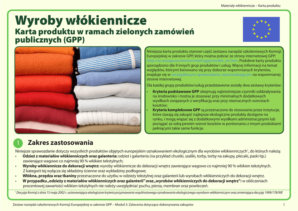 Materiały włókiennicze – Karta produktu Wyroby włókiennicze Karta produktu w ramach zielonych zamówień publicznych (GPP) Niniejsza karta produktu stanowi część zestawu narzędzi szkoleniowych Komisji Europejskiej w zakresie GPP, który można pobrać ze strony internetowej GPP: http://ec.europa.eu/environment/gpp/toolkit_en.htm. Podobne karty produktu sporządzono dla 9 innych grup produktów i usług. Więcej informacji na temat względów, którymi kierowano się przy doborze wspomnianych kryteriów, znajduje się w szczegółowym sprawozdaniu wprowadzającym na wspomnianej stronie internetowej. Dla każdej grupy produktów/usług przedstawione zostały dwa zestawy kryteriów: • Kryteria podstawowe GPP obejmują najistotniejsze czynniki oddziaływania na środowisko i można je stosować przy minimalnych dodatkowych wysiłkach związanych z weryfikacją oraz przy nieznacznych wzrostach kosztów; • Kryteria kompleksowe GPP są przeznaczone do stosowania przez instytucje, które starają się zakupić najlepsze ekologiczne produkty dostępne na rynku, i mogą wiązać się z dodatkowymi wysiłkami administracyjnymi lub pociągać za sobą pewien wzrost kosztów w porównaniu z innym produktami pełniącymi takie same funkcje. 1 Zakres zastosowania Niniejsze sprawozdanie dotyczy wszystkich produktów objętych europejskim oznakowaniem ekologicznym dla wyrobów włókienniczych1, do których należą: • Odzież z materiałów włókienniczych oraz galanteria: odzież i galanteria (na przykład chustki, szaliki, torby, torby na zakupy, plecaki, paski itp.) zawierające wagowo co najmniej 90 % włókien tekstylnych; • Wyroby włókiennicze do dekoracji wnętrz: wyroby włókiennicze do dekoracji wnętrz zawierające wagowo co najmniej 90 % włókien tekstylnych. Z kategorii tej wyłącza się okładziny ścienne oraz wykładziny podłogowe; • Włókna, przędza oraz tkaniny przeznaczone do użytku w odzieży tekstylnej oraz galanterii lub wyrobach włókienniczych do dekoracji wnętrz. • W przypadku „odzieży z materiałów włókienniczych oraz galanterii” oraz „wyrobów włókienniczych do dekoracji wnętrz”: w obliczeniach procentowej zawartości włókien tekstylnych nie należy uwzględniać puchu, pierza, membran oraz powleczeń. 1 Decyzja Komisji z dnia 15 maja 2002 r. ustanawiająca ekologiczne kryteria przyznawania wspólnotowego oznakowania ekologicznego wyrobom włókienniczym oraz zmieniająca decyzję 1999/178/WE Zestaw narzędzi szkoleniowych Komisji Europejskiej w zakresie GPP – Moduł 3: Zalecenia dotyczące dokonywania zakupów 1 3 Materiały włókiennicze – Karta produktu W przypadku kryteriów podstawowych, produkty spełniające wyszczególnione kryteria (określone w oparciu o wspólnotowe oznakowanie ekologiczne) będą zgodne ze specyfikacjami. Zamieszczono również kryteria udzielenia zamówienia dotyczące wykorzystania bawełny wyprodukowanej metodami ekologicznymi oraz włókien pochodzących z recyklingu. Kryteria kompleksowe uwzględniają w specyfikacjach niektóre kryteria dotyczące procesu produkcji oraz włókien, zaczerpnięte ze wspólnotowego programu oznakowania ekologicznego, przy czym na etapie udzielania zamówienia promowane jest wykorzystanie bawełny wyprodukowanej metodami ekologicznymi, włókien pochodzących z recyklingu oraz produktów spełniających niektóre dodatkowe kryteria dotyczące wspólnotowego oznakowania ekologicznego. 2 Kluczowe czynniki oddziaływania na środowisko Oddziaływanie Podejście zgodne z zasadami GPP • Zanieczyszczenie powietrza, tworzenie się smogu ozonowego, bioakumulacja lub zagrożenie dla łańcucha pokarmowego i niebezpieczne oddziaływanie na organizmy wodne albo nadmierny rozwój niepożądanych organizmów wodnych mogących powodować obniżenie jakości wody, w wyniku niewłaściwego stosowania niektórych pestycydów i nawozów przy produkcji włókien, jak również substancji stosowanych podczas przetwarzania włókien i w końcowych produktach włókienniczych Negatywne oddziaływanie na zdrowie użytkowników w związku z pozostałościami pewnych substancji szkodliwych dla zdrowia ludzkiego 2 • • • Zakup wyrobów włókienniczych wyprodukowanych metodami ekologicznymi Zakup używanych wyrobów włókienniczych, które można ponownie wykorzystać zgodnie z ich pierwotnym przeznaczeniem, albo zakup wyrobów włókienniczych zawierających włókna pochodzące z recyklingu Zakup wyrobów włókienniczych, do produkcji których użyto mniejszych ilości substancji szkodliwych dla środowiska Zakup wyrobów włókienniczych zawierających mniejszą ilość pozostałości substancji szkodliwych dla zdrowia ludzkiego Zestaw narzędzi szkoleniowych Komisji Europejskiej w zakresie GPP – Moduł 3: Zalecenia dotyczące dokonywania zakupów 3 3.1 Materiały włókiennicze – Karta produktu Wyroby włókiennicze – kryteria GPP Wyroby włókiennicze – kryteria podstawowe GPP Przedmiot zamówienia Zakup wyrobów włókienniczych o niskiej zawartości substancji toksycznych, przy czym priorytetowo traktowane są produkty charakteryzujące się niewielkim oddziaływaniem na środowisko w czasie produkcji i wytworzone z włókien wyprodukowanych przy użyciu minimalnej ilości pestycydów. Specyfikacje 1. Pestycydy: W przypadku produktów wykonanych z bawełny lub innych naturalnych włókien celulozowych, produkt końcowy zawiera ogółem nie więcej niż 1 ppm (części na milion) następujących substancji: • 2,4,5-T • Heksachlorobenzen • Aldryna • α heksachlorocykloheksan • Kaptafol • β heksachlorocykloheksan • Chlordan • δ heksachlorocykloheksan • Chlordimeform • Metamidofos • DDT • Monokrotofos • Dieldryna • Paration • Dinoseb oraz jego sole • Metyloparation • Endryna • Propetamfos • Heptachlor • Toksafen Uwaga: Większość wymienionych pestycydów została już objęta zakazem wprowadzania do obrotu i stosowania. 