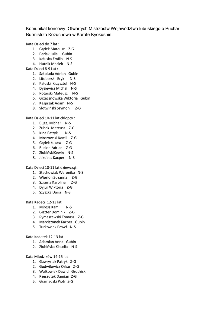 Komunikat końcowy Otwartych Mistrzostw Województwa lubuskiego o Puchar Burmistrza Kożuchowa w Karate Kyokushin. Kata Dzieci do 7 lat : 1. Gądek Mateusz Z-G 2. Perlak Julia Gubin 3. Kałuska Emilia N-S 4. Hutnik Maciek N-S Kata Dzieci 8-9 Lat : 1. Szkołuda Adrian Gubin 2. Litoborski Eryk N-S 3. Kałuski Krzysztof N-S 4. Dysiewicz Michał N-S 5. Rotarski Mateusz N-S 6. Grzecznowska Wiktoria Gubin 7. Kasprzak Adam N-S 8. Słotwioski Szymon Z-G Kata Dzieci 10-11 lat chłopcy : 1. Bugaj Michał N-S 2. Zubek Mateusz Z-G 3. Kina Patryk N-S 4. Mrozowski Kamil Z-G 5. Gądek Łukasz Z-G 6. Bucior Adrian Z-G 7. ZiubioskiKewin N-S 8. Jakubas Kacper N-S Kata Dzieci 10-11 lat dziewcząt : 1. Stachowiak Weronika N-S 2. Wiesion Zuzanna Z-G 3. Szrama Karolina Z-G 4. Dyjur Wiktoria Z-G 5. Szyszka Daria N-S Kata Kadeci 12-13 lat 1. Mirosz Kamil N-S 2. Giszter Dominik Z-G 3. Rymaszewski Tomasz Z-G 4. Marciszonek Kacper Gubin 5. Turkowiak Paweł N-S Kata Kadetek 12-13 lat 1. Adamian Anna Gubin 2. Ziubioska Klaudia N-S Kata Młodzików 14-15 lat 1. Gawrysiak Patryk Z-G 2. Gudwiłowicz Oskar Z-G 3. Walkowiak Dawid Grodzisk 4. Rzeszutek Damian Z-G 5. Gramadzki Piotr Z-G Kata Młodziczek 14-15 lat : 1. Łukaszyn Sarah Gubin 2. Krzyżaniak Karolina Z-G Kata Juniorów 16-17 lat : 1. Bosak Dawid Gubin 2. Tyrak Marcin N-S 3. Galioski Bartosz Z-G 4. Chorążyk Mateusz N-S 5. Gębski Marcin N-S 6. Zamroziewicz Kamil N-S Kata Juniorek 16-17 lat : 1. Leśniewska Aleksandra N-S 2. Kalinowska Joanna Z-G 3. Gudwiłowicz Martyna Z-G 4. Dolna Małgorzata N-s 5. Bucior Kamila Z-G Kata Seniorów : 1. Dolna Agnieszka N-S 2. Blicharski Michał N-S 3. Bosak Łukasz Gubin Kumite Młodzików : 1. Walkowiak Dawid Grodzisk 2. Rzeszutek Damian Z-G 3. Gawrysiak Patryk Z-G 4. Gudwiłowicz Oskar Z-G Kumite młodziczek : 1. Krzyżaniak Karolina Z-G 2. Łukaszyn Sarah Gubin Kumite Juniorów: 1. Bosak Dawid Gubin 2. Galioski Bartosz Z-G 3. Tyrak Marcin N-S Kumite Juniorek : 1. Leśniewska Aleksandra N-S 2. Kalinowska Joanna Z-G 3. Gudwiłowicz Martyna Z-G Kumite seniorów: 1. Blicharski Michał N-S 2. Boska Łukasz Gubin 3. Moryson Daniel N-S Walki Reżyserowane gr. starsza : 1. Bosak Dawid , Łukasz Gubin 2. Szkołuda Adrian , Marciszonek Kacper Gubin Walki reżyserowane gr. Młodsza: 1. Mrozowski Kamil , Gramadzki Piotr Z-G 2. Rymaszewski Tomasz , Aleksander Z-G 3. Grzecznowska Wiktoria , Perlak Julia Gubin Grappling dzieci do 7 lat : 1. Perlak Julia Gubin 2. Gądek Mateusz Z-G 3. Kałuska Emilia N-S Grappling dzieci 8-9 lat : 1. Dysiewicz Michał N-S 2. Rotarski Mateusz N-S 3. Słotwioski Szymon Z-G Grappling dzieci 10-11 lat chłopców: 1. Mrozowski Kamil Z-G 2. ZiubioskiKewin N-S 3. Musiał Jakub N-S Grappling dzieci 10-11 lat dziewcząt : 1. Dyjur Wiktoria Z-G 2. Szyszka Daria N-S 3. Stachowiak Weronika N-S Grappling Kadetów : 1. Marciszonek Kacper Gubin 2. Turkowiak Paweł N-S 3. Kazimierczak Artur N-S Grappling Kadetek : 1. Ziubioska Klaudia N-S 2. Adamyan Anna Gubin Punktacja drużynowa : 1. Zielona Góra 2. Nowa Sól 3. Gubin 4. Grodzisk Wlkp. Najlepszy Zawodnik zawodów : Dawid Bosak Najlepsza Zawodniczka zawodów : Aleksandra Leśniewska