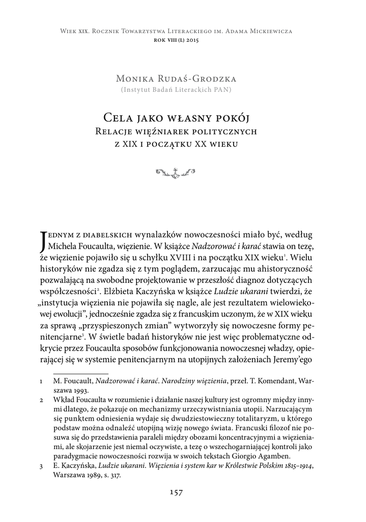 Wiek XIX . Rocznik Towarzystwa Literackiego im. Adama Mickiewicza rok VIii (L) 2015 Monika Rudaś-Grodzka (Insty tut Badań Literackich PAN) Cela jako własny pokój Relacje więźniarek politycznych z XIX i początku XX wieku J ednym z diabelskich wynalazków nowoczesności miało być, według Michela Foucaulta, więzienie. W książce Nadzorować i karać stawia on tezę, że więzienie pojawiło się u schyłku XVIII i na początku XIX wieku 1. Wielu historyków nie zgadza się z tym poglądem, zarzucając mu ahistoryczność pozwalającą na swobodne projektowanie w przeszłość diagnoz dotyczących współczesności 2. Elżbieta Kaczyńska w książce Ludzie ukarani twierdzi, że „instytucja więzienia nie pojawiła się nagle, ale jest rezultatem wielowiekowej ewolucji”, jednocześnie zgadza się z francuskim uczonym, że w XIX wieku za sprawą „przyspieszonych zmian” wytworzyły się nowoczesne formy penitencjarne3. W świetle badań historyków nie jest więc problematyczne odkrycie przez Foucaulta sposobów funkcjonowania nowoczesnej władzy, opierającej się w systemie penitencjarnym na utopijnych założeniach Jeremy’ego 1 2 3 M. Foucault, Nadzorować i karać. Narodziny więzienia, przeł. T. Komendant, Warszawa 1993. Wkład Foucaulta w rozumienie i działanie naszej kultury jest ogromny między innymi dlatego, że pokazuje on mechanizmy urzeczywistniania utopii. Narzucającym się punktem odniesienia wydaje się dwudziestowieczny totalitaryzm, u którego podstaw można odnaleźć utopijną wizję nowego świata. Francuski filozof nie posuwa się do przedstawienia paraleli między obozami koncentracyjnymi a więzieniami, ale skojarzenie jest niemal oczywiste, a tezę o wszechogarniającej kontroli jako paradygmacie nowoczesności rozwija w swoich tekstach Giorgio Agamben. E. Kaczyńska, Ludzie ukarani. Więzienia i system kar w Królestwie Polskim 1815–1914, Warszawa 1989, s. 317. 157 • Monika Rudaś-Grodzka • Benthama 4 i posługującej się w tym względzie dyscypliną i kontrolą, lecz pomijanie przez francuskiego filozofa procesów powstawania i długiego trwania pewnych zjawisk. Przyznając rację historykom, chciałabym zauważyć, że to właśnie koncentrowanie się na momentach intensyfikowania się przebiegów wydarzeń i śledzenie zmian pozwala ujawnić całą złożoność naszej kultury. Przez wiele wieków pozbawienie wolności nie oznaczało kary sądowej. W dużym stopniu były to arbitralne działania władzy, nieregulowane przez akty prawne. Uwięzienie w miejscach odosobnienia – w twierdzy, ratuszu czy klasztorze – często miało charakter prewencyjny. Nierzadko bez wyroku sądowego wtrącano do więzienia osoby, które uznano za niebezpieczne. Zdarzało się, że spędzały tam całe życie. W ten sposób panujący pozbywali się niewygodnych osób, a możne rody swoich niepokornych bliskich. Do czasów Rewolucji Francuskiej zamiast uwięzienia stosowano przede wszystkim kary cielesne i hańbiące. Popularne też były banicja, kara śmierci, pokuta, grzywny etc. W miarę znoszenia kar cielesnych kształtowało się nowoczesne więzienie, które z tego powodu uznano za symbol postępu i cywilizacji. Formą przejściową, jaka w XVI wieku pojawiła się w Anglii i Holandii, były Domy Poprawy, do których ludzi kierowano „na żądanie” władzy. Obok nich istniały szpitale, pełniące również funkcje więzienne. Poza chorymi umieszczano tam osoby kalekie, pozbawione środków do życia oraz żebraków i złodziei. Jednocześnie pojawiły się Domy Pracy, najczęściej będące zarazem przytułkiem i przymusowym azylem dla prostytutek, chorych i włóczęgów. Kaczyńska pisze, że w XVIII wieku nastąpiła już większa specjalizacja i od szpitali zaczęły się stopniowo oddzielać miejsca odosobnienia dla przestępców. Dom Poprawy przestał być więc miejscem przetrzymywania niewygodnych, kompromitujących, niebezpiecznych krewnych czy poddanych, powoli stając się więzieniem karnym5. Pierwsze więzienie karne założono w Filadelfii w USA w 1786 roku, wprowadzając wiele reform penitencjarnych6. Pierwszą z nich był system celkowy, polegający na całkowitym odosobnieniu oraz ciągłym dyscyplinowaniu i kon4 5 6 Patrząc z perspektywy XXI wieku na historię XX, można odnieść wrażenie, że wszelkiego rodzaju utopie okazały się stałym elementem różnych systemów politycznych. Mamy do czynienia z paradoksem, że to, co z założenia niemożliwe, staje się nie tylko możliwe, ale i potworne, jak choćby faszyzm czy stalinizm. E. Kaczyńska, dz. cyt., s. 319; P. Spierenburg, The Body and the State. Early Modern Europe, s. 44–70, w: The Oxford History of the Prison. The Practice of Punishment in Western Society, ed. by N. Morris, D.J. Rothman, New York 1998; Encyclopedia of Prisons and Correctional Facilities, vol. 1, ed. by M. Bosworth, Thousand Oaks 2005, s. 414–416. E. Kaczyńska, dz. cyt., s. 335. 158 • Cela jako własny pokój • trolowaniu więźniów. Służył do tego regulamin dotyczący każdej czynności. Szczegółowy rozkład dnia wypełniał czas uwięzionych. Dlatego wprowadzono zmiany i kolejne, ulepszone już więzienie wybudowano w 1820 roku w Auburn w stanie Nowy Jork. Zniesiono zakaz całkowitego milczenia, uznając resocjalizację za konieczny element wychowawczy i penitencjarny. Więźniowie spędzali noce w pojedynczych celach, a w ciągu dnia pracowali wspólnie w przystosowanym do tego pomieszczeniu i razem spożywali posiłki7. Od lat dwudziestych XIX wieku w całej Europie przedmiotem licznych dyskusji politycznych i filozoficznych stała się reforma więziennictwa. Gorączkowo debatowano nad rozwiązaniami prawnymi i przestrzennymi. Zwyciężyło przekonanie, że podstawą systemu penitencjarnego powinno być oddzielenie przestępców od społeczeństwa. W krótkim czasie pojawiły się liczne i bardzo dziwne projekty architektoniczne. Najbardziej popularna stała się Benthamowsk