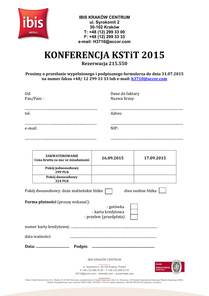 IBIS KRAKÓW CENTRUM ul. Syrokomli 2 30-102 Kraków T: +48 (12) 299 33 00 F: +48 (12) 299 33 33 e-mail: [email protected] KONFERENCJA KSTiT 2015 Rezerwacja 215.550 Prosimy o przesłanie wypełnionego i podpisanego formularza do dnia 31.07.2015 na numer faksu +48/ 12 299 33 33 lub e-mail: [email protected] Od: Pan/Pani : Dane do faktury Nazwa firmy: ............………............................................................. tel. .................................................................................... Adres: ........................…….................................................... e-mail: .................................................................................... NIP: ................................................................................... .................................................................................... ZAKWATEROWANIE Cena brutto za noc ze śniadaniami 16.09.2015 17.09.2015 Pokój jednoosobowy 299 PLN Pokój dwuosobowy 324 PLN Pokój dwuosobowy: duże małżeńskie łóżko dwa osobne łóżka Forma płatności (proszę wskazać): - gotówka - karta kredytowa - przelew (przedpłata) numer karty kredytowej: .................................................................................................... data ważności: Data: .................................. .................................................................................................... Podpis: ................................................................ IBIS KRAKÓW CENTRUM ul. Syrokomli 2, 30-102 Kraków, Polska P +48 (12) 299 33 00 – F +48 (12) 299 33 33 [email protected] – ibishotel.com – accorhotels.com Hekon-Hotele Ekonomiczne S.A., Bracka 16, 00-028 Warszawa, zarejestrowana w Sądzie Rejonowym dla m.st. Warszawy, XII Wydział Gospodarczy Krajowego Rejestru Sądowego (KRS), Rejestr Przedsiębiorców, pod numerem 0000113855, NIP 959-11-76-473, kapitał zakładowy: 300.000.000,00 PLN (wpłacony w całości). IBIS KRAKÓW CENTRUM ul. Syrokomli 2 30-102 Kraków T: +48 (12) 299 33 00 F: +48 (12) 299 33 33 e-mail: [email protected] DODATKOWE INFORMACJE: INFORMACJE OGÓLNE: Doba hotelowa zaczyna się o godzinie 12:00 a kończy o godzinie 12:00 w dniu wyjazdu. Dysponujemy parkingiem podziemnym w cenie 50 pln za dobę. Nasz bogaty bufet śniadaniowy jest do Państwa dyspozycji od 6:30 do 10:00. Wszystkie nasze pokoje wyposażone są w klimatyzację, łazienkę z prysznicem i suszarką, LCD TV, telefon, bezpłatny internet Wi-Fi. W recepcji bezpłatnie dostępne są: skrytki depozytowe, żelazka i deski do prasowania. Restauracja czynna jest do 22:30, bar do 1:00, przekąski i napoje serwujemy 24h. REZERWACJE NIE GWARANTOWANE I GWARANTOWANE: Rezerwacja nie gwarantowana ważna jest do godziny 18.00 planowanego dnia przyjazdu gościa. Istnieje możliwość dokonania rezerwacji gwarantowanej, która zachowuje ważność do godziny 12.00 dnia następnego . Aby zagwarantować pokój po godzinie 18.00 należy: podać numer karty kredytowej, datę jej ważności oraz nazwisko okaziciela karty lub: dokonać przedpłaty w kwocie stanowiącej równowartość należności za pierwszą dobę na konto bankowe hotelu: Bank: Societe Generale S.A. Oddział w Polsce Nr: PL43184000072211804008108719 IBAN CODE: SOGE PLPW ANULACJA REZERWACJI: Rezerwacje gwarantowane mogą być anulowane najpóźniej do godziny 18.00 w dniu planowanego przyjazdu. W przypadku późniejszej anulacji hotel zastrzega sobie prawo obciążenia zleceniodawcy kosztami pierwszej niewykorzystanej doby oraz anulowania dalszego ciągu rezerwacji. FORMA PŁATNOŚCI: Płatność za zakwaterowanie oraz wszelkie dodatkowe usługi takie jak: parking, połączenia telefoniczne powinna być uregulowana indywidualnie przez gości przed wyjazdem gotówką lub kartą kredytową. IBIS KRAKÓW CENTRUM ul. Syrokomli 2, 30-102 Kraków, Polska P +48 (12) 299 33 00 – F +48 (12) 299 33 33 [email protected] – ibishotel.com – accorhotels.com Hekon-Hotele Ekonomiczne S.A., Bracka 16, 00-028 Warszawa, zarejestrowana w Sądzie Rejonowym dla m.st. Warszawy, XII Wydział Gospodarczy Krajowego Rejestru Sądowego (KRS), Rejestr Przedsiębiorców, pod numerem 0000113855, NIP 959-11-76-473, kapitał zakładowy: 300.000.000,00 PLN (wpłacony w całości).