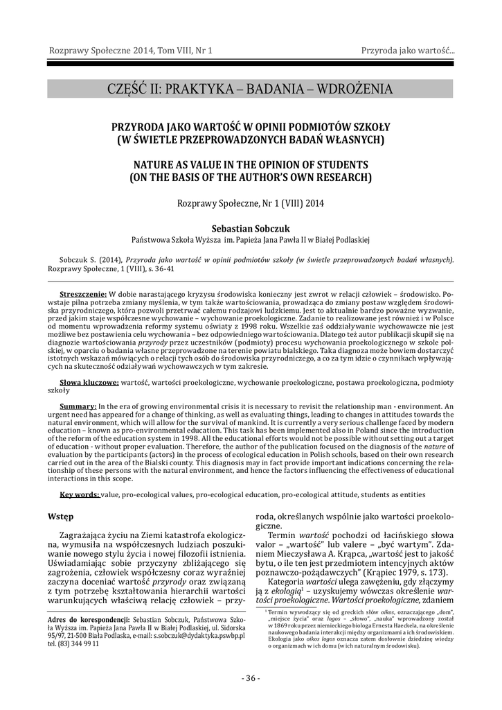 Rozprawy Społeczne 2014, Tom VIII, Nr 1 Przyroda jako wartość... CZĘŚĆ II: PRAKTYKA – BADANIA – WDROŻENIA PRZYRODA JAKO WARTOŚĆ W OPINII PODMIOTÓW SZKOŁY (W ŚWIETLE PRZEPROWADZONYCH BADAŃ WŁASNYCH) NATURE AS VALUE IN THE OPINION OF STUDENTS (ON THE BASIS OF THE AUTHOR’S OWN RESEARCH) Rozprawy Społeczne, Nr 1 (VIII) 2014 Sebastian Sobczuk Państwowa Szkoła Wyższa im. Papieża Jana Pawła II w Białej Podlaskiej Sobczuk S. (2014), Przyroda jako wartość w opinii podmiotów szkoły (w świetle przeprowadzonych badań własnych). Rozprawy Społeczne, 1 (VIII), s. 36-41 Streszczenie: W dobie narastającego kryzysu środowiska konieczny jest zwrot w relacji człowiek – środowisko. Powstaje pilna potrzeba zmiany myślenia, w tym także wartościowania, prowadząca do zmiany postaw względem środowiska przyrodniczego, która pozwoli przetrwać całemu rodzajowi ludzkiemu. Jest to aktualnie bardzo poważne wyzwanie, przed jakim staje współczesne wychowanie – wychowanie proekologiczne. Zadanie to realizowane jest również i w Polsce od momentu wprowadzenia reformy systemu oświaty z 1998 roku. Wszelkie zaś oddziaływanie wychowawcze nie jest możliwe bez postawienia celu wychowania – bez odpowiedniego wartościowania. Dlatego też autor publikacji skupił się na diagnozie wartościowania przyrody przez uczestników (podmioty) procesu wychowania proekologicznego w szkole polskiej, w oparciu o badania własne przeprowadzone na terenie powiatu bialskiego. Taka diagnoza może bowiem dostarczyć istotnych wskazań mówiących o relacji tych osób do środowiska przyrodniczego, a co za tym idzie o czynnikach wpływających na skuteczność odziaływań wychowawczych w tym zakresie. Słowa kluczowe: wartość, wartości proekologiczne, wychowanie proekologiczne, postawa proekologiczna, podmioty szkoły Summary: In the era of growing environmental crisis it is necessary to revisit the relationship man - environment. An urgent need has appeared for a change of thinking, as well as evaluating things, leading to changes in attitudes towards the natural environment, which will allow for the survival of mankind. It is currently a very serious challenge faced by modern education – known as pro-environmental education. This task has been implemented also in Poland since the introduction of the reform of the education system in 1998. All the educational efforts would not be possible without setting out a target of education - without proper evaluation. Therefore, the author of the publication focused on the diagnosis of the nature of evaluation by the participants (actors) in the process of ecological education in Polish schools, based on their own research carried out in the area of the Bialski county. This diagnosis may in fact provide important indications concerning the relationship of these persons with the natural environment, and hence the factors influencing the effectiveness of educational interactions in this scope. Key words: value, pro-ecological values, pro-ecological education, pro-ecological attitude, students as entities Wstęp Zagrażająca życiu na Ziemi katastrofa ekologiczna, wymusiła na współczesnych ludziach poszukiwanie nowego stylu życia i nowej filozofii istnienia. Uświadamiając sobie przyczyny zbliżającego się zagrożenia, człowiek współczesny coraz wyraźniej zaczyna doceniać wartość przyrody oraz związaną z tym potrzebę kształtowania hierarchii wartości warunkujących właściwą relację człowiek – przy- Adres do korespondencji: Sebastian Sobczuk, Państwowa Szkoła Wyższa im. Papieża Jana Pawła II w Białej Podlaskiej, ul. Sidorska 95/97, 21-500 Biała Podlaska, e-mail: [email protected] tel. (83) 344 99 11 roda, określanych wspólnie jako wartości proekologiczne. Termin wartość pochodzi od łacińskiego słowa valor – „wartość” lub valere – „być wartym”. Zdaniem Mieczysława A. Krąpca, „wartość jest to jakość bytu, o ile ten jest przedmiotem intencyjnych aktów poznawczo-pożądawczych” (Krąpiec 1979, s. 173). Kategoria wartości ulega zawężeniu, gdy złączymy ją z ekologią1 – uzyskujemy wówczas określenie wartości proekologiczne. Wartości proekologiczne, zdaniem - 36 - Termin wywodzący się od greckich słów oikos, oznaczającego „dom”, „miejsce życia” oraz logos – „słowo”, „nauka” wprowadzony został w 1869 roku przez niemieckiego biologa Ernesta Haeckela, na określenie naukowego badania interakcji między organizmami a ich środowiskiem. Ekologia jako oikos logos oznacza zatem dosłownie dziedzinę wiedzy o organizmach w ich domu (w ich naturalnym środowisku). 1 Rozprawy Społeczne 2014, Tom VIII, Nr 1 Stanisława Cz. Michałowskiego, są to wartości, które umożliwiają harmonijny rozwój osoby ludzkiej, przyrody i społeczeństwa” (Michałowski 1998, s. 103). Wartości te „urzeczywistniają się w kontakcie człowieka z naturą […], „są cechami lub zespołami różnorodnych realnie istniejących bytów, ujmowanych jako przedmiot, forma i cel poznania, zainteresowania, upodobania i dążenia człowieka. Stają się one pomocne w życiu i rozwoju człowieka, zaspokajając różnorodne potrzeby oraz motywując do działań, nadając sens egzystencji” (Michałowski 1998, s. 116-118). Opierając się na literaturze przedmiotu, do wartości proekologicznych możemy zaliczyć m.in.: wrażliwość na przyrodę, szacunek dla przyrody, odpowiedzialność za środowisko czy umiarkowanie – skromność potrzeb (Por. Skolimowski 1991; Marek-Bieniasz 2001; Sztumski 1999; Domka 2001; Bonenberg 1992; Tyburski 1999; Michałowski 1998). Mówiąc o wartościach, a zwłaszcza o potrzebie ukierunkowywanie człowieka na określone wartości, dotykamy również problematyki samego człowieka i jego wychowania, który zdolny jest do wartościowania, wychowywania siebie i innych do wartości, a także ukierunkowywania swojego życia na określone wartości. Wsz