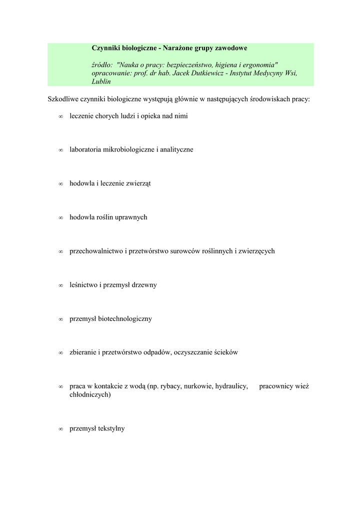 Czynniki biologiczne - Narażone grupy zawodowe źródło: "Nauka o pracy: bezpieczeństwo, higiena i ergonomia" opracowanie: prof. dr hab. Jacek Dutkiewicz - Instytut Medycyny Wsi, Lublin Szkodliwe czynniki biologiczne występują głównie w następujących środowiskach pracy: • leczenie chorych ludzi i opieka nad nimi • laboratoria mikrobiologiczne i analityczne • hodowla i leczenie zwierząt • hodowla roślin uprawnych • przechowalnictwo i przetwórstwo surowców roślinnych i zwierzęcych • leśnictwo i przemysł drzewny • przemysł biotechnologiczny • zbieranie i przetwórstwo odpadów, oczyszczanie ścieków • praca w kontakcie z wodą (np. rybacy, nurkowie, hydraulicy, chłodniczych) • przemysł tekstylny pracownicy wież • przemysł maszynowy • górnictwo • praca z dziećmi i w instytucjach opieki społecznej • praca przy której możliwy jest kontakt z materiałami, na których, najczęściej w wyniku długotrwałego przechowywania w środowisku wilgotnym, może występować obfity wzrost bakterii i grzybów. Najbardziej narażeni na działanie czynników biologicznych są: pracownicy ochrony zdrowia i laboratoriów oraz pracownicy rolnictwa, leśnictwa, przemysłu rolnospożywczego i drzewnego. Pracownicy ochrony zdrowia i laboratoriów narażeni są głównie na czynniki zakaźne, a zwłaszcza na przenoszone przez krew wirusy pochodzenia ludzkiego, takie jak wirusy zapalenia wątroby typu B, C i G (HBV, HCV, HGV) oraz wirus wywołujący AIDS (HIV), [29]. Pracownicy z tych grup mogą być narażeni również na niektóre alergeny, np. alergeny zwierząt laboratoryjnych (zwłaszcza szczurów), które są częstą przyczyną astmy, nieżytu nosa i zapalenia spojówek u pracowników zwierzętarni [24]. Pracownicy rolnictwa, leśnictwa, przemysłu rolno-spożywczego i drzewnego narażeni są w czasie różnych prac (np. przy młóceniu zboża, karmieniu zwierząt, obróbce drewna) na kontakt z pyłami organicznymi pochodzenia roślinnego i zwierzęcego, zawierającymi duże stężenia drobnoustrojów oraz wytwarzanych przez nie alergenów i toksyn. Może to powodować liczne choroby pochodzenia zawodowego o charakterze alergicznym i immunotoksycznym, takie jak: alergiczne zapalenie pęcherzyków płucnych (AZPP), astma oskrzelowa, syndrom toksyczny wywołany pyłem organicznym, alergiczny nieżyt nosa, podrażnienie błon śluzowych, alergiczne zapalenie spojówek i skóry oraz w niektórych, rzadkich przypadkach nowotwory górnych dróg oddechowych, np. gruczolakorak nosa wywołany pyłem drzewnym. Hodowcy zwierząt i weterynarze narażeni są ponadto na zakażenie wirusami, bakteriami, grzybami, pierwotniakami i robakami wywołującymi choroby odzwierzęce (takie jak ornitoza, gorączka Q, leptospirozy, bruceloza, różyca, trychofytoza, toksoplazmoza), a rolnicy i ogrodnicy - na kontakt z alergenami i toksynami roślinnymi wywołującymi zapalenie skóry (dermatitis phytogenes), [4, 10, 20]. Wśród pracowników przemysłu biotechnologicznego znane są przypadki zawodowych uczuleń na enzymy proteolityczne bakterii stosowane do wyrobu środków piorących, na toksyny bakteryjne stosowane jako bioinsektycyd oraz na grzyby Aspergillus niger używane do produkcji kwasu cytrynowego [10, 24]. Ostatnie dziesięciolecia przyniosły burzliwy rozwój tego przemysłu z zastosowaniem metody rekombinacji kwasu dezoksyrybonukleinowego (DNA) bakterii i grzybów, co jednak dzięki skutecznemu systemowi zabezpieczeń nie doprowadziło do pojawienia się niebezpiecznych mutantów ani wzrostu zachorowań wśród pracowników [1]. Pracownicy zbierający odpady komunalne oraz osoby zatrudnione przy przetwarzaniu tych odpadów w kompostowniach, wytwórniach biogazu i podobnych placówkach narażone są na wdychanie alergenów i toksyn wytwarzanych przez grzyby pleśniowe (zwłaszcza Aspergillus fumigatus), termofilne promieniowce i różne bakterie mezofilne [27]. Pracownicy oczyszczalni ścieków narażeni są na wdychanie aerozolu kropelkowego, który może zawierać różne bakterie i wirusy o działaniu zakaźnym, alergizującym i toksycznym, głównie bakterie Gramujemne i wytwarzane przez nie toksyny (endotoksyny, enterotoksyny białkowe). Osoby pracujące w kontakcie z wodą (np. rybacy, nurkowie, hydraulicy, pracownicy wież chłodniczych, platform wiertniczych) narażeni są na zakażenie bakteriami legionelozy (Legionella spp.) powodującymi zapalenie płuc i gorączkę [14], a także amebami (Naegleria) powodującymi choroby centralnego układu nerwowego. Pracownicy tacy mogą być też narażeni na toksyny wytwarzane przez niektóre glony [2] i zwierzęta wodne. Pracownicy zakładów przemysłu tekstylnego przerabiających surowce roślinne (bawełna, len, konopie) narażeni są na immunotoksyczne substancje pochodzenia drobnoustrojowego (endotoksyny, glukany) i roślinnego (taniny), [10, 26]. Pracownicy tego przemysłu zatrudnieni w zakładach przerabiających wełnę i jedwab narażeni są na wdychanie alergenów pochodzenia zwierzęcego [24]. Ostatnio zwrócono uwagę na zaskakujące, ale realne zagrożenie, jakie przedstawia dla pracowników szwalni wielokrotne używanie wydrążonych igieł, co może być przyczyną szerzenia się niebezpiecznych wirusów przenoszonych przez krew (HBV, HCV, HIV), [19]. Pracownicy zakładów przemysłu maszynowego narażeni są na endotoksyny i alergeny bakterii Gramujemnych, które rozwijają się obficie w zużytych olejach i emulsjach olejowo-wodnych, używanych do chłodzenia i smarowania maszyn. Bakterie te stanowią składnik tak zwanej "mgły olejowej" i występują w sąsiedztwie maszyn w wysokich stężeniach [4, 20]. Skutecznym środkiem profilaktycznym jest dodawanie do olejów lub emulsji efektywnych i zarazem bezpiecznych dla ludzi biocydów. Górnicy narażeni są na wdychanie toksynotwórczych grzybów rozwijających się na drewnianych stemplach, a także na zakażenia normalnie nieszkodliwymi grzybami, k
