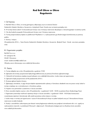 Red Bull Okno w Okno Regulamin I. Cel Imprezy A. Red Bull Okno w Okno, to turniej gamingowy odbywający się na na terenie Domów Studenckich Akadmii Morskiej w Szczecinie w budynkach Pasat i Korab oraz na terenie pomiędzy nimi. B. W turnieju bierze udział 16 dwuosobowych drużyn oraz 4 drużyny rezerwowe decydujące o nierozstrzygniętym wcześniej wyniku. C. Na oba budynki przypada 8 dwuosobowych drużyn oraz 2 drużyny rezerwowe. D. Turniej przeprowadzony będzie na platformach PlayStation 4 z wykorzystaniem gry Rocket League kontrolowanej za pomocą padów. II. Terminy i miejsca 20 października 2016 r., Teren Domów Studenckich Akademi Morskiej w Szczecinie (Budynki Pasat i Korab oraz teren pomiędzy nimi) III. Organizator projektu Red Bull S.p z.o.o Al. wyścigowa 8a 02-681 Warszawa e-mail: [email protected] Oficjalny serwis infromacyjny www.redbull.pl/oknowokno IV. Zapisy A. Turniej odbędzie się w dniu 20 października o godzinie 19:00 B. Zgłoszenia do turnieju przyjmowane będą drogą elektroniczną za pomocą formularza zgłoszeniowego. C. Odnośnik do formularza znajduje się pod adresem www.redbullpl/oknowokno. Liczba miejsc jest ograniczona. D. Zgłoszenia będą przyjmowane od 06 października 2016 r. E. Drużynę zgłasza kapitan drużyny. F. Zgłaszający oświadcza, iż jego drużyna będzie reprezentowała wybrany w formularzu akademik oraz ma prawo wziąć udział w turnieju znajdując się w oświadczonym w formularzu pokoju. G. Kapitan musi potwierdzić uczestnictwo w biurze zawodów. H. Biuro zawodów będzie czynne w dniu 20 października w godzinach 16:00 - 18:00 na parterze Domu Studenckiego Pasat. I. Organizator przewiduje możliwość rejestracji drużyn w biurze zawodów, w godzinach 18:00 - 18:30 (bez konieczności wcześniejszej rejestracji internetowej), tylko jeżeli pozostaną wolne miejsca w turnieju. J. Liczba miejsc w turnieju jest ograniczona i wynosi 8 dwuosobowych drużyn na jeden budynek oraz po 2 dwuosobowe drużyny rezerwowe na jeden budynek. K. Każdy z zawodników zobowiązany jest okazać ważną legitymacje studencką oraz podpisać oświadczenie dot. m.in. zgody na wykorzystanie wizerunku w produkcjach filmowych i zdjęciowych. Oświadczenie dostępne jest na oficjalnej stronie zawodów www.redbull.pl/oknowokno V. Warunki uczestnictwa w zawodach Do zawodów dopuszczeni będą zawodnicy, którzy spełnią kolejne, podane niżej warunki: A. Ukończone 18 lat w dniu zawodów oraz posiadanie ważnej legitymacji studenckiej. B. Możliwość uczestnictwa w turnieju z pokoju, którego okna wychodzą na teren pomiędzy budynkami Pasat i Korab (dziedziniec z boiskami). C. Zarejestrowanie się w oficjalnym serwisie internetowym zawodów pod adresem www.redbull.pl/oknowokno za pomocą formularza lub w biurze zawodów. D. Osobiste potwierdzenie uczestnictwa w dniu ustalonym drogą telefoniczną lub/i mailową najpóźniej na dobę przed rozpoczęciem turnieju. E. Zapoznanie się z regulaminem zawodów i potwierdzenie tego faktu pisemnie w dniu imprezy w ustalonym drogą telefoniczną lub/i mailową. F. Zawodnik nie może być pod wpływem alkoholu ani środków odurzających. G. Stan zdrowia zawodnika musi pozwalać na start w turnieju. H. Organizator zastrzega sobie prawo przyznania tzw. „dzikich kart” dla specjalnych gości zaproszonych do udziału w zawodach. VI. System rozgrywek A. W turnieju może wziąć udział maksymalnie 8 drużyn oraz 2 drużyny rezerwowe. B. System rozgrywek w turnieju eliminacyjnym zostanie ogłoszony przez osobę wyznaczoną przez organizatora bezpośrednio przed z turniejem. C. Rozgrywki w turnieju zostaną przeprowadzone w systemie mieszanym, a każda drużyna rozegra jeden mecz przeciwko wyznaczonym przez organizatora zawodnikom z przeciwległego budynku. VII. Zasady i przebieg turnieju A. Jednocześnie rozgrywany jest jeden mecz pomiędzy dwoma drużynami dwuosobowymi - po jednej z każdego akademika. B. Organizator dostarcza kontrolery (pady) uczestnikom przed rozpoczęciem rozgrywki. C. Operator podnośnika podprowadza ekran, który, dzięki wskazówkom graczy i organizatorów, będzie odpowiednio widoczny zza okna pokoju. D. Każda rozgrywka trwa maksymalnie 5 minut. E. W razie remisowego wyniku drużyny rozgrywają dogrywkę, która może potrwać maksymalnie 2 minuty. F. Po zakończonym meczu podnośnik oraz obsługa organizatora przeprowadza powyższą procedurę w kolejnym zapisanym pokoju. G. Harmonogram rozgrywek udostępni organizator w dniu turnieju. H. Po zakończonym turnieju organizator ogłasza zwycięzców indywidualnych oraz zwycięski akademik. I. Przyznanie nagród indywidualnych nastąpi równocześnie z ogłoszeniem wyników. J. Indywidualne nagrody przysługują jednej drużynie, które, na tle pozostałych rozgrywek, uzyskały najlepszy wynik i wygrały mecz największą różnicą strzelonych bramek (punktów). K. W sytuacji, gdy ilość drużyn z tą samą różnicą bramek (punktów) będzie większa niż trzy o zwycięstwie zadecyduje ilość strzelonych bramek (punktów). VIII. Protesty A. Wszelkie protesty należy składać niezwłocznie do organizatora znajdującego się w biurze zawodów. Organizator jednoosobowo rozpatruje wszelkie protesty. Od jego rozstrzygnięć uczestnikom nie przysługuje możliwość odwołania. IX. Nagrody A. A. Zawodnicy najlepszej drużyn turnieju otrzymają nagrody. 1. Telefon komórkowy wraz ze starterem od Red Bull MOBILE B. Nagrody nie podlegają zwrotowi ani wymianie na ekwiwalent pieniężny. C. Do wszystkich nagród zostanie doliczona przez Organizatora nagroda pieniężna w wysokości 11,13 % wartości nagrody. Nagroda pieniężna, o której mowa, nie zostanie wydana nagrodzonym, lecz przekazana właściwym organom skarbowym przez Organizatora jako płatnika podatku, zgodnie z art. 41 ust. 7 Ustawy z dnia 26 lipca 1991 r. o podatku dochodowym od osób fizycznych, tytułem zryczałtowanego podatku od nagród, o którym mowa w art. 30 ust. 1 pkt 2 