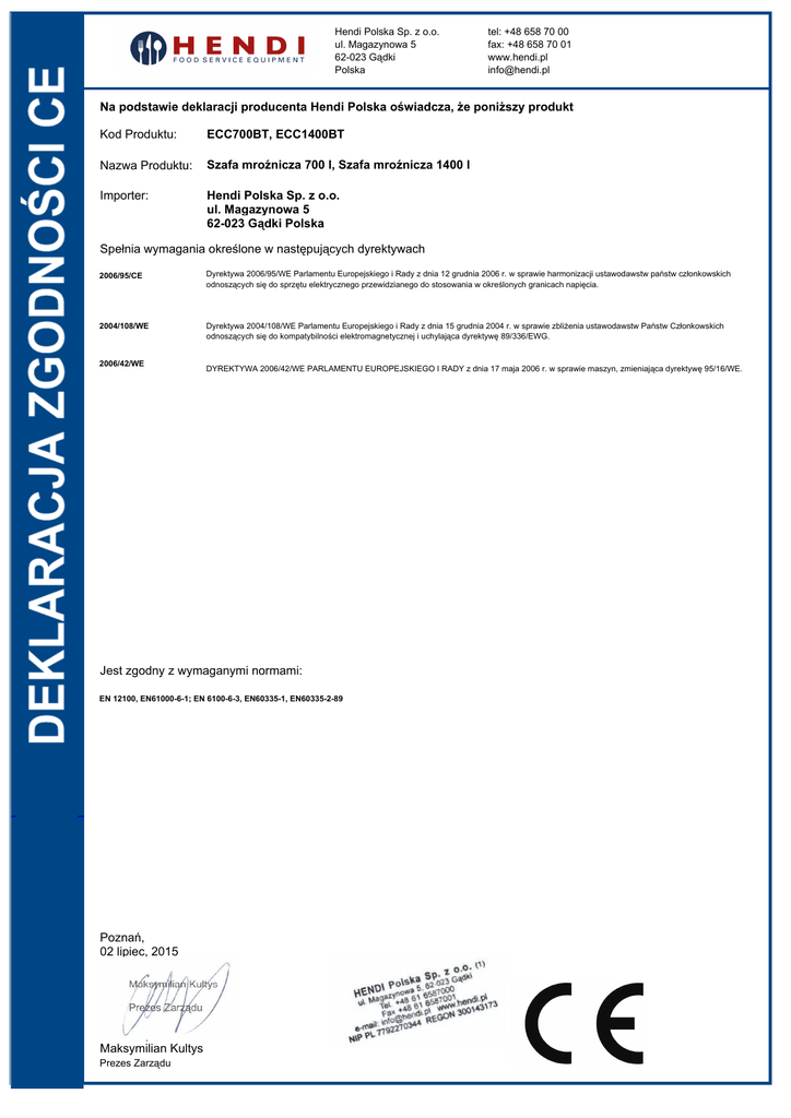 Hendi Polska Sp. z o.o. ul. Magazynowa 5 62-023 Gądki Polska tel: +48 658 70 00 fax: +48 658 70 01 www.hendi.pl [email protected] Na podstawie deklaracji producenta Hendi Polska oświadcza, Ŝe poniŜszy produkt: Kod Produktu: ECC700BT, ECC1400BT Nazwa Produktu: Szafa mroźnicza 700 l, Szafa mroźnicza 1400 l Importer: Hendi Polska Sp. z o.o. ul. Magazynowa 5 62-023 Gądki Polska Spełnia wymagania określone w następujących dyrektywach: 2006/95/CE Dyrektywa 2006/95/WE Parlamentu Europejskiego i Rady z dnia 12 grudnia 2006 r. w sprawie harmonizacji ustawodawstw państw członkowskich odnoszących się do sprzętu elektrycznego przewidzianego do stosowania w określonych granicach napięcia. 2004/108/WE Dyrektywa 2004/108/WE Parlamentu Europejskiego i Rady z dnia 15 grudnia 2004 r. w sprawie zbliŜenia ustawodawstw Państw Członkowskich odnoszących się do kompatybilności elektromagnetycznej i uchylająca dyrektywę 89/336/EWG. 2006/42/WE DYREKTYWA 2006/42/WE PARLAMENTU EUROPEJSKIEGO I RADY z dnia 17 maja 2006 r. w sprawie maszyn, zmieniająca dyrektywę 95/16/WE. Jest zgodny z wymaganymi normami: EN 12100, EN61000-6-1; EN 6100-6-3, EN60335-1, EN60335-2-89 Poznań, 02 lipiec, 2015 R.E Vooys Maksymilian Kultys Prezes Zarządu
