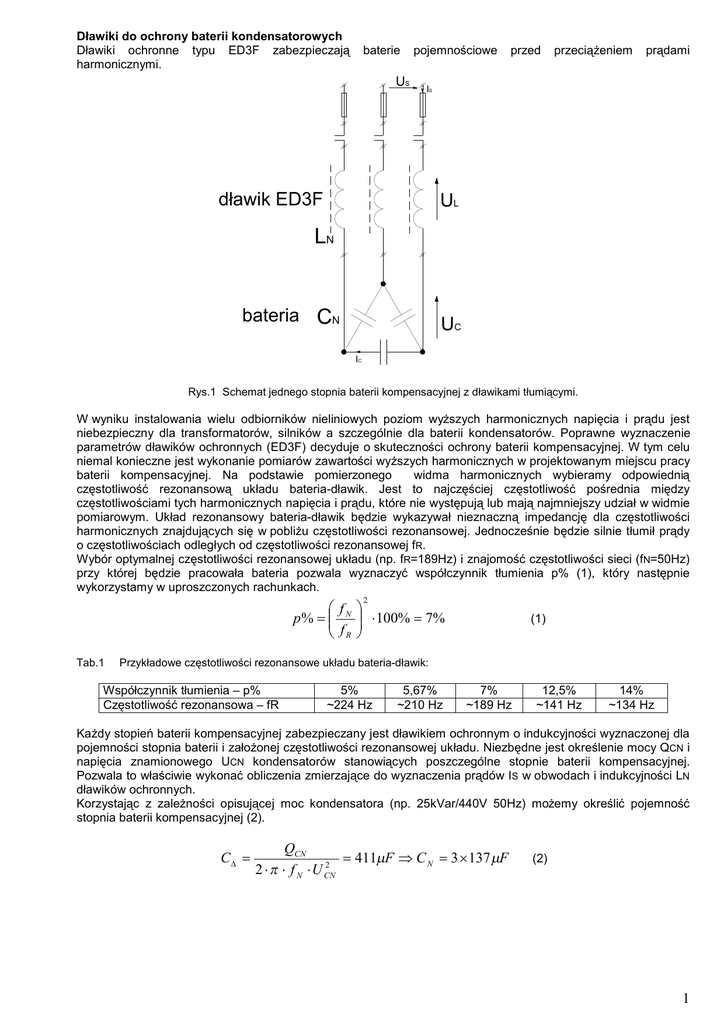 Dławiki do ochrony baterii kondensatorowych Dławiki ochronne typu ED3F zabezpieczają harmonicznymi. baterie US pojemnościowe przed przeciążeniem prądami IS dławik ED3F UL LN bateria CN UC IC Rys.1 Schemat jednego stopnia baterii kompensacyjnej z dławikami tłumiącymi. W wyniku instalowania wielu odbiorników nieliniowych poziom wyższych harmonicznych napięcia i prądu jest niebezpieczny dla transformatorów, silników a szczególnie dla baterii kondensatorów. Poprawne wyznaczenie parametrów dławików ochronnych (ED3F) decyduje o skuteczności ochrony baterii kompensacyjnej. W tym celu niemal konieczne jest wykonanie pomiarów zawartości wyższych harmonicznych w projektowanym miejscu pracy baterii kompensacyjnej. Na podstawie pomierzonego widma harmonicznych wybieramy odpowiednią częstotliwość rezonansową układu bateria-dławik. Jest to najczęściej częstotliwość pośrednia między częstotliwościami tych harmonicznych napięcia i prądu, które nie występują lub mają najmniejszy udział w widmie pomiarowym. Układ rezonansowy bateria-dławik będzie wykazywał nieznaczną impedancję dla częstotliwości harmonicznych znajdujących się w pobliżu częstotliwości rezonansowej. Jednocześnie będzie silnie tłumił prądy o częstotliwościach odległych od częstotliwości rezonansowej fR. Wybór optymalnej częstotliwości rezonansowej układu (np. fR=189Hz) i znajomość częstotliwości sieci (fN=50Hz) przy której będzie pracowała bateria pozwala wyznaczyć współczynnik tłumienia p% (1), który następnie wykorzystamy w uproszczonych rachunkach. 2 æf ö p % = çç N ÷÷ × 100% = 7% è fR ø Tab.1 (1) Przykładowe częstotliwości rezonansowe układu bateria-dławik: Współczynnik tłumienia – p% Częstotliwość rezonansowa – fR 5% ~224 Hz 5,67% ~210 Hz 7% ~189 Hz 12,5% ~141 Hz 14% ~134 Hz Każdy stopień baterii kompensacyjnej zabezpieczany jest dławikiem ochronnym o indukcyjności wyznaczonej dla pojemności stopnia baterii i założonej częstotliwości rezonansowej układu. Niezbędne jest określenie mocy QCN i napięcia znamionowego UCN kondensatorów stanowiących poszczególne stopnie baterii kompensacyjnej. Pozwala to właściwie wykonać obliczenia zmierzające do wyznaczenia prądów IS w obwodach i indukcyjności LN dławików ochronnych. Korzystając z zależności opisującej moc kondensatora (np. 25kVar/440V 50Hz) możemy określić pojemność stopnia baterii kompensacyjnej (2). CD = QCN = 411mF Þ C N = 3 ´ 137 mF 2 2 × p × f N × U CN (2) 1 Następnie wyznaczamy reaktancje pojemnościową XC, indukcyjną XL oraz wypadkową reaktancję baterii z dławikami XBAT (3,4,5), przy założeniu, iż częstotliwość rezonansowa układu powinna wynosić ~189Hz (p=7%). XC = 1 = 7,75W 2 × p × f N × CD X L = X C × p = 0,54W (3) (4) X BAT = X C - X L = 7,21W (5) Na tej podstawie określamy indukcyjność fazową dławika LN oraz prąd IS wymuszany przez baterię (6,7) : LN = IS = XL = 1,72mH 2 ×p × f N US 3 × X BAT = 32 A (6) (7) Rzeczywiste napięcie UCR na zaciskach baterii osiągnie wartość (8) : U CR = US = 430V 1- p (8) Stąd można wyznaczyć rzeczywistą moc bierną QCR baterii pojemnościowej 25kvar/440V 50Hz, moc bierną dławika ochronnego QL i wypadkową moc bierną stopnia baterii QBAT (9,10,11) : 2 QCR = 2 × p × f N × C D × U CR = 23,86k var (9) QL = 3 × 2 × p × f N × L N × I S2 = 1,66k var (10) QBAT = QCR - QL = 22,2k var (11) Od dławików ochronnych (ED3F) wymaga się poprawnej pracy w warunkach zmiennego obciążenia. Udział prądów harmonicznych obciążających baterię i dławiki zmienia się w zależności od konfiguracji sieci zakładowej i ilości pracujących aktualnie przekształtników czy innych nieliniowych odbiorników. Określono zatem parametr zwany liniowością magnetyczną. Przedstawia on maksymalny prąd dławika ILIN, dla którego tolerancja indukcyjności powinna zawierać się w przedziale L ³ 0,95LN. Jest on więc miarą stabilności parametrów dławika w podczas przeciążenia. Intensywność zniekształcenia sinusoidy napięcia sieciowego w miejscu pracy baterii pojemnościowej może w znacznym stopniu zależeć od odbiorników nieliniowych pracujących w sąsiednich przedsiębiorstwach zasilanych z tej samej rozdzielni. Należy również zwrócić uwagę, że ilość zniekształceń (czyli THDU, THDI) może zmienić się radykalnie na przestrzeni zaledwie kilku miesięcy (w miarę instalowania np. przekształtników we wspomnianych już sąsiednich przedsiębiorstwach). Dlatego aby uniknąć problemów eksploatacyjnych instalowane układy kompensacyjne powinny zawierać dławiki ochronne. Dławik ELHAND do ochrony baterii typu ED3F-22,2/400/7-25/440 2