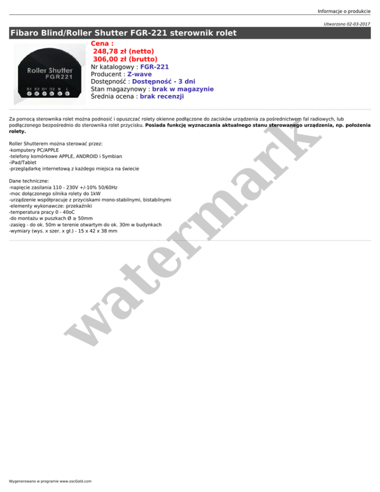 Informacje o produkcie Utworzono 02-03-2017 Fibaro Blind/Roller Shutter FGR-221 sterownik rolet Cena : 248,78 zł (netto) 306,00 zł (brutto) Nr katalogowy : FGR-221 Producent : Z-wave Dostępność : Dostępność - 3 dni Stan magazynowy : brak w magazynie Średnia ocena : brak recenzji er m ar k Za pomocą sterownika rolet można podnosić i opuszczać rolety okienne podłączone do zacisków urządzenia za pośrednictwem fal radiowych, lub podłączonego bezpośrednio do sterownika rolet przycisku. Posiada funkcję wyznaczania aktualnego stanu sterowanego urządzenia, np. położenia rolety. Roller Shutterem można sterować przez: -komputery PC/APPLE -telefony komórkowe APPLE, ANDROID i Symbian -iPad/Tablet -przeglądarkę internetową z każdego miejsca na świecie w at Dane techniczne: -napięcie zasilania 110 - 230V +/-10% 50/60Hz -moc dołączonego silnika rolety do 1kW -urządzenie współpracuje z przyciskami mono-stabilnymi, bistabilnymi -elementy wykonawcze: przekaźniki -temperatura pracy 0 - 40oC -do montażu w puszkach Ø ≥ 50mm -zasięg - do ok. 50m w terenie otwartym do ok. 30m w budynkach -wymiary (wys. x szer. x gł.) - 15 x 42 x 38 mm Wygenerowano w programie www.oscGold.com