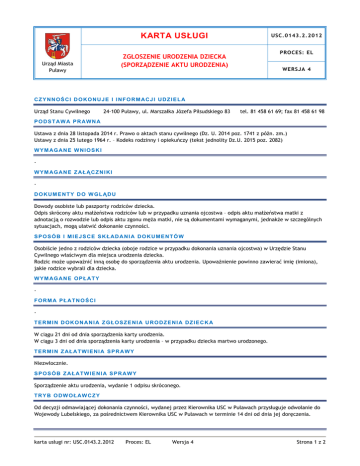KARTA USŁUGI USC.0143.2.2012 PROCES: EL ZGŁOSZENIE URODZENIA DZIECKA (SPORZĄDZENIE AKTU URODZENIA) Urząd Miasta Puławy WERSJA 4 CZYNNOŚCI DOKONUJE I INFORMACJI UDZIELA Urząd Stanu Cywilnego 24-100 Puławy, ul. Marszałka Józefa Piłsudskiego 83 tel. 81 458 61 69; fax 81 458 61 98 PODSTAWA PRAWNA Ustawa z dnia 28 listopada 2014 r. Prawo o aktach stanu cywilnego (Dz. U. 2014 poz. 1741 z późn. zm.) Ustawy z dnia 25 lutego 1964 r. – Kodeks rodzinny i opiekuńczy (tekst jednolity Dz.U. 2015 poz. 2082) W Y M AG A N E W N I O S K I W Y M AG A N E Z A Ł Ą C Z N I K I DOKUMENTY DO WGLĄDU Dowody osobiste lub paszporty rodziców dziecka. Odpis skrócony aktu małżeństwa rodziców lub w przypadku uznania ojcostwa – odpis aktu małżeństwa matki z adnotacją o rozwodzie lub odpis aktu zgonu męża matki, nie są dokumentami wymaganymi, jednakże w szczególnych sytuacjach, mogą ułatwić dokonanie czynności. S P O S Ó B I M I E J S C E S K Ł AD A N I A D O K U M E N T Ó W Osobiście jedno z rodziców dziecka (oboje rodzice w przypadku dokonania uznania ojcostwa) w Urzędzie Stanu Cywilnego właściwym dla miejsca urodzenia dziecka. Rodzic może upoważnić inną osobę do sporządzenia aktu urodzenia. Upoważnienie powinno zawierać imię (imiona), jakie rodzice wybrali dla dziecka. W Y M AG A N E O P Ł A T Y FORMA PŁATNOŚCI TERMIN DOKONANIA ZGŁOSZENIA URODZENIA DZIECKA W ciągu 21 dni od dnia sporządzenia karty urodzenia. W ciągu 3 dni od dnia sporządzenia karty urodzenia – w przypadku dziecka martwo urodzonego. T E R M I N Z AŁ A T W I E N I A S P R A W Y Niezwłocznie. SPOSÓB ZAŁATWIENIA SPRAWY Sporządzenie aktu urodzenia, wydanie 1 odpisu skróconego. T R Y B O D W O Ł AW C Z Y Od decyzji odmawiającej dokonania czynności, wydanej przez Kierownika USC w Puławach przysługuje odwołanie do Wojewody Lubelskiego, za pośrednictwem Kierownika USC w Puławach w terminie 14 dni od dnia jej doręczenia. karta usługi nr: USC.0143.2.2012 Proces: EL Wersja 4 Strona 1 z 2 SPOSÓB I MIEJSCE ODBIORU DOKUMENTÓW Osobiście w siedzibie Urzędu Stanu Cywilnego UWAGI Uznanie ojcostwa może nastąpić wyłącznie w sytuacji, gdy nie zachodzą okoliczności wyłączające uznanie, określone w kodeksie rodzinnym i opiekuńczym. karta usługi nr: USC.0143.2.2012 Proces: EL Wersja 4 Strona 1 z 2
