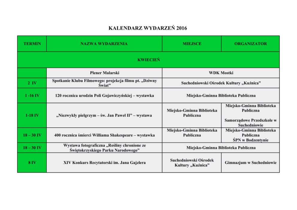 KALENDARZ WYDARZEŃ 2016 TERMIN NAZWA WYDARZENIA MIEJSCE ORGANIZATOR KWIECIEŃ Plener Malarski WDK Mostki 2 IV Spotkanie Klubu Filmowego: projekcja filmu pt. „Dziwny Świat” Suchedniowski Ośrodek Kultury „Kuźnica” 1 -16 IV 120 rocznica urodzin Poli Gojawiczyńskiej – wystawka Miejsko-Gminna Biblioteka Publiczna 1-18 IV „Niezwykły pielgrzym – św. Jan Paweł II” – wystawa 18 – 30 IV 400 rocznica śmierci Williama Shakespeare – wystawka 18 – 30 IV Wystawa fotograficzna „Rośliny chronione ze Świętokrzyskiego Parku Narodowego” 8 IV XIV Konkurs Recytatorski im. Jana Gajzlera Miejsko-Gminna Biblioteka Publiczna Miejsko-Gminna Biblioteka Publiczna Miejsko-Gminna Biblioteka Publiczna Samorządowe Przedszkole w Suchedniowie Miejsko-Gminna Biblioteka Publiczna ŚPN w Bodzentynie Miejsko-Gminna Biblioteka Publiczna Suchedniowski Ośrodek Kultury „Kuźnica” Gimnazjum w Suchedniowie kwiecień 16 IV Spotkanie autorskie z pisarzem książek dla dzieci Zajęcia z rękodzieła – spotkanie z Kołem Gospodyń Wiejskich z Mostek XI Ogólnopolski Turniej Formacji Tanecznych „Suchedniów 2016” 25 IV Eliminacje Szkolne do XXVI Ogólnopolskiego Małego Konkursu Recytatorskiego 25 IV– 7 V Rocznica Uchwalenia Konstytucji 3 maja – wystawa 29 IV 30 IV XVIII edycja Suchedniowskiej Wiosny Teatralnej „Maskarada” Koncert zespołu Mir Miejsko-Gminna Biblioteka Publiczna Hala Sportowa w Suchedniowie Suchedniowski Ośrodek Kultury „Kuźnica” Suchedniowski Ośrodek Kultury „Kuźnica” Suchedniowski Ośrodek Kultury „Kuźnica” / Starachowickie Centrum Kultury Miejsko-Gminna Biblioteka Publiczna Suchedniowski Ośrodek Kultury „Kuźnica” Suchedniowski Ośrodek Kultury „Kuźnica” MAJ 3V maj 2 – 10 V Koncert z okazji Narodowego Święta Konstytucji 3-Maja Suchedniowski Ośrodek Kultury „Kuźnica” Konkurs języka angielskiego Samorządowa Szkoła Podstawowa nr 3 170 rocznica urodzin Henryka Sienkiewicza – wystawka Spotkanie autorskie z Ireneuszem Kulińskim Miejsko-Gminna Biblioteka Publiczna Miejsko-Gminna Biblioteka Publiczna promocja książki „ Harcerki i harcerze hufców Skarżyska Kamiennej i Suchedniowa – szkice i materiały cz. 1” 8– 15 V Tydzień Bibliotek”- „Drużyna pierścienia” – mini gra miejska Finał akcji : „Cała Polska Czyta Dzieciom”, „Szczęśliwy los” – loteria z nagrodami 11 – 18 V 125 rocznica urodzin Michaiła Bułhakowa – wystawka Miejsko-Gminna Biblioteka Publiczna Miejsko-Gminna Biblioteka Publiczna 13 V Praosada Rydno w Suchedniowie – rekonstrukcje prehistoryczne Suchedniowski Ośrodek Kultury „Kuźnica” Suchedniowski Ośrodek Kultury „Kuźnica” / Stowarzyszenie „Praosada Rydno” 14 V XII Suchedniowski Rajd Rowerowy „Góry Świętokrzyskie 2016” Ośrodek Sportu i Rekreacji Suchedniów, okoliczne tereny Suchedniowskie Stowarzyszenie Cyklistów 19 – 31 V 175 rocznica śmierci Juliana Usryna Niemcewicza – wystawka 21 V „Muzyczna Majówka” 21 V Lato, lato, lato czeka 26-27 V „Przedszkolaki dla mam” z okazji Święta Matki 28 V Dzień Dziecka Miejsko-Gminna Biblioteka Publiczna Suchedniowski Ośrodek Amfiteatr Suchedniowskiego Kultury „Kuźnica” Ośrodka Kultury „Kuźnica” Stowarzyszenie Kuźniczy Krąg Centrum Kształceniowo-Integracyjne w Michniowie scena „Pod Dębem” Przedszkole Samorządowe, Suchedniowski Ośrodek Suchedniowski Ośrodek Kultury „Kuźnica” Kultury „Kuźnica” Suchedniowski Ośrodek Kultury „Kuźnica” amfiteatr maj Wystawa artystyczna uczniów kieleckiego „Plastyka” maj Nocny „Rajd Św. Emeryka” dla dzieci i młodzieży maj Miejsko-Gminna Biblioteka Publiczna WDK Mostki Ogólnopolski Otwarty Plener Fotograficzny, Aero-Foto -warsztaty fotograficzno – filmowe. Konkurs „Aero-Focus” – WDK Mostki Oddział Międzyszkolny PTTK w Starachowicach Warsztaty Fotograficzne w Krakowskim Centrum Kultury Dworek Białoprądnicki Kraków Stowarzyszenie na Rzecz Rozwoju Mostek WDK Mostki maj/czerwiec Mini-Wyścig MTB Stadion Miejskiego Klubu „Orlicz”, okoliczne tereny Suchedniowskie Stowarzyszenie Cyklistów maj/czerwiec Rajd rowerowy Suchedniów, okoliczne tereny Akcja Katolicka maj - czerwiec "ŚWIĘTOKRZYSKI PIKNIK BIESIADNY" - MOSTKI 2016. pod hasłem: "Świętokrzyska Wieś Zaprasza" WDK Mostki WDK Mostki, Starostwa Powiatowe, Stowarzyszenia Auto-Motorowe CZERWIEC Czerwiec Czerwiec OSiR Suchedniów Zlot caravaningowy 2016 Plener Malarski WDK Mostki WDK Mostki Ognisko Plastyczne 3 VI Obchody „Roku sienkiewiczowskiego” Suchedniowski Ośrodek Kultury „Kuźnica” 1 – 13 VI 175 rocznica Elizy Orzeszkowej – wystawka Miejsko-Gminna Biblioteka Publiczna 4-5 VI 100-lecie Harcerstwa czerwiec Turniej szachowy o puchar dyrektora SSP3 czerwiec Wystawa fotograficzna autorstwa Andrzeja Sasala – wystawa Suchedniów, okoliczne tereny ZHR SSP3 Miejsko-Gminna Biblioteka Publiczna „Lubimy się bawić” 7 VI gry, zagadki, konkursy z nagrodami dla dzieci - czytanie na trawie – zajęcia plenerowe Miejsko-Gminna Biblioteka Publiczna plener 12 VI 40 lecie Chóru „Senior” Suchedniowski Ośrodek Kultury „Kuźnica” 17 VI Uroczystość patriotyczna w miejscu pamięci narodowej przy ul. Dawidowicza plac przy pomniku na ul. Dawidowicza Gimnazjum w Suchedniowie 25 VI Świętojanki 2016 Ośrodek Sportu i Rekreacji w Suchedniowie Suchedniowski Ośrodek Kultury „Kuźnica” LIPIEC 4-8 VII IV Igrzyska Sportowe w Michniowie Boisko i CKI w Michniowie CKI w Michniowie lipiec Turniej Dzikich Drużyn Boisko przy Ośrodku Kultury Chrześcijańskiej SKS lipiec piknik rekreacyjny „Rodzinne Mostki” WDK Mostki WDK Mostki Rada Sołecka w Mostkach lipiec Turniej siatkówki plażowej lipiec 50 lat Suchedniowskiej Kuźnicy Ośrodek Sportu i Rekreacji Suchedniów Suchedniowski Ośrodek Kultury „Kuźnica” SIEPRIEŃ IV Świętokrzyski Konwent Fantastyki JAGACON Zespół Szkół im. Henryka Sienkiewicza w Suchedniowie Stowarzyszenie Tygiel 