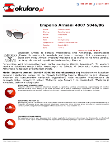 801 544 888 34 32 44 888 Emporio Armani 4007 5046/8G Marka: Emporio Armani Okulary: Damskie,Męskie Kształt: Kwadratowe Rodzaj: Pełne Kolor: Czarny,Różowy Typ produktu: Okulary przeciwsłoneczne Rozmiar: Średnie 51-55 Cena: > 500 zł Cena brutto: 548,88 PLN Emporiom Armani to bardziej młodzieżowa linia Armaniego, przeznaczona głównie dla młodszych dorosłych. Jest jedną z droższych linii wypuszczanych przez dom mody Armani. Produkty włączone w tę markę to nie tylko ubrania, perfumy, akcesoria i zegarki, ale także okulary, które są "wcieleniem wizji kosmopolitycznego ducha miejskiego Giorgio Armaniego". To wiodąca marka w dziedzinie mody i dóbr luksusowych na świecie. W 2000 roku Forbes obwołał Armaniego najlepszym projektantem świata. Model Emporio Armani EA4007 5046/8G charakteryzuje się kwadratowym kształtem oprawki i doskonale nadaje się do różnych kształtów twarzy. Oprawka ta jest idealnym wyborem dla konsumentów ceniących oryginalność nade wszystko. Przeznaczona dla pewnych siebie, odważnych kobiet. Widoczne logo Armani ? na zausznikach. Wyróżnia ją wyrazista, jaskrawa kolorystyka. SOCZEWKI Z UTWARDZENIEM Wszystkie oferowane soczewki okularowe pokryte są specjalną warstwą utwardzającą, zapewniającą ich trwałość poprzez redukcję ilości drobnych rys, które pojawiają się w czasie normalnego użytkowania okularów. Ta powłoka utwardzająca zwiększa twardość powierzchni soczewki i zapewnia większy komfort w użytkowaniu okularów. SOCZEWKI Z FILTREM UV Jesteśmy narażeni w codziennym życiu na szkodliwe promieniowanie UV, które powoduje uszkodzenia narządów wzroku. Wszystkie oferowane przez nas soczewki okularowe zapewniają pełną ochronę przed szkodliwym promieniowaniem słonecznym UV, czego konsekwencją jest ochrona siatkówki oka oraz soczewki oka. ETUI I MIKROFIBRA GRATIS! Do każdej zamówionej pary dołączony jest zestaw oryginalnych akcesoriów (markowe etui i ściereczkę z mikrofibry). Etui może różnić się od przedstawionego na zdjęciu ze względu na pojawiające się nowe modele etui u producentów. http://www.okularo.pl sklep internetowy 801 544 888 34 32 44 888 WYSYŁKA 24H Towar dostępny w naszym magazynie. Wysyłamy w ciągu 24h. W przypadku okularów korekcyjnych termin może ulec zmianie w zależności od wybranych soczewek okularowych. 100% SATYSFAKCJI Z ZAKUPU Dokładamy wszelkich starań aby satysfakcja z zakupów u nas była 100-procentowa! Dlatego do każdego zamówionego u nas towaru dajemy 10-dniową gwarancję satysfakcji. Gwarantujemy Ci możliwość rezygnacji z dokonanego zakupu bez podania przyczyny w ciągu 10 dni od daty odebrania przesyłki. Zwracany towar nie może być używany, opakowanie ani żaden inny element wyposażenia nie mogą nosić śladów użytkowania ani zniszczenia, powinien być kompletny i zwrócony w oryginalnym opakowaniu firmowym producenta wraz z wszelkimi dodatkami. Przed wysłaniem przesyłki należy skontaktować sie z działem obsługi klientów okularo.pl. GWARANCJA 12 MIESIĘCY Zwracamy szczególną uwagę na jakość wykonując okulary na zamówienie zgodnie z Twoją receptą. Jeśli w okresie 1 roku od zakupu pojawią się jakiekolwiek wady w zakupionych okularach, będziemy je naprawiać lub wymieniać na nowe bez żadnych opłat. Wszystkie oferowane przez nas towary posiadają gwarancję producenta, dystrybutora lub sprzedawcy na okres co najmniej 12 miesięcy. 100% ORYGINAŁ Wszystkie oferowane przez nas produkty są fabrycznie nowe w oryginalnych opakowaniach z gwarancją jakości i oryginalności. PRZESYŁKA GRATIS! Zamawiając ten produkt nie płacisz za przesyłkę. ZESTAW DO PIELĘGNACJI OKULARÓW GRATIS! W prezencie otrzymujesz zestaw do pielęgnacji okularów o wartości 30zł! http://www.okularo.pl sklep internetowy