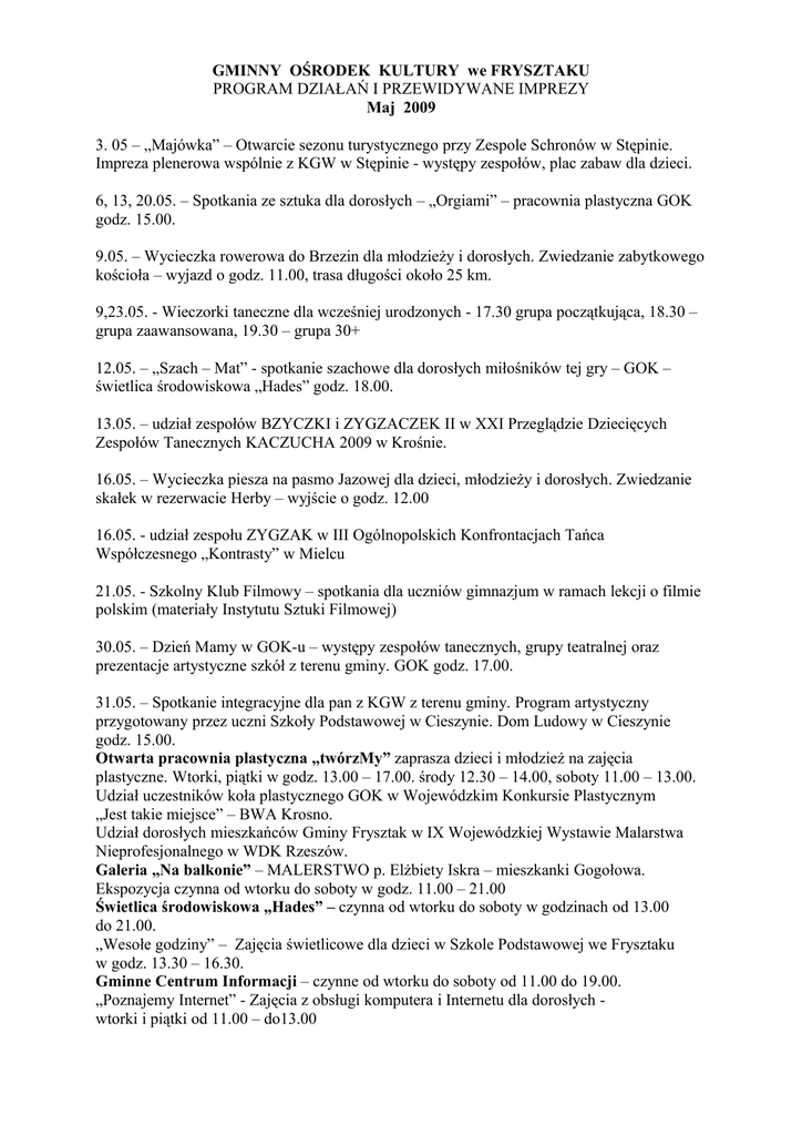 GMINNY OŚRODEK KULTURY we FRYSZTAKU PROGRAM DZIAŁAŃ I PRZEWIDYWANE IMPREZY Maj 2009 3. 05 – „Majówka” – Otwarcie sezonu turystycznego przy Zespole Schronów w Stępinie. Impreza plenerowa wspólnie z KGW w Stępinie - występy zespołów, plac zabaw dla dzieci. 6, 13, 20.05. – Spotkania ze sztuka dla dorosłych – „Orgiami” – pracownia plastyczna GOK godz. 15.00. 9.05. – Wycieczka rowerowa do Brzezin dla młodzieży i dorosłych. Zwiedzanie zabytkowego kościoła – wyjazd o godz. 11.00, trasa długości około 25 km. 9,23.05. - Wieczorki taneczne dla wcześniej urodzonych - 17.30 grupa początkująca, 18.30 – grupa zaawansowana, 19.30 – grupa 30+ 12.05. – „Szach – Mat” - spotkanie szachowe dla dorosłych miłośników tej gry – GOK – świetlica środowiskowa „Hades” godz. 18.00. 13.05. – udział zespołów BZYCZKI i ZYGZACZEK II w XXI Przeglądzie Dziecięcych Zespołów Tanecznych KACZUCHA 2009 w Krośnie. 16.05. – Wycieczka piesza na pasmo Jazowej dla dzieci, młodzieży i dorosłych. Zwiedzanie skałek w rezerwacie Herby – wyjście o godz. 12.00 16.05. - udział zespołu ZYGZAK w III Ogólnopolskich Konfrontacjach Tańca Współczesnego „Kontrasty” w Mielcu 21.05. - Szkolny Klub Filmowy – spotkania dla uczniów gimnazjum w ramach lekcji o filmie polskim (materiały Instytutu Sztuki Filmowej) 30.05. – Dzień Mamy w GOK-u – występy zespołów tanecznych, grupy teatralnej oraz prezentacje artystyczne szkół z terenu gminy. GOK godz. 17.00. 31.05. – Spotkanie integracyjne dla pan z KGW z terenu gminy. Program artystyczny przygotowany przez uczni Szkoły Podstawowej w Cieszynie. Dom Ludowy w Cieszynie godz. 15.00. Otwarta pracownia plastyczna „twórzMy” zaprasza dzieci i młodzież na zajęcia plastyczne. Wtorki, piątki w godz. 13.00 – 17.00. środy 12.30 – 14.00, soboty 11.00 – 13.00. Udział uczestników koła plastycznego GOK w Wojewódzkim Konkursie Plastycznym „Jest takie miejsce” – BWA Krosno. Udział dorosłych mieszkańców Gminy Frysztak w IX Wojewódzkiej Wystawie Malarstwa Nieprofesjonalnego w WDK Rzeszów. Galeria „Na balkonie” – MALERSTWO p. Elżbiety Iskra – mieszkanki Gogołowa. Ekspozycja czynna od wtorku do soboty w godz. 11.00 – 21.00 Świetlica środowiskowa „Hades” – czynna od wtorku do soboty w godzinach od 13.00 do 21.00. „Wesołe godziny” – Zajęcia świetlicowe dla dzieci w Szkole Podstawowej we Frysztaku w godz. 13.30 – 16.30. Gminne Centrum Informacji – czynne od wtorku do soboty od 11.00 do 19.00. „Poznajemy Internet” - Zajęcia z obsługi komputera i Internetu dla dorosłych wtorki i piątki od 11.00 – do13.00