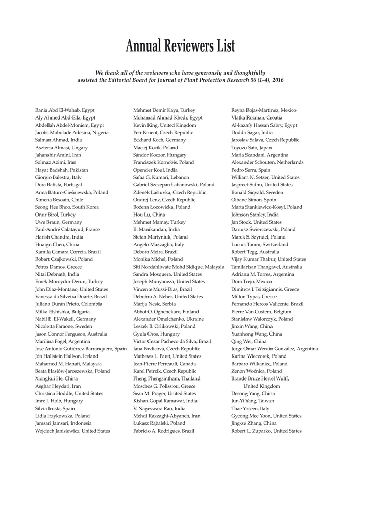Annual Reviewers List We thank all of the reviewers who have generously and thoughtfully assisted the Editorial Board for Journal of Plant Protection Research 56 (1–4), 2016 Rania Abd El-Wahab, Egypt Aly Ahmed Abd-Ella, Egypt Abdellah Abdel-Moniem, Egypt Jacobs Mobolade Adesina, Nigeria Salman Ahmad, India Aszteria Almasi, Ungary Jahanshir Amini, Iran Solmaz Azimi, Iran Hayat Badshah, Pakistan Giorgio Balestra, Italy Dora Batista, Portugal Anna Baturo-Cieśniewska, Poland Ximena Besoain, Chile Seong Hee Bhoo, South Korea Onur Birol, Turkey Uwe Braun, Germany Paul-André Calatayud, France Harish Chandra, India Huaign Chen, China Kamila Camara Correia, Brazil Robart Czajkowski, Poland Petros Damos, Greece Nitai Debnath, India Emek Moroydor Derun, Turkey John Diaz-Montano, United States Vanessa da Silveira Duarte, Brazil Juliana Durán Prieto, Colombia Milka Elshishka, Bulgaria Nabil E. El-Wakeil, Germany Nicoletta Faraone, Sweden Jason Connor Ferguson, Australia Marilina Fogel, Argentina Jose Antonio Gutiérrez-Barranquero, Spain Jόn Hallstein Hallson, Iceland Mahamed M. Hanafi, Malaysia Beata Hasiów-Jaroszewska, Poland Xiongkui He, China Asghar Heydari, Iran Christina Hoddle, United States Imre J. Holb, Hungary Silvia Irusta, Spain Lidia Irzykowska, Poland Jamsari Jamsari, Indonesia Wojciech Janisiewicz, United States Mehmet Demir Kaya, Turkey Mohamad Ahmad Khedr, Egypt Kevin King, United Kingdom Petr Kment, Czech Republic Eckhard Koch, Germany Maciej Kocik, Poland Sándor Koczor, Hungary Franciszek Kornobis, Poland Opender Koul, India Safaa G. Kumari, Lebanon Gabriel Szczepan Łabanowski, Poland Zdeněk Laštuvka, Czech Republic Ondrej Lenz, Czech Republic Bożena Łozowicka, Poland Hou Lu, China Mehmet Mamay, Turkey R. Manikandan, India Stefan Martyniuk, Poland Angelo Mazzaglia, Italy Debora Meira, Brazil Monika Michel, Poland Siti Nordahliwate Mohd Sidique, Malaysia Sandra Mosquera, United States Joseph Munyaneza, United States Vincente Mussi-Dias, Brazil Debohra A. Neher, United States Marija Nesic, Serbia Abbot O. Oghenekaro, Finland Alexander Omelchenko, Ukraine Leszek B. Orlikowski, Poland Gyula Oros, Hungary Victor Cezar Pacheco da Silva, Brazil Jana Pavlicová, Czech Republic Mathews L. Paret, United States Jean-Pierre Perreault, Canada Karel Petrzik, Czech Republic Pheng Phengsintham, Thailand Moschos G. Polissiou, Greece Sean M. Prager, United States Kishan Gopal Ramawat, India V. Nageswara Rao, India Mehdi Razzaghi-Abyaneh, Iran Łukasz Rąbalski, Poland Fabricio A. Rodrigues, Brazil Reyna Rojas-Martinez, Mexico Vlatka Rozman, Croatia Al-kazafy Hassan Sabry, Egypt Dodda Sagar, India Jaroslav Salava, Czech Republic Toyozo Sato, Japan Maria Scandani, Argentina Alexander Schouten, Netherlands Pedro Serra, Spain William N. Setzer, United States Jaspreet Sidhu, United States Ronald Siqvald, Sweden Oihane Simon, Spain Marta Stankiewicz-Kosyl, Poland Johnson Stanley, India Jan Stock, United States Dariusz Świerczewski, Poland Marek S. Szyndel, Poland Lucius Tamm, Switzerland Robert Tegg, Australia Vijay Kumar Thakur, United States Tamilarisan Thangavel, Australia Adriana M. Torres, Argentina Dora Trejo, Mexico Dimitros I. Tsitsigiannis, Greece Milton Typas, Greece Fernando Hercos Valicente, Brazil Pierre Van Custem, Belgium Stanisław Walorczyk, Poland Jinxin Wang, China Yuanhong Wang, China Qing Wei, China Jorge Omar Werdin González, Argentina Karina Wieczorek, Poland Barbara Wilkaniec, Poland Zenon Woźnica, Poland Brande Bruce Hertel Wulff, United Kingdom Desong Yang, China Jun-Yi Yang, Taiwan Thae Yaseen, Italy Gyeong Mee Yoon, United States Jing-ze Zhang, China Robert L. Zuparko, United States