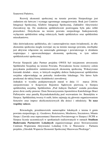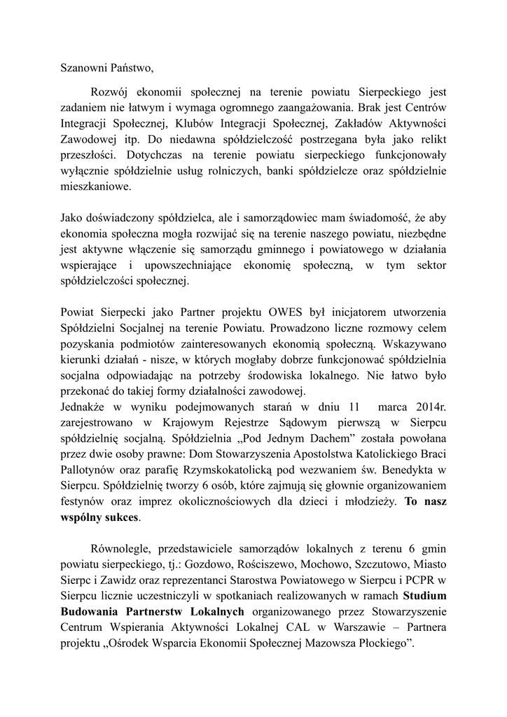 Szanowni Państwo, Rozwój ekonomii społecznej na terenie powiatu Sierpeckiego jest zadaniem nie łatwym i wymaga ogromnego zaangażowania. Brak jest Centrów Integracji Społecznej, Klubów Integracji Społecznej, Zakładów Aktywności Zawodowej itp. Do niedawna spółdzielczość postrzegana była jako relikt przeszłości. Dotychczas na terenie powiatu sierpeckiego funkcjonowały wyłącznie spółdzielnie usług rolniczych, banki spółdzielcze oraz spółdzielnie mieszkaniowe. Jako doświadczony spółdzielca, ale i samorządowiec mam świadomość, że aby ekonomia społeczna mogła rozwijać się na terenie naszego powiatu, niezbędne jest aktywne włączenie się samorządu gminnego i powiatowego w działania wspierające i upowszechniające ekonomię społeczną, w tym sektor spółdzielczości społecznej. Powiat Sierpecki jako Partner projektu OWES był inicjatorem utworzenia Spółdzielni Socjalnej na terenie Powiatu. Prowadzono liczne rozmowy celem pozyskania podmiotów zainteresowanych ekonomią społeczną. Wskazywano kierunki działań - nisze, w których mogłaby dobrze funkcjonować spółdzielnia socjalna odpowiadając na potrzeby środowiska lokalnego. Nie łatwo było przekonać do takiej formy działalności zawodowej. Jednakże w wyniku podejmowanych starań w dniu 11 marca 2014r. zarejestrowano w Krajowym Rejestrze Sądowym pierwszą w Sierpcu spółdzielnię socjalną. Spółdzielnia „Pod Jednym Dachem” została powołana przez dwie osoby prawne: Dom Stowarzyszenia Apostolstwa Katolickiego Braci Pallotynów oraz parafię Rzymskokatolicką pod wezwaniem św. Benedykta w Sierpcu. Spółdzielnię tworzy 6 osób, które zajmują się głownie organizowaniem festynów oraz imprez okolicznościowych dla dzieci i młodzieży. To nasz wspólny sukces. Równolegle, przedstawiciele samorządów lokalnych z terenu 6 gmin powiatu sierpeckiego, tj.: Gozdowo, Rościszewo, Mochowo, Szczutowo, Miasto Sierpc i Zawidz oraz reprezentanci Starostwa Powiatowego w Sierpcu i PCPR w Sierpcu licznie uczestniczyli w spotkaniach realizowanych w ramach Studium Budowania Partnerstw Lokalnych organizowanego przez Stowarzyszenie Centrum Wspierania Aktywności Lokalnej CAL w Warszawie – Partnera projektu „Ośrodek Wsparcia Ekonomii Społecznej Mazowsza Płockiego”. Był to dobrze wykorzystany czas na wymianę doświadczeń i poglądów na temat szans i zagrożeń dotyczących budowania partnerstw wokół różnych inicjatyw społecznych. Jestem przekonany, że wspólnie wypracowane pomysły, inicjatywy w ramach Studium Budowania Partnerstw zostaną wykorzystane w nowym okresie programowania 2014-2020 w postaci konkretnych projektów socjalnych realizowanych na terenie Powiatu Sierpeckiego. Ekonomia społeczna - spółdzielczość socjalna udaje się wtedy, gdy angażują się w nią wszyscy aktorzy życia społecznego w środowisku lokalnym. Mając tę ideę na myśli w grudniu 2013 roku zawiązano Porozumienie o współpracy partnerskiej na rzecz wsparcia i rozwoju ekonomii społecznej oraz współpracy trójsektorowej w powiecie sierpeckim. Porozumienie podpisały wszystkie samorządy gminne z terenu powiatu, przedsiębiorcy i organizacje pozarządowe. Celem Partnerstwa „Powiat Sierpecki – Społecznie Odpowiedzialny” było i jest włączanie przedstawicieli sektora publicznego, prywatnego i pozarządowego w działania służące rozwojowi sektora ekonomii społecznej w powiecie sierpeckim poprzez: a) wzrost zaangażowania sektora publicznego i prywatnego we współpracę z podmiotami ekonomii społecznej, b) budowanie pozytywnego klimatu dla rozwoju Podmiotów Ekonomii Społecznej oraz promocji Społecznie Odpowiedzialnego Biznesu i Społecznie Odpowiedzialnego Samorządu, c) podniesienie wiedzy przedsiębiorców i samorządów na temat społecznej odpowiedzialności oraz korzyści płynących ze współpracy z podmiotami ekonomii społecznej, d) wypracowanie i promocję katalogu dobrych praktyk w obszarze społecznie odpowiedzialnej ekonomii społecznej, społecznie odpowiedzialnego biznesu i społecznie odpowiedzialnego samorządu, e) wykreowanie pozytywnego wizerunku ekonomii społecznej, f) zwiększenie udziału przedsiębiorców w rozwiązywaniu lokalnych problemów społecznych, g) rozwój kompetencji organizacji pozarządowych i ich liderów. Ważnym wydarzeniem było zorganizowane seminarium. Dnia 11.06.2014 r. w Muzeum Wsi Mazowieckiej w Sierpcu w ramach projektu OWES zorganizowano spotkanie pn. „Zatrudnienie w sektorze ekonomii społecznej”, które było okazją do propagowanie spółdzielczości socjalnej wśród mieszkańców powiatu. W spotkaniu licznie wzięli udział: przedstawiciele organizacji pozarządowych, członkowie spółdzielni socjalnych, członkowie banków spółdzielczych z terenu powiatu, przedstawiciele spółdzielni usług rolniczych, Koła Gospodyń Wiejskich, Ochotnicze Straże Pożarne, przedstawiciele samorządu. Seminarium stało się okazją do zaprezentowania spółdzielczość w powiecie oraz pokazania dobrych praktyk w zakresie współpracy samorządu z podmiotami ekonomii społecznej w ramach zlecania zadań. Trzeba przyznać, że tradycje spółdzielczości w powiecie Sierpeckim są silne i dają solidną podstawę rozwoju spółdzielczości socjalnej. Chciałbym podkreślić, jak ogromną rolę w rozwoju ekonomii społecznej odgrywa świadome kupowanie usług czy też wspieranie promocyjne swoich podmiotów. Dlatego też świadczenie usług w ramach seminarium powierzono podmiotom ekonomii społecznej: Zakład Aktywności Zawodowej w Stanisławowie przygotował catering, a Spółdzielnia Socjalna Kreatywni z Bydgoszczy świadczyła obsługę merytoryczną seminarium. W ramach partnerstwa „Powiat Sierpecki – Powiat Społecznie odpowiedzialny” w porozumieniu z lokalnym Stowarzyszeniem Kre@ktywni Powiat współorganizował następujące oddolne inicjatywy społeczne: - festyn sportowy w Rościszewie pod hasłem „W zdrowym c