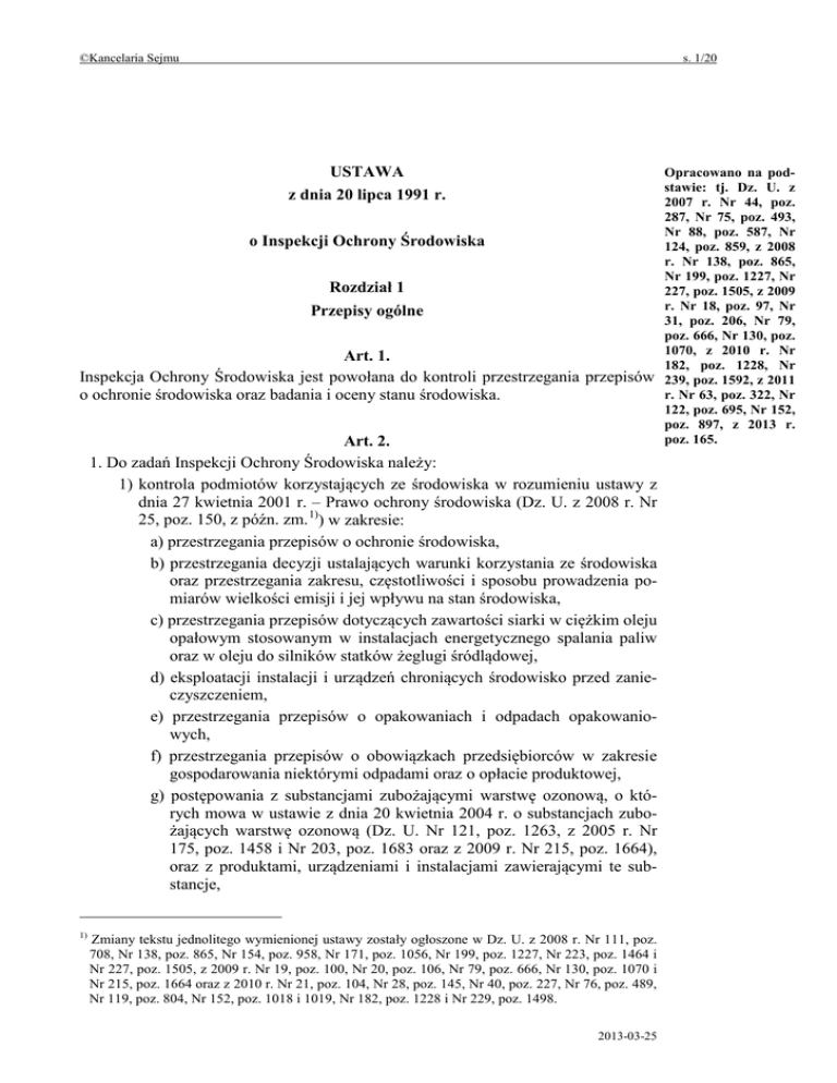 ©Kancelaria Sejmu s. 1/20 USTAWA z dnia 20 lipca 1991 r. o Inspekcji Ochrony Środowiska Rozdział 1 Przepisy ogólne Art. 1. Inspekcja Ochrony Środowiska jest powołana do kontroli przestrzegania przepisów o ochronie środowiska oraz badania i oceny stanu środowiska. Art. 2. 1. Do zadań Inspekcji Ochrony Środowiska należy: 1) kontrola podmiotów korzystających ze środowiska w rozumieniu ustawy z dnia 27 kwietnia 2001 r. – Prawo ochrony środowiska (Dz. U. z 2008 r. Nr 25, poz. 150, z późn. zm. 1)) w zakresie: a) przestrzegania przepisów o ochronie środowiska, b) przestrzegania decyzji ustalających warunki korzystania ze środowiska oraz przestrzegania zakresu, częstotliwości i sposobu prowadzenia pomiarów wielkości emisji i jej wpływu na stan środowiska, c) przestrzegania przepisów dotyczących zawartości siarki w ciężkim oleju opałowym stosowanym w instalacjach energetycznego spalania paliw oraz w oleju do silników statków żeglugi śródlądowej, d) eksploatacji instalacji i urządzeń chroniących środowisko przed zanieczyszczeniem, e) przestrzegania przepisów o opakowaniach i odpadach opakowaniowych, f) przestrzegania przepisów o obowiązkach przedsiębiorców w zakresie gospodarowania niektórymi odpadami oraz o opłacie produktowej, g) postępowania z substancjami zubożającymi warstwę ozonową, o których mowa w ustawie z dnia 20 kwietnia 2004 r. o substancjach zubożających warstwę ozonową (Dz. U. Nr 121, poz. 1263, z 2005 r. Nr 175, poz. 1458 i Nr 203, poz. 1683 oraz z 2009 r. Nr 215, poz. 1664), oraz z produktami, urządzeniami i instalacjami zawierającymi te substancje, 1) Zmiany tekstu jednolitego wymienionej ustawy zostały ogłoszone w Dz. U. z 2008 r. Nr 111, poz. 708, Nr 138, poz. 865, Nr 154, poz. 958, Nr 171, poz. 1056, Nr 199, poz. 1227, Nr 223, poz. 1464 i Nr 227, poz. 1505, z 2009 r. Nr 19, poz. 100, Nr 20, poz. 106, Nr 79, poz. 666, Nr 130, poz. 1070 i Nr 215, poz. 1664 oraz z 2010 r. Nr 21, poz. 104, Nr 28, poz. 145, Nr 40, poz. 227, Nr 76, poz. 489, Nr 119, poz. 804, Nr 152, poz. 1018 i 1019, Nr 182, poz. 1228 i Nr 229, poz. 1498. 2013-03-25 Opracowano na podstawie: tj. Dz. U. z 2007 r. Nr 44, poz. 287, Nr 75, poz. 493, Nr 88, poz. 587, Nr 124, poz. 859, z 2008 r. Nr 138, poz. 865, Nr 199, poz. 1227, Nr 227, poz. 1505, z 2009 r. Nr 18, poz. 97, Nr 31, poz. 206, Nr 79, poz. 666, Nr 130, poz. 1070, z 2010 r. Nr 182, poz. 1228, Nr 239, poz. 1592, z 2011 r. Nr 63, poz. 322, Nr 122, poz. 695, Nr 152, poz. 897, z 2013 r. poz. 165. ©Kancelaria Sejmu h) przestrzegania przepisów i uzyskanych na ich podstawie zezwoleń, z wyłączeniem kontroli laboratoryjnej, w zakresie postępowania z organizmami genetycznie zmodyfikowanymi, i) przestrzegania przepisów o recyklingu pojazdów wycofanych z eksploatacji, j) przestrzegania przepisów o zużytym sprzęcie elektrycznym i elektronicznym, z wyjątkiem przepisów art. 41 pkt 2 i 3 ustawy z dnia 29 lipca 2005 r. o zużytym sprzęcie elektrycznym i elektronicznym (Dz. U. Nr 180, poz. 1495, z 2008 r. Nr 223, poz. 1464 oraz z 2009 r. Nr 79, poz. 666 i Nr 215, poz. 1664), k) przestrzegania przepisów o bateriach i akumulatorach, z wyjątkiem przestrzegania przez sprzedawców detalicznych i sprzedawców hurtowych przepisów art. 8, art. 9, art. 10 ust. 1, art. 11, art. 31 ust. 3, art. 48–50, art. 53 oraz art. 54 ust. 1 i 2 ustawy z dnia 24 kwietnia 2009 r. o bateriach i akumulatorach (Dz. U. Nr 79, poz. 666); 1a) kontrola przestrzegania przepisów ustawy z dnia 13 września 1996 r. o utrzymaniu czystości i porządku w gminach (Dz. U. z 2005 r. Nr 236, poz. 2008, z późn. zm. 2)); 2) prowadzenie państwowego monitoringu środowiska, w szczególności: a) opracowywanie programów państwowego monitoringu środowiska, b) koordynacja realizacji zadań państwowego monitoringu środowiska, c) gromadzenie informacji o środowisku w zakresie ujętym w programach państwowego monitoringu środowiska, d) przetwarzanie zgromadzonych informacji o środowisku i dokonywanie ocen stanu środowiska, e) opracowywanie raportów o stanie środowiska, f) udział w międzynarodowej wymianie informacji o stanie środowiska, w tym koordynacja współpracy z Europejską Agencją Środowiska, o której mowa w rozporządzeniu Parlamentu Europejskiego i Rady (WE) nr 401/2009 z dnia 23 kwietnia 2009 r. w sprawie Europejskiej Agencji Środowiska oraz Europejskiej Sieci Informacji i Obserwacji Środowiska (Dz. Urz. UE L 126 z 21.05.2009, str. 13); 3) podejmowanie decyzji wstrzymujących działalność prowadzoną z naruszeniem wymagań związanych z ochroną środowiska lub naruszeniem warunków korzystania ze środowiska; 4) przeciwdziałanie poważnym awariom oraz sprawowanie nadzoru nad usuwaniem ich skutków; 5) wykonywanie zadań związanych ze zbieraniem danych do Europejskiego Rejestru Uwalniania i Transferu Zanieczyszczeń oraz prowadzeniem Krajowego Rejestru Uwalniania i Transferu Zanieczyszczeń; 6) wykonywanie zadań określonych w ustawie z dnia 3 października 2008 r. o udostępnianiu informacji o środowisku i jego ochronie, udziale społeczeń- 2) Zmiany tekstu jednolitego wymienionej ustawy zostały ogłoszone w Dz. U. z 2006 r. Nr 144, poz. 1042, z 2008 r. Nr 223, poz. 1464, z 2009 r. Nr 18, poz. 97, Nr 79, poz. 666, Nr 92, poz. 753 i Nr 215, poz. 1664, z 2010 r. Nr 47, poz. 278 oraz z 2011 r. Nr 5, poz. 13, Nr 106, poz. 622 i Nr 152, poz. 897. 2013-03-25 s. 2/20 ©Kancelaria Sejmu stwa w ochronie środowiska oraz o ocenach oddziaływania na środowisko (Dz. U. Nr 199, poz. 1227, z późn. zm. 3)); 7) udział w przekazywaniu do użytkowania obiektów lub instalacji realizowanych jako przedsięwzięcia mogące zawsze znacząco lub potencjalnie znacząco oddziaływać na środowisko; 8) wykonywanie zadań w zakresie zapobiegania szkodom w środowisku i ich naprawy; 9) wykonywanie zadań określonych w przepisach o międzynarodowym przemieszczaniu odpadów; 10) wykonywanie zadań określonych w ustawie z d