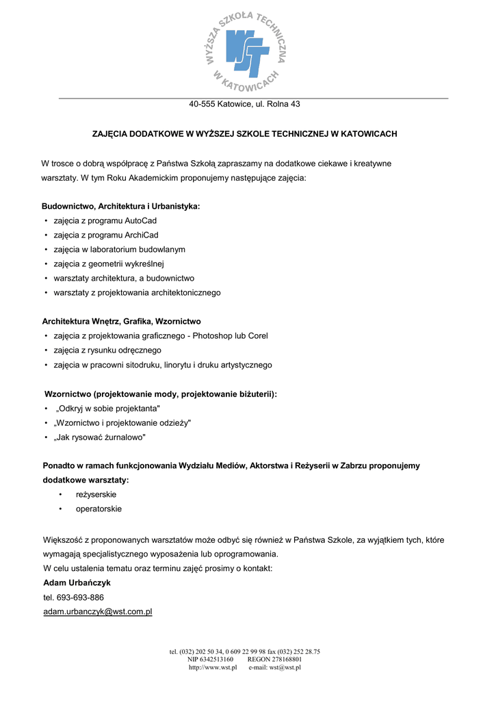 40-555 Katowice, ul. Rolna 43 ZAJĘCIA DODATKOWE W WYŻSZEJ SZKOLE TECHNICZNEJ W KATOWICACH W trosce o dobrą współpracę z Państwa Szkołą zapraszamy na dodatkowe ciekawe i kreatywne warsztaty. W tym Roku Akademickim proponujemy następujące zajęcia: Budownictwo, Architektura i Urbanistyka: • zajęcia z programu AutoCad • zajęcia z programu ArchiCad • zajęcia w laboratorium budowlanym • zajęcia z geometrii wykreślnej • warsztaty architektura, a budownictwo • warsztaty z projektowania architektonicznego Architektura Wnętrz, Grafika, Wzornictwo • zajęcia z projektowania graficznego - Photoshop lub Corel • zajęcia z rysunku odręcznego • zajęcia w pracowni sitodruku, linorytu i druku artystycznego Wzornictwo (projektowanie mody, projektowanie biżuterii): • „Odkryj w sobie projektanta" • „Wzornictwo i projektowanie odzieży" • „Jak rysować żurnalowo" Ponadto w ramach funkcjonowania Wydziału Mediów, Aktorstwa i Reżyserii w Zabrzu proponujemy dodatkowe warsztaty: • reżyserskie • operatorskie Większość z proponowanych warsztatów może odbyć się również w Państwa Szkole, za wyjątkiem tych, które wymagają specjalistycznego wyposażenia lub oprogramowania. W celu ustalenia tematu oraz terminu zajęć prosimy o kontakt: Adam Urbańczyk tel. 693-693-886 [email protected] tel. (032) 202 50 34, 0 609 22 99 98 fax (032) 252 28.75 NIP 6342513160 REGON 278168801 http://www.wst.pl e-mail: [email protected]