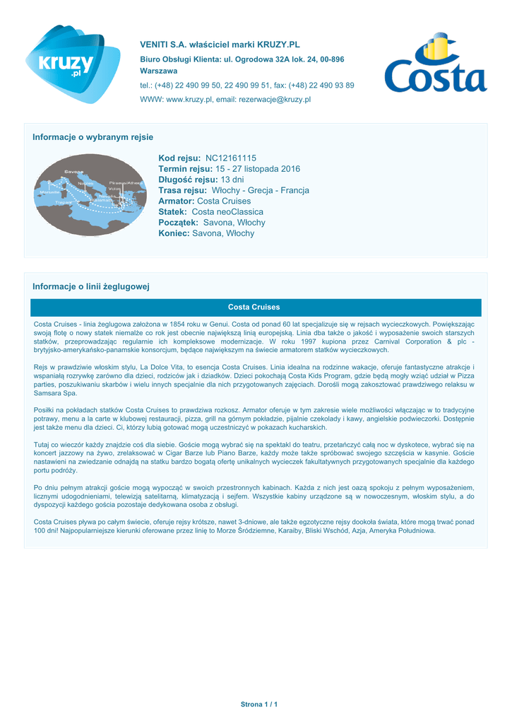 Powered by TCPDF (www.tcpdf.org) VENITI S.A. właściciel marki KRUZY.PL Biuro Obsługi Klienta: ul. Ogrodowa 32A lok. 24, 00-896 Warszawa tel.: (+48) 22 490 99 50, 22 490 99 51, fax: (+48) 22 490 93 89 WWW: www.kruzy.pl, email: [email protected] Informacje o wybranym rejsie Kod rejsu: NC12161115 Termin rejsu: 15 - 27 listopada 2016 Długość rejsu: 13 dni Trasa rejsu: Włochy - Grecja - Francja Armator: Costa Cruises Statek: Costa neoClassica Początek: Savona, Włochy Koniec: Savona, Włochy Informacje o linii żeglugowej Costa Cruises Costa Cruises - linia żeglugowa założona w 1854 roku w Genui. Costa od ponad 60 lat specjalizuje się w rejsach wycieczkowych. Powiększając swoją flotę o nowy statek niemalże co rok jest obecnie największą linią europejską. Linia dba także o jakość i wyposażenie swoich starszych statków, przeprowadzając regularnie ich kompleksowe modernizacje. W roku 1997 kupiona przez Carnival Corporation & plc brytyjsko-amerykańsko-panamskie konsorcjum, będące największym na świecie armatorem statków wycieczkowych. Rejs w prawdziwie włoskim stylu, La Dolce Vita, to esencja Costa Cruises. Linia idealna na rodzinne wakacje, oferuje fantastyczne atrakcje i wspaniałą rozrywkę zarówno dla dzieci, rodziców jak i dziadków. Dzieci pokochają Costa Kids Program, gdzie będą mogły wziąć udział w Pizza parties, poszukiwaniu skarbów i wielu innych specjalnie dla nich przygotowanych zajęciach. Dorośli mogą zakosztować prawdziwego relaksu w Samsara Spa. Posiłki na pokładach statków Costa Cruises to prawdziwa rozkosz. Armator oferuje w tym zakresie wiele możliwości włączając w to tradycyjne potrawy, menu a la carte w klubowej restauracji, pizza, grill na górnym pokładzie, pijalnie czekolady i kawy, angielskie podwieczorki. Dostępnie jest także menu dla dzieci. Ci, którzy lubią gotować mogą uczestniczyć w pokazach kucharskich. Tutaj co wieczór każdy znajdzie coś dla siebie. Goście mogą wybrać się na spektakl do teatru, przetańczyć całą noc w dyskotece, wybrać się na koncert jazzowy na żywo, zrelaksować w Cigar Barze lub Piano Barze, każdy może także spróbować swojego szczęścia w kasynie. Goście nastawieni na zwiedzanie odnajdą na statku bardzo bogatą ofertę unikalnych wycieczek fakultatywnych przygotowanych specjalnie dla każdego portu podróży. Po dniu pełnym atrakcji goście mogą wypocząć w swoich przestronnych kabinach. Każda z nich jest oazą spokoju z pełnym wyposażeniem, licznymi udogodnieniami, telewizją satelitarną, klimatyzacją i sejfem. Wszystkie kabiny urządzone są w nowoczesnym, włoskim stylu, a do dyspozycji każdego gościa pozostaje dedykowana osoba z obsługi. Costa Cruises pływa po całym świecie, oferuje rejsy krótsze, nawet 3-dniowe, ale także egzotyczne rejsy dookoła świata, które mogą trwać ponad 100 dni! Najpopularniejsze kierunki oferowane przez linię to Morze Śródziemne, Karaiby, Bliski Wschód, Azja, Ameryka Południowa. Strona 1 / 1
