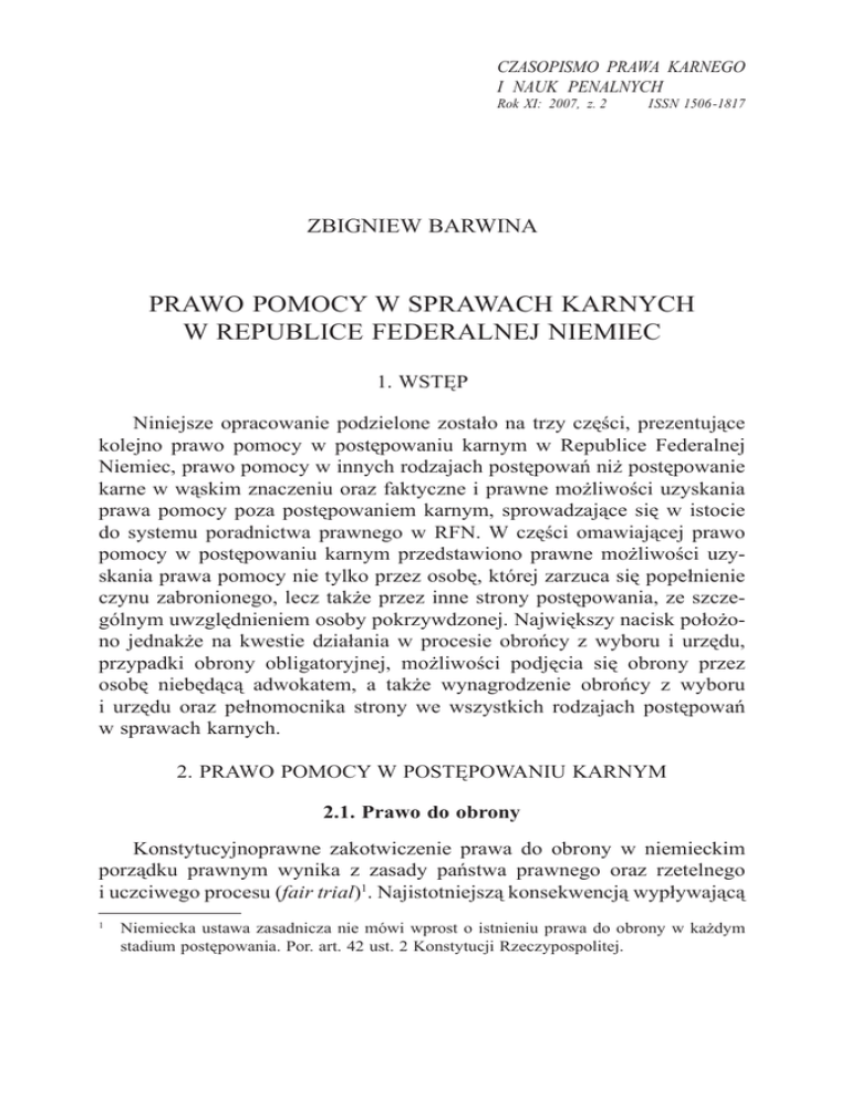 CZASOPISMO PRAWA KARNEGO I NAUK PENALNYCH Rok XI: 2007, z. 2 ISSN 1506-1817 ZBIGNIEW BARWINA PRAWO POMOCY W SPRAWACH KARNYCH W REPUBLICE FEDERALNEJ NIEMIEC 1. WSTĘP Niniejsze opracowanie podzielone zostało na trzy części, prezentujące kolejno prawo pomocy w postępowaniu karnym w Republice Federalnej Niemiec, prawo pomocy w innych rodzajach postępowań niż postępowanie karne w wąskim znaczeniu oraz faktyczne i prawne możliwości uzyskania prawa pomocy poza postępowaniem karnym, sprowadzające się w istocie do systemu poradnictwa prawnego w RFN. W części omawiającej prawo pomocy w postępowaniu karnym przedstawiono prawne możliwości uzyskania prawa pomocy nie tylko przez osobę, której zarzuca się popełnienie czynu zabronionego, lecz także przez inne strony postępowania, ze szczególnym uwzględnieniem osoby pokrzywdzonej. Największy nacisk położono jednakże na kwestie działania w procesie obrońcy z wyboru i urzędu, przypadki obrony obligatoryjnej, możliwości podjęcia się obrony przez osobę niebędącą adwokatem, a także wynagrodzenie obrońcy z wyboru i urzędu oraz pełnomocnika strony we wszystkich rodzajach postępowań w sprawach karnych. 2. PRAWO POMOCY W POSTĘPOWANIU KARNYM 2.1. Prawo do obrony Konstytucyjnoprawne zakotwiczenie prawa do obrony w niemieckim porządku prawnym wynika z zasady państwa prawnego oraz rzetelnego i uczciwego procesu (fair trial)1. Najistotniejszą konsekwencją wypływającą 1 Niemiecka ustawa zasadnicza nie mówi wprost o istnieniu prawa do obrony w każdym stadium postępowania. Por. art. 42 ust. 2 Konstytucji Rzeczypospolitej. 204 Zbigniew Barwina z prawa do obrony2 jest możliwość korzystania w procesie karnym z pomocy obrońcy. Prawo to wynika również z art. 14 ust. 3 lit. d Międzynarodowego Paktu Praw Obywatelskich i Politycznych oraz z art. 6 ust. 3 lit. c Europejskiej Konwencji Praw Człowieka. W niemieckiej literaturze prawniczej rozróżniana jest obrona formalna (czyli korzystanie w procesie z pomocy obrońcy) i materialna (oznaczająca dokonywanie w procesie — przede wszystkim przez obrońcę w znaczeniu formalnym — czynności na korzyść obwinionego3 lub oskarżonego). Kwestie obrony formalnej w procesie karnym regulują przepisy § 137–149 niemieckiego kodeksu karnego (Strafprozessordnung4, dalej: StPO). Zgodnie z panującą w niemieckiej literaturze teorią organu (Organtheorie), obrońca w procesie karnym spełnia dwie funkcje. Jest on po pierwsze wyposażonym w specjalne kompetencje i równorzędnym z sędzią i prokuratorem „organem wymiaru sprawiedliwości”5, a poza tym reprezentantem oskarżonego i obrońcą jego interesów w procesie6. 2.1.1. Kto może pełnić funkcję obrońcy? Zgodnie z § 138 ust. 1 StPO, obrońcą z wyboru mogą być jedynie dopuszczeni do działania przed niemieckim sądem adwokaci, a także akademiccy nauczyciele na wydziale prawa niemieckiej szkoły wyższej z uprawnieniami do wykonywania zawodu sędziego oraz w stopniu doktora habilitowanego. Działalność nauczycieli akademickich jako obrońców jest jednakże w praktyce procesu karnego rzadkością. Adwokaci i nauczyciele akademiccy tworzą 2 3 4 5 6 Chodzi o formalny aspekt prawa do obrony. W niemieckiej — podobnie jak w polskiej — doktrynie procesu karnego wyróżniana jest tzw. obrona materialna (sprowadzająca się do wszelkich czynności procesowych nakierowanych na obronę interesów oskarżonego) i formalna (korzystanie z pomocy obrońcy). Por. S. W a l t o ś, Proces karny, Warszawa 2005, nb. 496–510; W. B e u l k e, Strafprozessrecht, wyd. 8, Heidelberg 2005, nb. 147 i n. W niemieckim procesie karnym obwiniony, to osoba, której postawiono zarzut popełnienia przestępstwa. Ustawa z dn. 12 VIII 1950 r., BGBl. 1950, s. 455, 512, 629. Zob. „Entscheidungen des Bundesverfassungsgerichts” (dalej: BverfGE) 39, s. 159 i n.; BverfGE 29, s. 106; BverfGE 38, s. 119 oraz § 1 Bundesrechtsanwaltsordnung (dalej: BRAO) („Adwokat jest niezależnym organem wymiaru sprawiedliwości”). Zgodnie z tzw. teorią interesu (Interessentheorie) obrońca w sprawie karnej jest zobowiązany do działania w ramach przyznanych mu kompetencji tylko i wyłącznie na korzyść mocodawcy, bez konieczności zważania na potrzeby wymiaru sprawiedliwości i państwa prawa. Teoria umowy (Vertragstheorie) traktuje obronę w sprawach karnych wyłącznie w aspekcie cywilnoprawnym (§ 134 Bürgerliches Gesetzbuch, dalej: BGB), a nie publicznoprawnym. Prawo pomocy w sprawach karnych w Republice Federalnej Niemiec 205 grupę tzw. „pełnych obrońców” (Vollverteidiger), gdyż ich działalność nie jest ograniczona ze względu na charakter spraw oraz nie wymaga pozwolenia sądu, ani zgody innego adwokata. W porównaniu do regulacji niemieckich polski proces karny daje kompetencje do obrony w procesie karnym węższej liczbie podmiotów7. W określonych wypadkach czynności obrońcy wykonywać mogą również referendarze, tzn. osoby, które po ukończeniu studiów prawniczych zdały pierwszy egzamin państwowy (das erste Staatsexamen) i uczestniczą w obowiązkowych praktykach poprzedzających drugi egzamin państwowy (das zweite Staatsexamen), którego pozytywne złożenie jest równoznaczne z uzyskaniem uprawnień do wykonywania zawodu sędziego, a co za tym idzie — również adwokata. Referendariat jest odpowiednikiem aplikacji adwokackiej w Polsce. W porównaniu ze stosownymi regulacjami polskimi możliwości wykonywania czynności obrońcy w procesie karnym są dla niemieckich referendarzy znacznie ograniczone. Zgodnie z § 139 StPO, adwokat wybrany jako obrońca z wyboru może za zgodą tego, kto go wybrał, przenieść swój mandat na referendarza, który zdał pierwszy egzamin państwowy oraz od roku i trzech miesięcy praktykuje w instytucjach prawniczych (Justizdienst). Występowanie referendarzy jako obrońców na mocy § 139 StPO stanowi w praktyce rzadki przypadek. Na mocy § 142 ust. 2 StPO, w przypadkach