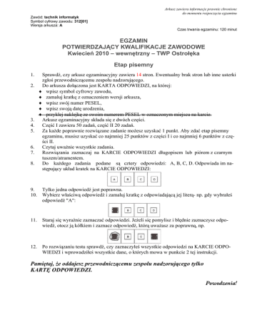Arkusz zawiera informacje prawnie chronione do momentu rozpoczęcia egzaminu Zawód: technik informatyk Symbol cyfrowy zawodu: 312[01] Wersja arkusza: A Czas trwania egzaminu: 120 minut EGZAMIN POTWIERDZAJĄCY KWALIFIKACJE ZAWODOWE Kwiecień 2010 – wewnętrzny – TWP Ostrołęka Etap pisemny 1. 2. 3. 4. 5. 6. 7. 8. Sprawdź, czy arkusz egzaminacyjny zawiera 14 stron. Ewentualny brak stron lub inne usterki zgłoś przewodniczącemu zespołu nadzorującego. Do arkusza dołączona jest KARTA ODPOWIEDZI, na której: ♦ wpisz symbol cyfrowy zawodu, ♦ zamaluj kratkę z oznaczeniem wersji arkusza, ♦ wpisz swój numer PESEL, ♦ wpisz swoją datę urodzenia, ♦ przyklej naklejkę ze swoim numerem PESEL w oznaczonym miejscu na karcie. Arkusz egzaminacyjny składa się z dwóch części. Część I zawiera 50 zadań, część II 20 zadań. Za każde poprawnie rozwiązane zadanie możesz uzyskać 1 punkt. Aby zdać etap pisemny egzaminu, musisz uzyskać co najmniej 25 punktów z części I i co najmniej 6 punktów z części II. Czytaj uważnie wszystkie zadania. Rozwiązania zaznaczaj na KARCIE ODPOWIEDZI długopisem lub piórem z czarnym tuszem/atramentem. Do każdego zadania podane są cztery odpowiedzi: A, B, C, D. Odpowiada im następujący układ kratek na KARCIE ODPOWIEDZI: 9. 10. Tylko jedna odpowiedź jest poprawna. Wybierz właściwą odpowiedź i zamaluj kratkę z odpowiadającą jej literą- np. gdy wybrałeś odpowiedź "A": 11. Staraj się wyraźnie zaznaczać odpowiedzi. Jeżeli się pomylisz i błędnie zaznaczysz odpowiedź, otocz ją kółkiem i zaznacz odpowiedź, którą uważasz za poprawną, np. 12. Po rozwiązaniu testu sprawdź, czy zaznaczyłeś wszystkie odpowiedzi na KARCIE ODPOWIEDZI i wprowadziłeś wszystkie dane, o których mowa w punkcie 2 tej instrukcji. Pamiętaj, że oddajesz przewodniczącemu zespołu nadzorującego tylko KARTĘ ODPOWIEDZI. Powodzenia! CZĘŚĆ I 1. Nagłówek funkcji: int funkcja(void); wskazuje na to, że ta funkcja a) b) c) d) Nie ma parametru i zwraca wartość na zewnątrz, Nie ma parametru i nie zwraca wartości na zewnątrz, Ma parametr o nazwie void i zwraca wartości na zewnątrz, Ma parametr o nazwie void i nie zwraca wartości na zewnątrz. 2. W języku ANSI C łańcuch wprowadza się za pomocą specyfikatora a) b) c) d) %d %I %c %s 3. W wyniku wykonania zamieszczonego programu, na ekranie monitora wyświetlane są następujące liczby: a) 0, 2, 4, 6 b) 2, 3, 4, 5 c) 0, 1 2, 3 d) 3, 4, 5, 6 program liczby; uses crt; var i : integer; begin for i := 0 to 6 do for (i mod 2) = 0 then write(i); end. 4. Przeanalizuj zamieszczony schemat blokowy i wskaż, które polecenie w języku C++ zostało na nim przedstawione. a) if … b) for … c) while …. d) do …. while …. 5. Która z wymienionych instrukcji w języku C++ służy do wyprowadzania łańcucha s? a) s << cout; b) s >> cout; c) cout << s; d) cout >> s; 6. Po wykonaniu instrukcji zamieszczonych w tabeli, na ekranie monitora: a) Nic się nie wyświetli b) Wyświetli się napis stop c) Wyświetli się napis koniec d) Wyświetli się napis start 2 7. Z których słów kluczowych w języku C++ wiąże się pojęcie hermetyzacja danych? a) Static b) Volatile c) Constant d) Protected 8. Przekazywanie parametrów funkcji tzw. Referencję, pozwala tej funkcji na: a) komunikowanie się z drukarką b) usuwanie zmiennych dynamicznych c) przypisanie parametrom wartości typu rzeczywistego d) modyfikowanie wartości zmiennych znajdujących się poza ta funkcją 9. W zmiennej ma być przechowywana informacja w postaci liczbowej o numerze dnia w danym miesiącu. Który z typów Pascal należy zastosować, aby kompilator zarezerwował najmniejszą ilość pamieci? a) Char b) Byte c) Real d) Integer 10. Ile gwiazdek wydrukuje się po użyciu następującej sekwencji instrukcji w języku Turbo Pascal? a) 1 b) 4 c) 7 k:= 25; for i := 1 to (k mod 7) do write(‘*’); d) 25 11. Rekordy danej bazy danych różnią się między sobą a) strukturą (projektem) b) treścią danych zawartych w polach c) nazwami pól d) liczbą pól składającą się na dany rekord 12. Sumą dwóch liczb binarnych jest 1101011 i 1001001 jest liczba dziesiętna a) 402 b) 201 c) 180 d) 170 3 13. W sieci lokalnej zainstalowano serwer, który ma za zadanie przydzielanie dynamicznego adresu IP. Jaka usługa musi być uruchomiona na tym serwerze? a) b) c) d) DHCP DNS ISA DCHP 14. Numer przerwania przydzielony dla karty sieciowej został przedstawiony w postaci binarnej jako liczba 10101. Jaka to liczba dziesiętna? a) b) c) d) 15 41 20 21 15. We właściwościach karty graficznej w zakładce Zasoby jest określony jeden z zakresów pamięci dla tej karty od A0000h do BFFFFh. Wielkość ta oznacza obszar pamięci określony adresem fizycznym: a) b) c) d) 1100 1111 1111 1111 1111 - 1110 1111 1111 1111 1111 1011 0000 0000 0000 0000 - 1100 1111 1111 1111 1111 1001 1111 1111 1111 1111 - 1010 0000 0000 0000 0000 1010 0000 0000 0000 0000 - 1011 1111 1111 1111 1111 16. POP3 jest: a) b) c) d) protokołem odbierania e-mail. programem pocztowym Serwerem pocztowym Protokołem wysyłania e-mail 17. Licencja OEM to: a) licencja uprawniająca użytkownika do zainstalowania nabytego oprogramowania tylko w jednym komputerze, obejmująca zakaz udostępniania takiego oprogramowania w sieci oraz na innych wolnostojących komputerach b) licencja czyniąca z oprogramowania własność ogółu, w myśl której autor lub autorzy oprogramowania zrzekają się praw do upowszechniania oprogramowania na rzecz ogółu użytkowników. c) licencja oprogramowania wyłącznie na system komputerowy, na którym zostało oryginalnie zainstalowane, dotyczy oprogramowania sprzedawanego z nowymi komputerami lub odpowiednimi częściami. d) dokument, który zezwala na używanie oprogramowania na dowolnym sprzęcie komputerowym w określonej w niej ilości stanowisk, bez instalacyjnych dyskietek, czy krążków CD 18. Procesor RISC to procesor: a) b) c) d) z p
