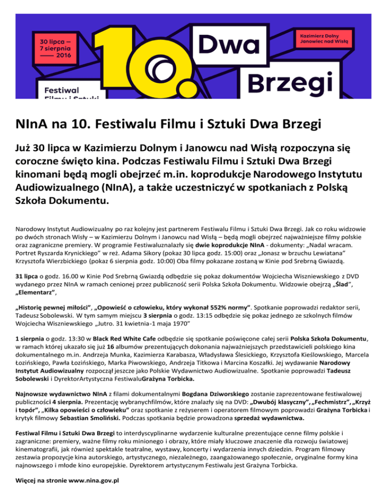NInA na 10. Festiwalu Filmu i Sztuki Dwa Brzegi Już 30 lipca w Kazimierzu Dolnym i Janowcu nad Wisłą rozpoczyna się coroczne święto kina. Podczas Festiwalu Filmu i Sztuki Dwa Brzegi kinomani będą mogli obejrzeć m.in. koprodukcje Narodowego Instytutu Audiowizualnego (NInA), a także uczestniczyć w spotkaniach z Polską Szkoła Dokumentu. Narodowy Instytut Audiowizualny po raz kolejny jest partnerem Festiwalu Filmu i Sztuki Dwa Brzegi. Jak co roku widzowie po dwóch stronach Wisły – w Kazimierzu Dolnym i Janowcu nad Wisłą – będą mogli obejrzeć najważniejsze filmy polskie oraz zagraniczne premiery. W programie Festiwaluznalazły się dwie koprodukcje NInA - dokumenty: „Nadal wracam. Portret Ryszarda Krynickiego” w reż. Adama Sikory (pokaz 30 lipca godz. 15:00) oraz „Jonasz w brzuchu Lewiatana” Krzysztofa Wierzbickiego (pokaz 6 sierpnia godz. 10:00) Oba filmy pokazane zostaną w Kinie pod Srebrną Gwiazdą. 31 lipca o godz. 16.00 w Kinie Pod Srebrną Gwiazdą odbędzie się pokaz dokumentów Wojciecha Wiszniewskiego z DVD wydanego przez NInA w ramach cenionej przez publiczność serii Polska Szkoła Dokumentu. Widzowie obejrzą „Ślad”, „Elementarz”, „Historię pewnej miłości”, „Opowieść o człowieku, który wykonał 552% normy”. Spotkanie poprowadzi redaktor serii, Tadeusz Sobolewski. W tym samym miejscu 3 sierpnia o godz. 13:15 odbędzie się pokaz jednego ze szkolnych filmów Wojciecha Wiszniewskiego „Jutro. 31 kwietnia-1 maja 1970” 1 sierpnia o godz. 13:30 w Black Red White Cafe odbędzie się spotkanie poświęcone całej serii Polska Szkoła Dokumentu, w ramach której ukazało się już 16 albumów prezentujących dokonania najważniejszych przedstawicieli polskiego kina dokumentalnego m.in. Andrzeja Munka, Kazimierza Karabasza, Władysława Ślesickiego, Krzysztofa Kieślowskiego, Marcela Łozińskiego, Pawła Łozińskiego, Marka Piwowskiego, Andrzeja Titkowa i Marcina Koszałki. Jej wydawanie Narodowy Instytut Audiowizualny rozpoczął jeszcze jako Polskie Wydawnictwo Audiowizualne. Spotkanie poprowadzi Tadeusz Sobolewski i DyrektorArtystyczna FestiwaluGrażyna Torbicka. Najnowsze wydawnictwo NInA z filami dokumentalnymi Bogdana Dziworskiego zostanie zaprezentowane festiwalowej publiczności 4 sierpnia. Prezentację wybranychfilmów, które znalazły się na DVD: „Dwubój klasyczny”, „Fechmistrz”, „Krzyż i topór”, „Kilka opowieści o człowieku” oraz spotkanie z reżyserem i operatorem filmowym poprowadzi Grażyna Torbicka i krytyk filmowy Sebastian Smoliński. Podczas spotkania będzie prowadzona sprzedaż wydawnictwa. Festiwal Filmu i Sztuki Dwa Brzegi to interdyscyplinarne wydarzenie kulturalne prezentujące cenne filmy polskie i zagraniczne: premiery, ważne filmy roku minionego i obrazy, które miały kluczowe znaczenie dla rozwoju światowej kinematografii, jak również spektakle teatralne, wystawy, koncerty i wydarzenia innych dziedzin. Program filmowy zestawia propozycje kina autorskiego, artystycznego, niezależnego, zaangażowanego społecznie, oryginalne formy kina najnowszego i młode kino europejskie. Dyrektorem artystycznym Festiwalu jest Grażyna Torbicka. Więcej na stronie www.nina.gov.pl Data publikacji: 28 / 07 / 2016