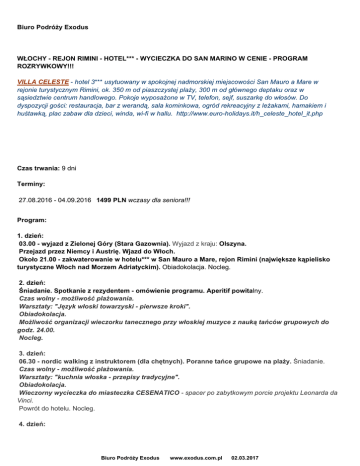 Biuro Podróży Exodus WŁOCHY - REJON RIMINI - HOTEL*** - WYCIECZKA DO SAN MARINO W CENIE - PROGRAM ROZRYWKOWY!!! VILLA CELESTE - hotel 3*** usytuowany w spokojnej nadmorskiej miejscowości San Mauro a Mare w rejonie turystycznym Rimini, ok. 350 m od piaszczystej plaży, 300 m od głównego deptaku oraz w sąsiedztwie centrum handlowego. Pokoje wyposażone w TV, telefon, sejf, suszarkę do włosów. Do dyspozycji gości: restauracja, bar z werandą, sala kominkowa, ogród rekreacyjny z leżakami, hamakiem i huśtawką, plac zabaw dla dzieci, winda, wi-fi w hallu. http://www.euro-holidays.it/h_celeste_hotel_it.php WYCIECZKA DO SAN MARINO W CENIE ! WARSZTATY KUCHNI WŁOSKIEJ, NORDIC WALKING O WSCHODZIE SŁOŃCA, LEKCJE JĘZYKA WŁOSKIEGO W CENIE !!! Czas trwania: 9 dni Terminy: 27.08.2016 - 04.09.2016 1499 PLN wczasy dla seniora!!! Program: 1. dzień: 03.00 - wyjazd z Zielonej Góry (Stara Gazownia). Wyjazd z kraju: Olszyna. Przejazd przez Niemcy i Austrię. Wjazd do Włoch. Około 21.00 - zakwaterowanie w hotelu*** w San Mauro a Mare, rejon Rimini (największe kąpielisko turystyczne Włoch nad Morzem Adriatyckim). Obiadokolacja. Nocleg. 2. dzień: Śniadanie. Spotkanie z rezydentem - omówienie programu. Aperitif powitalny. Czas wolny - możliwość plażowania. Warsztaty: "Język włoski towarzyski - pierwsze kroki". Obiadokolacja. Możliwość organizacji wieczorku tanecznego przy włoskiej muzyce z nauką tańców grupowych do godz. 24.00. Nocleg. 3. dzień: 06.30 - nordic walking z instruktorem (dla chętnych). Poranne tańce grupowe na plaży. Śniadanie. Czas wolny - możliwość plażowania. Warsztaty: "kuchnia włoska - przepisy tradycyjne". Obiadokolacja. Wieczorny wycieczka do miasteczka CESENATICO - spacer po zabytkowym porcie projektu Leonarda da Vinci. Powrót do hotelu. Nocleg. 4. dzień: Biuro Podróży Exodus www.exodus.com.pl 02.03.2017 06.30 - nordic walking z instruktorem (dla chętnych). Poranne tańce grupowe na plaży. Śniadanie. Czas wolny - możliwość plażowania. Panoramiczny rejs statkiem SUPER TAJFUN wzdłuż wybrzeża Riwiery Adriatyckiej z poczęstunkiem z ryb i owoców morza oraz winem bez ograniczeń i tańcami z animatorem. Obiadokolacja. Warsztaty: "drinki tropikalne - przyrządzanie i składniki". Nocleg. 5. dzień: Śniadanie. Spacer po RIMINI - stare miasto, targ rybny, Łuk Augusta, Most Tyberiusza, katedra, zabytkowe place. Czas wolny. Zwiedzanie SAN MARINO - katedra, Plac Wolności z pałacem rządowym, mury obronne i twierdze. Czas wolny - możliwość degustacji i zakupu lokalnych likierów. Obiadokolacja. Warsztaty: "Język włoski towarzyski - pierwsze kroki". Nocleg. 6. dzień: Śniadanie. Możliwość udziału w wycieczce fakultatywnej do RAWENNY (dawna stolica Imperium Rzymskiego, lista UNESCO) - mauzoleum Teodoryka, mauzoleum Galii Placydii, kosciół San Vitale, baptysterium ariańskie, kościół św. Jana Ewangelisty (z przewodnmikiem lokalnym). Czas wolny - możliwość plażowania. Warsztaty: "kuchnia włoska - jak nie bać się i polubić frutti di mare". Obiadokolacja. Nocleg. 7. dzień: 06.30 - nordic walking z instruktorem (dla chętnych). Poranne tańce grupowe na plaży. Śniadanie. Czas wolny - możliwość plażowania. Możliwość zakupów w hipermarkecie IPER ROMAGNA CENTER. Włoska obiadokolacja regionalna przy świecach. Nocleg. 8. dzień: 07.00 - śniadanie. 08.00 - wyjazd. Przejazd przez Włochy, Austrię i Niemcy. 9. dzień: Wjazd do kraju: Olszyna. Około 02.00 - rozwiązanie wycieczki w Zielonej Górze (Stara Gazownia). W cenie: autokar: wysokopokładowy, klimatyzacja, WC, video, napoje zimne i gorące (płatne) ok. 3000 km noclegi: 7 x hotel***, pokoje 2/3-osobowe z łazienkami/WC wyżywienie: 7 x śniadanie (kontynentalne wzmocnione), 7 x obiadokolacja (serwowana) wycieczka do Rimini, Republiki San Marino oraz Cesenatico pilot BP EXODUS na całej trasie + rezydent w j. polskim program rozrywkowy: nordic walking (3x), warsztaty j. włoskiego (2x), warsztaty kuchni włoskiej (3x), drink powitalny ubezpieczenie: NW, KL, bagaż podatek VAT Biuro Podróży Exodus www.exodus.com.pl 02.03.2017 Dodatkowe opłaty: napoje do obiadokolacji (woda w cenie) taksa klimatyczna - ok. 1,5 eur/dzień/os. (obowiązkowa) wieczorek taneczny z zespołem na żywo (tańce włoskie w grupach) - 250 eur/grupa opłata za sejf - 2 eur/dzień/pokój opłata za leżak i parasol na plaży - 6 eur/os./dzień (na życzenie) dopłta do klimaryzacji w pokoju - 6 eur/dzień/pokój rejs statkiem turystycznym wzdłuż wybrzeża adriatyckiego z tańcami, winem i poczęstunkiem z owoców morza - 25 eur/os. wycieczka do Rawenny (przy min. 20 uczestnikach) - 15 eur + 9 eur (wstępy do obiektów turystycznych) dopłata do pokoju 1-osobowego - 350 zł (opcjonalnie) Zniżki hotelowe: dzieci poniżej 2. roku życia z 2 osobami dorosłymi w pokoju (bez wyżywienia i oddzielnego łóżka) płacą tylko 300 zł dzieci 2-3 lata z 2 osobami dorosłymi w pokoju - 520 zł zniżki dzieci 3-6 lat z 2 osobami dorosłymi w pokoju - 280 zł zniżki dzieci 6-12 lat z 2 osobami dorosłymi w pokoju - 210 zł zniżki 3. i 4. osoba powyżej 12 lat z 2 osobami dorosłymi w pokoju - 110 zł zniżki Uwaga: przy długich przejazdach autokar zatrzymuje się na 15-minutowe postoje każdorazowo po około 4-godzinnej jeździe. Nie bierzemy odpowiedzialności za punkty programu niezrealizowane z przyczyn od nas niezależnych. Biuro Podróży Exodus www.exodus.com.pl 02.03.2017