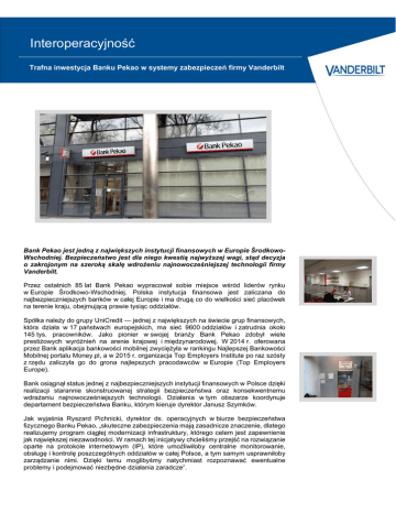 Interoperacyjność Trafna inwestycja Banku Pekao w systemy zabezpieczeń firmy Vanderbilt Bank Pekao jest jedną z największych instytucji finansowych w Europie ŚrodkowoWschodniej. Bezpieczeństwo jest dla niego kwestią najwyższej wagi, stąd decyzja o zakrojonym na szeroką skalę wdrożeniu najnowocześniejszej technologii firmy Vanderbilt. Przez ostatnich 85 lat Bank Pekao wypracował sobie miejsce wśród liderów rynku w Europie Środkowo-Wschodniej. Polska instytucja finansowa jest zaliczana do najbezpieczniejszych banków w całej Europie i ma drugą co do wielkości sieć placówek na terenie kraju, obejmującą prawie tysiąc oddziałów. Insert Product picture here Spółka należy do grupy UniCredit — jednej z największych na świecie grup finansowych, która działa w 17 państwach europejskich, ma sieć 9600 oddziałów i zatrudnia około 145 tys. pracowników. Jako pionier w swojej branży Bank Pekao zdobył wiele prestiżowych wyróżnień na arenie krajowej i międzynarodowej. W 2014 r. oferowana przez Bank aplikacja bankowości mobilnej zwyciężyła w rankingu Najlepszej Bankowości Mobilnej portalu Money.pl, a w 2015 r. organizacja Top Employers Institute po raz szósty z rzędu zaliczyła go do grona najlepszych pracodawców w Europie (Top Employers Europe). Bank osiągnął status jednej z najbezpieczniejszych instytucji finansowych w Polsce dzięki realizacji starannie skonstruowanej strategii bezpieczeństwa oraz konsekwentnemu wdrażaniu najnowocześniejszych technologii. Działania w tym obszarze koordynuje departament bezpieczeństwa Banku, którym kieruje dyrektor Janusz Szymków. Jak wyjaśnia Ryszard Pichnicki, dyrektor ds. operacyjnych w biurze bezpieczeństwa fizycznego Banku Pekao, „skuteczne zabezpieczenia mają zasadnicze znaczenie, dlatego realizujemy program ciągłej modernizacji infrastruktury, którego celem jest zapewnienie jak największej niezawodności. W ramach tej inicjatywy chcieliśmy przejść na rozwiązanie oparte na protokole internetowym (IP), które umożliwiłoby centralne monitorowanie, obsługę i kontrolę poszczególnych oddziałów w całej Polsce, a tym samym usprawniłoby zarządzanie nimi. Dzięki temu moglibyśmy natychmiast rozpoznawać ewentualne problemy i podejmować niezbędne działania zaradcze”. Insert Product picture here (Optional) Pichnicki zwrócił się o poradę do siedleckiej firmy Cel-Tronics, która specjalizuje się w integracji systemów alarmów włamaniowych. „Współpracujemy z Bankiem Pekao od wielu lat i jesteśmy zatwierdzonym partnerem technicznym” — wyjaśnia dyrektor zarządzający tej firmy Bogdan Jędrych. „Po zapoznaniu się z wymaganiami zasugerowaliśmy rozwiązanie oparte na najnowocześniejszej technologii firmy Vanderbilt, obejmujące między innymi niezawodne rejestratory wideo z serii Vectis, panele sterujące SPC oraz system kontroli dostępu SiPass. Ryszard Pichnicki wyraźnie zaznaczył, że chce wdrożyć produkty oferowane przez firmę potrafiącą zagwarantować ich nieograniczoną dostępność dla instalatorów. W tej sytuacji uznaliśmy, że dobrym rozwiązaniem będzie współpraca z firmą Vanderbilt”. SiPass integrated to zaawansowany i niezwykle elastyczny system kontroli dostępu, który łączy bardzo wysoki poziom bezpieczeństwa z dużym komfortem i łatwością obsługi. Jak wyjaśnia Krzysztof Krasowski, kierownik działu sprzedaży firmy Vanderbilt na Polskę, kraje bałtyckie i Ukrainę, „SiPass jest częścią stosowanego przez Bank Pekao systemu, który ogranicza ruch w poszczególnych oddziałach i może zapewnić dzięki szerokiej gamie trybów pracy maksymalny poziom ochrony. Bank Pekao wymagał również pełnej zgodności operacyjnej paneli SPC z systemami kontroli dostępu w zakresie takich operacji jak uzbrajanie/rozbrajanie obszarów, wysyłanie powiadomień o alarmach czy odczytywanie stanu wejść/wyjść. Jesteśmy przyzwyczajeni do dostarczania tego typu rozwiązań, w związku z czym nie mieliśmy problemu ze spełnieniem stawianych nam wymagań”. Wysoki poziom zgodności operacyjnej oznacza, że cały system działa w jednej sieci, którą można centralnie zarządzać. Umożliwia to sprawne działanie systemu i zapewnia maksymalny poziom bezpieczeństwa we wszystkich oddziałach Banku. Przyjęte rozwiązanie okazało się również bardzo opłacalne, ponieważ pozwoliło wyeliminować zapotrzebowanie na więcej niż jedną infrastrukturę okablowania. Rozwiązanie oferuje również otwarty interfejs do współpracy z dowolnym oprogramowaniem innych firm, a tym pozwala zintegrować system kontroli dostępu z innymi systemami. W ten sposób powstaje jeden inteligentny system zarządzania budynkiem, który umożliwia sprawdzanie stanu drzwi, uruchamianie rejestratorów wideo Vectis iX i tworzenie pełnego zapisu kontrolnego. Urządzenia z rodziny Vectis iX działają w oparciu o otwarty protokół komunikacyjny ONVIF, dzięki czemu można ich używać razem z kamerami innych firm. Jest to bardzo korzystne — zwłaszcza w obiektach, w których są już zainstalowane kamery i konieczne jest zintegrowanie ich z nowym systemem. Rozwiązanie firmy Vanderbilt jest wdrażane w kilku etapach. W tej sytuacji bardzo cenna jest możliwość współpracy systemu SiPass z czytnikami mogącymi komunikować się z innymi sterownikami, co ułatwia płynne przeprowadzenie migracji. Nowe rozwiązanie zastępuje system oparty na technologii Vanderbilt Sintony, w związku z czym część zastanej infrastruktury jest wykorzystywana ponownie. Przekłada się to na dalsze oszczędności i ograniczenie ilości odpadów, co jest zgodne z przyjętą przez Bank Pekao polityką ochrony środowiska i zrównoważonego rozwoju. Firma Cel-Tronics zainstalowała już nowe rozwiązania techniczne w wielu oddziałach Banku. Dotychczasowe prace zakończyły się dużym sukcesem, w związku z czym na najbliższych kilka lata zaplanowano wiele kolejnych wdrożeń. 