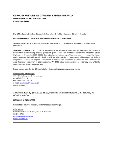 OŚRODEK KULTURY IM. CYPRIANA KAMILA NORWIDA INFORMACJA PROGRAMOWA Kwiecień 2014 Do 17 kwietnia 2014 r., Ośrodek Kultury im. C. K. Norwida, os. Górali 5, Kraków. SYMPTOMY MAŁE I MNIEJSZE.WYSTAWA SŁAWOMIRA LEWCZUKA. Serdecznie zapraszamy do Galerii Ośrodka Kultury im. C. K. Norwida na wystawę prac Sławomira Lewczuka. Sławomir Lewczuk – (ur. 1938 w Czerkasach na Wołyniu) studiował na Wydziale Architektury Politechniki Krakowskiej oraz w pracowni prof. Krchy na Wydziale Malarstwa Akademii Sztuk Pięknych w Krakowie (1957-1965). Zajmuje się malarstwem, grafiką, rysunkiem i scenografią. Autor wielu wystaw indywidualnych. Brał udział w kilkudziesięciu wystawach zbiorowych w Polsce i zagranicą. Laureat 25 nagród i wyróżnień. Współpracuje z wieloma wydawnictwami i redakcjami oraz teatrami krajowymi i zagranicznymi. W 2009 roku nominowany do Nagrody im. Witolda Wojtkiewicza. Mieszka w Krakowie. Prace można oglądać do 17 kwietnia b.r. Serdecznie zapraszamy, wstęp wolny. Szczegółowe informacje: Ośrodek Kultury im. C. K. Norwida os. Górali 5, p.18, tel. 12 6442765 w. 18, e-mail: [email protected] www.okn.edu.pl 1 kwietnia 2014 r., godz.12.00-18.00, Biblioteka Ośrodka Kultury im. C. K. Norwida, os. Górali 5, Kraków. NOWOŚCI W BIBLIOTECE. Prezentacja nowych książek , rekomendacje, rezerwacje. Informacja: Biblioteka Ośrodka Kultury im. C. K. Norwida 12 644 27 65 [email protected] www.okn.edu.pl 1, 8, 15, 29 kwietnia (wtorki) godz. 14.30, Kino Studyjne Sfinks, os. Górali 5, Kraków. FILMOWY KLUB SENIORA Serdecznie zapraszamy Seniorów na pokazy szczególnie interesujących filmów z bieżącego repertuaru Kina Sfinks. Każdy seans będzie poprzedzony krótkim wprowadzeniem oraz Nowohucką Kroniką Filmową. Projekcje filmów odbywają się we wtorki o godz. 14.30. W tym miesiącu proponujemy: − 1 IV godz. 14.30 - „POZYCJA DZIECKA”, dramat, Rumunia − 8 IV godz. 14.30 - „OJCIEC SZPILER”, komedia, Chorwacja − 15 IV godz. 14.30 - „KIEDY UMIERAM”, dramat, USA − 29 IV godz. 14.30 - „ZABIĆ BOBRA”, dramat, Polska Bilety w ramach Filmowego Klubu Seniora: 8 zł Szczegółowa Informacja: Kino Studyjne Sfinks os. Górali 5, Kraków 12 644 27 65 [email protected] www.kinosfinks.pl 1, 8 kwietnia 2014 r., godz. 17.00-19.00 , Ośrodek Kultury im. C. K. Norwida, os. Górali 5, Kraków. WARSZTATY RĘKODZIEŁA. FILCOWANIE I OZDOBY WIELKANOCNE. Zapraszamy na warsztaty rękodzieła artystycznego, w tym miesiącu podczas spotkań będziemy tworzyć ozdoby wielkanocne: filcowe zajączki i kury nioski Warsztaty odbywają się we wtorki, w godzinach 17.00-19.00, prowadzi Krystyna Drożdżowska. Koszt pojedynczych zajęć 20 zł. Szczegółowe informacje i zapisy: Ośrodek Kultury im. C. K. Norwida os. Górali 5, p.18, tel. 12 6442765 w. 18, e-mail: [email protected] www.okn.edu.pl 3, 8, 10 kwietnia 2014 r., godz. 10.00, Ośrodek Kultury im. C. K. Norwida, os. Górali 5, Kraków. KOMPUTEROWY KLUB SENIORA Zapraszamy do Ośrodka Kultury im. C. K. Norwida na dwugodzinne otwarte spotkania komputerowointernetowe dla Seniorów. Spotkania odbywają się w sali komputerowej nr 27. W tym miesiącu poruszamy tematy: − − − 3 IV godz. 10.00 – Kopiowanie i wklejanie 8 IV godz. 10.00 - Wyszukiwanie informacji w Internecie 10 IV godz. 10.00 – Blogi, portale społecznościowe Koszt pojedynczych zajęć 15 zł. od osoby. Informacje: Joanna Kornas, os. Górali 5, Kraków tel. 12 644 27 65 w. 24 [email protected] 3, 10, 17 kwietnia 2014 r., godz. 19.00, Kino Studyjne Sfinks, os. Górali 5, Kraków. DYSKUSYJNY KLUB FILOWY KROPKA: PATRICE LECONTE MAGIK OBRAZU. W ramach Dyskusyjnego Klubu Filmowego Kropka Kino Studyjne Sfinks zaprasza na cykl projekcji filmowych pn. PATRICE LECONTE MAGIK OBRAZU 3 kwietnia godz. 19.00 „Mąż fryzjerki” (80`) komediodramat, 1990 r., Francja, wyst. Jean Rochefort, Anna Galiena, Roland Bertin, Philippe Clévenot Nastrojowa przypowieść o miłości i kruchości ludzkiego szczęścia. Mały Antoine jest częstym gościem salonu fryzjerskiego. Przychodzi tu, by podziwiać piękną fryzjerkę, którą darzy gorącym, młodzieńczym uczuciem. Urzeczony jej delikatnością, zapachem i głosem, przyrzeka sobie, że w przyszłości poślubi kobietę o tej właśnie profesji. Mijają lata. Dorosły Antoine poznaje śliczną Mathildę, w której zakochuje się z wzajemnością. Tym samym jego marzenie z dzieciństwa spełnia się. Rodzinna idylla nie trwa jednak długo, ponieważ uczucie, jakim Antoine obdarza żonę szybko przeradza się w obsesję. Mężczyzna co dzień przychodzi do salonu fryzjerskiego i obserwuje, jak Mathilda czesze kolejnych klientów. Tymczasem piękna kobieta, znudzona małomiasteczkową monotonią, szybko popada we frustrację... Film Patrice'a Leconte'a zdobył prestiżową Nagrodę Louisa Delluca przyznawaną przez francuskich krytyków oraz siedem nominacji do Cezarów. 10 kwietnia godz.19.00 „Dziewczyna na moscie” (90`) dramat, 1999 r., Francja, wyst. Vanessa Paradis, Daniel Auteuil, Noc na paryskim moście. Zapłakana dziewczyna postanawia skończyć ze swoim życiem. "Wyglądasz na dziewczynę, która jest o krok od popełnienia błędu", odzywa się głos za jej plecami. Ktoś, kto nagle zainteresował się jej losem. To Gabor, cyrkowiec, rzucający nożami, poszukuje asystentki do swego programu artystycznego. Dziewczyna, Adela, nie mając i tak gdzie się podziać, podąża za nim. Połączenie tych dwóch zagubionych istnień stworzyło zwycięską kombinację. Sukces stał się ich nierozłącznym towarzyszem. Tak jakby ktoś skleił rozerwaną czterolistną koniczynę i dał im ją w prezencie. Życie nieoczekiwanie staje się dla nich łaskawe. Mogą rzucać w ciemności nożami, kręcić ruletką, podróżować po lądzie i morzu, chodzić po linie. Wygrywać w życiu. Dopóki są razem, szczęście ich nie opuszcza. Szczęście bywa jednak kapryśne. Gdy tylko tych dwoje odwróci się od siebie i zacznie