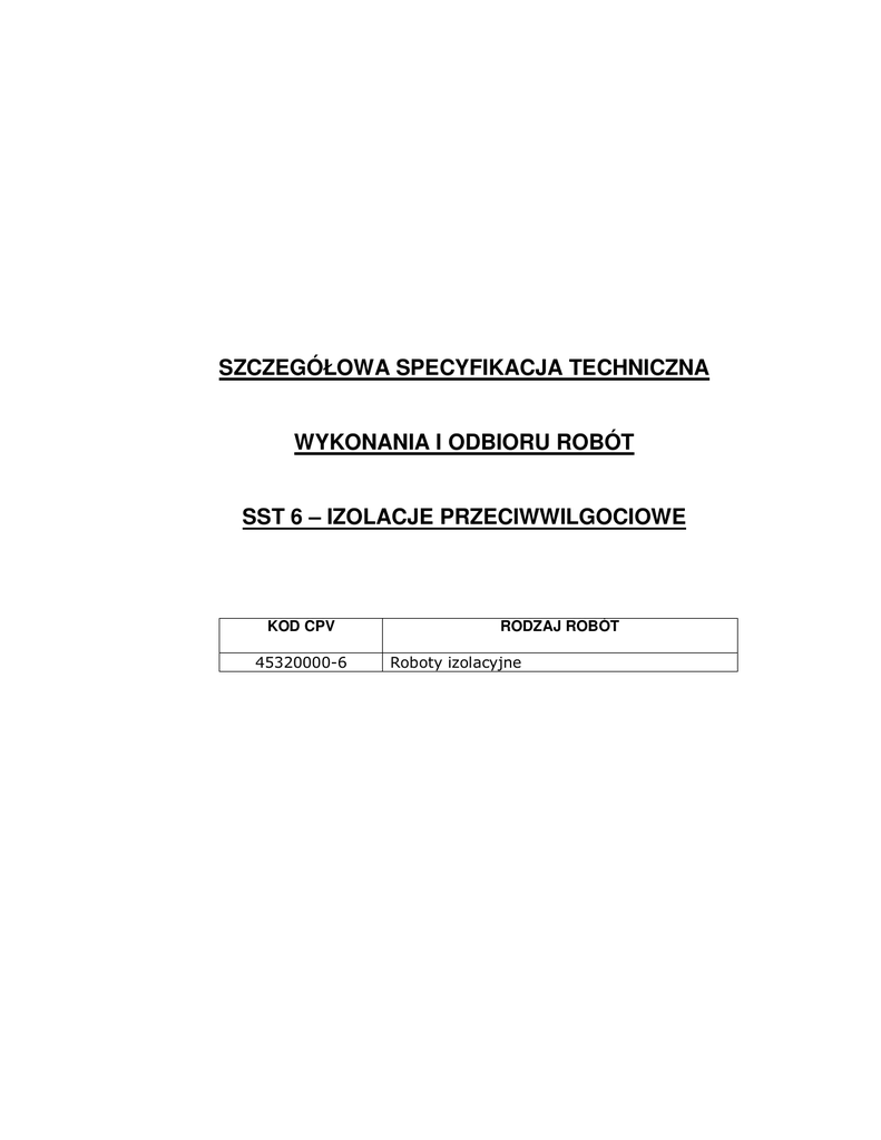 SZCZEGÓŁOWA SPECYFIKACJA TECHNICZNA WYKONANIA I ODBIORU ROBÓT SST 6 – IZOLACJE PRZECIWWILGOCIOWE KOD CPV 45320000-6 RODZAJ ROBÓT Roboty izolacyjne IZOLACJE PRZECIWWILGOCIOWE SST 6 - IZOLACJE PRZECIWWILGOCIOWE 1. PRZEDMIOT I ZAKRES STOSOWANIA SPECYFIKACJI 1.1. Przedmiot specyfikacji Przedmiotem niniejszej szczegółowej specyfikacji technicznej są wymagania dotyczące wykonania i odbioru izolacji przeciwwilgociowych związanych z wykonaniem zadania. 1.2. Zakres stosowania specyfikacji Niniejsza specyfikacja będzie stosowana jako dokument przetargowy i kontraktowy przy zlecaniu i realizacji robót wymienionych w punkcie 1.1. Ustalenia zawarte w niniejszej specyfikacji obejmują wszystkie czynności umożliwiające i mające na celu wykonanie wszystkich izolacji przeciwwilgociowych. Obejmują prace związane z dostawą materiałów, wykonawstwem i wykończeniem powłok, wykonywanych na miejscu. 1.3. Zakres robót objętych specyfikacją W ramach prac budowlanych przewiduje się wykonanie następujących robót: − oczyszczenie ścian, − osuszenie ścian, − wykonanie izolacji przeciwwilgociowych ścian, podłóg, − ułożenie izolacji wodoszczelnej powłokowej w pomieszczeniach, 1.4. Określenia podstawowe Określenia podstawowe użyte w niniejszej SST są zgodne z obowiązującymi polskimi normami i Ogólną Specyfikacją Techniczną. 1.5. Ogólne wymagania dotyczące robót Ogólne wymagania dotyczące zasad prowadzenia robót podano w Ogólnej Specyfikacji Technicznej. Niniejsza specyfikacja obejmuje całość robót związanych z wykonywaniem izolacji przeciwwilgociowych oraz wszystkie roboty pomocnicze. Wykonawca jest odpowiedzialny za jakość wykonania tych robót oraz ich zgodność z umową, projektem wykonawczym, pozostałymi SST i poleceniami zarządzającego realizacją umowy. Wprowadzanie jakichkolwiek odstępstw od tych dokumentów wymaga akceptacji zarządzającego realizacją umowy. 2. MATERIAŁY 2.1. Ogólne wymagania dotyczące materiałów, ich pozyskiwania i składowania podano w SST – 0 „Wymagania ogólne” 2.2. Folie paroprzepuszczalne i paroszczelne 2.2.1. Folia paroizolacyjna polietylenowa gr. min. 0,2 mm Folia paroizolacyjna pełni funkcję zabezpieczenia izolacji termicznej i warstw przegród budowlanych przed przenikaniem pary wodnej Szczelność układu 76 Zabudowa Tarasu Budynku Centrum Rehabilitacji Rolników KRUS „NIWA” - ul. Norwida 3 / Zdrojowa, 78-100 Kołobrzeg IZOLACJE PRZECIWWILGOCIOWE zapewnia się poprzez klejenie zakładów sąsiednich uszczelniającą i obustronnie klejącą. arkuszy folii taśmą Wymogi techniczne: - grubość 0,20 mm, - masa powierzchniowa 190 g/m2, - wytrzymałość na rozdzieranie ≥ 60 N/mm, - przesiąkliwość przy działaniu słupa wody o wysokości 1 m w czasie 100 h nie przesiąka - opór dyfuzyjny ≥ 600 m2 hPa/g - rozprzestrzenianie ognia nie rozprzestrzeniające ognia 2.2.2. Folia wysokoparoprzepuszczalna >1500 g/m² nazywana również folią wstępnego krycia (FWK) lub membraną dachową, układana jest na Folia ta – stosowana jest na dachach ocieplanych – pełni kilka istotnych funkcji: − − − − mogą stanowić tymczasowe pokrycie dachu (do 4 miesięcy), chronią przed przeciekami, umożliwiają odparowanie wilgoci z warstwy ociepleniowej, zapobiegają wydmuchiwaniu włókien z ocieplenia przez wiatr. Najistotniejszym parametrem folii paroprzepuszczalnej jest jej zdolność do odprowadzania wilgoci, przenikającej od strony wewnętrznej (z poddasza). Producenci najczęściej definiują tę zdolność, określając ilość wody, która może przeniknąć przez 1 m² folii w ciągu 24 godzin. Dla powszechnie stosowanych folii dachowych wskaźnik ten wynosi 1000-3000 g/m² na dobę; folie takie uważane są za wysokoparoprzepuszczalne. Spotyka się jeszcze folie o mniejszej paroprzepuszczalności, ale w praktyce wychodzą one już z użycia przy wykonywaniu pokryć dachowych. Trzeba jednak wiedzieć, że podawane przez producentów wskaźniki paroprzepuszczalności nie w pełni odzwierciedlają rzeczywistą zdolność do odprowadzania wilgoci. Badania prowadzone są bowiem w zróżnicowanych, nieznormalizowanych warunkach, trudno więc porównywać uzyskane w ich efekcie wyniki. Bardziej obiektywnym parametrem – podawanym przez rzetelnych producentów – jest współczynnik paroprzepuszczalności Sd. Określa on równoważną pod względem paroprzepuszczalności grubość warstwy powietrza, wyrażoną w metrach. Dla folii wysokoparoprzepuszczalnych powinien on wynosić nie więcej niż 0,05 m. Przy doborze folii dachowej należy również uwzględnić jej wytrzymałość mechaniczną, zwłaszcza gdy docelowe pokrycie zamierzamy wykonać dopiero po pewnym czasie. Trzeba wówczas zastosować folię o dużej wytrzymałości na rozrywanie (powyżej 300 N dla próbki o szerokości 5 cm). 2.2.3. Membrana separacyjna Delta VM Zinc 77 Zabudowa Tarasu Budynku Centrum Rehabilitacji Rolników KRUS „NIWA” - ul. Norwida 3 / Zdrojowa, 78-100 Kołobrzeg IZOLACJE PRZECIWWILGOCIOWE Folia polietylenowa z wypustkami w kształcie ściętych stożków. Można układać na wszystkich typach podłoży (w tym drewnopochodnych) Łatwy i szybki montaż Ochrona drewnianego lub drewnopochodnego podłoża przed zawilgoceniem w trakcie prowadzenia prac pokryciowych. 1. 2. 3. 4. Pokrycie dachowe na rąbek stojący Specjalny klips mocujący Membrana separacyjna DELTA VM ZINC® Podłoże pokrycia dachowego Zastosowanie Wykonanie nowych pokryć na podłożach niekompatybilnych z blachą cynkowotytanową VM ZINC. Zapewnienie wentylacji między podłożem a pokryciem z blachy. Charakterystyka membrany separacyjnej DELTA VM ZINC Materiał Wygląd Wymiary Powierzchnia użytkowa Grubość Odporność na ściskanie Temp. stosowania 2.3. polietylen o dużej gęstości (PE-HD) kolor szary, wypustki w kształcie ściętych stożków rolka 2 x 20 m 38 m², na szerokości 100 mm, w celu ułatwienia układania pasów membrany