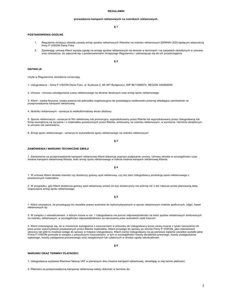 REGULAMIN prowadzenia kampanii reklamowych na nośnikach reklamowych. §1 POSTANOWIENIA OGÓLNE 1. Regulamin niniejszy określa zasady emisji spotów reklamowych Klientów na nośniku reklamowym (EKRAN LED) będącym własnością firmy F-VISION Daria Foks 2. Zawierając umowę Klient wyraża zgodę na emisję spotów reklamowych na ekranie w terminach i na zasadach określonych w umowie oraz oświadcza, że zapoznał się z postanowieniami niniejszego Regulaminu i zobowiązuje się do ich przestrzegania. §2 DEFINICJE Użyte w Regulaminie określenia oznaczają: 1. Usługodawca – firma F-VISION Daria Foks, ul. Kurkowa 2, 85-367 Bydgoszcz, NIP 9671086074, REGON 340569290 2. Umowa - Umowa udostępniania czasu reklamowego na ekranie diodowym oraz emisji spotu reklamowego 3. Klient - osoba fizyczna, osoba prawna lub jednostka organizacyjna nie posiadająca osobowości prawnej składająca zamówienie na przeprowadzenie kampanii reklamowej. 4. Nośniku reklamowym - oznacza to wielkoformatowy ekran diodowy. 5. Spocie reklamowym - oznacza to film reklamowy lub promocyjny, wyprodukowany przez Klienta lub wyprodukowany przez Usługodawcę lub firmę zewnętrzną na życzenie i z materiałów powierzonych przez Klienta, emitowany na nośniku reklamowym, w wymiarze i terminie określonym w umowie lub zamówieniu. 6. Emisji spotu reklamowego - oznacza to wyświetlenie spotu reklamowego na nośniku reklamowym. §3 ZAMÓWIENIA I WARUNKI TECHNICZNE EMISJI 1. Zamówienia na przeprowadzenie kampanii reklamowej Klient dokonuje poprzez podpisanie umowy. Umowa określa w szczególności czas trwania kampanii reklamowej Klienta, ilość emisji spotu reklamowego w trakcie trwania kampanii reklamowej Klienta. §4 1. W umowie Klient określa również czy dostarczy gotowy spot reklamowy, czy też zleci Usługodawcy produkcję spotu reklamowego z powierzonych materiałów. 2. W przypadku, gdy Klient dostarcza gotowy spot reklamowy winien on być dostarczony nie później niż 3 dni robocze przed planowaną datą rozpoczęcia emisji spotu reklamowego. §5 1. Klient oświadcza, że przysługują mu wszelkie prawa autorskie do wykorzystywanych w spocie reklamowym znaków graficznych, zdjęć, haseł reklamowych itp. 2. W związku z oświadczeniem, o którym mowa w ust. 1 Usługodawca nie ponosi odpowiedzialności za treść spotów reklamowych emitowanych na nośniku reklamowym, w szczególności odpowiedzialności za naruszenia praw autorskich osób trzecich. 3. Klient zobowiązuje się, że w momencie wystąpienia z roszczeniami w stosunku do Usługodawcy przez osoby trzecie z tytułu naruszenia ich praw przez wykorzystanie przekazanych przez Klienta materiałów, Klient przystąpi do sprawy po stronie Firmy F-VISION, jako interwenient uboczny lub jeśli to możliwe wstąpi do sprawy w miejsce Usługodawcy. Klient zwróci Usługodawcy na jej pierwsze żądanie wszelkie wydatki jakie Firma F-VISION poniosła w związku z powyższymi roszczeniami, w tym w szczególności koszty doradztwa prawnego, koszty postępowania sądowego, koszty zastępstwa procesowego oraz zasądzonych lub ustalonych w drodze ugody odszkodowań. §6 WARUNKI ORAZ TERMINY PŁATNOŚCI 1. Usługodawca wystawia Klientowi fakturę VAT w pierwszym dniu trwania kampanii reklamowej, określając w niej termin płatności. 2. Płatności za przeprowadzoną kampanię reklamową należy dokonać w terminie do: 1 a. 7 dni od dnia otrzymania faktury VAT w przypadku, gdy kampania reklamowa Klienta trwa nie dłużej niż 14 dni, b. 14 dni od dnia otrzymania faktury VAT w przypadku, gdy kampania reklamowa Klienta trwa dłużej niż 14 dni. 3. Płatności należy dokonać na rachunek bankowy Usługodawcy w banku wskazanym na fakturze VAT, chyba, że postanowienia umowy stanowią inaczej. 4. W przypadku nie dokonania płatności we wskazanym terminie Usługodawca zachowuje sobie prawo do naliczania odsetek ustawowych za zwłokę oraz zastrzega sobie prawo przerwania emisji spotów reklamowych Klienta na nośniku reklamowym i wystawienia korekty faktury za emisję spotów po cenie jednostkowej 3,00 zł plus należny podatek VAT 5. Klient upoważnia Usługodawcę do wystawiania faktury VAT bez podpisu Klienta. §7 UPRAWNIENIA I ZOBOWIĄZANIA STRON Usługodawca zastrzega sobie prawo do: 1. Przesunięcia terminu rozpoczęcia emisji spotu reklamowego Klienta w przypadku, gdy Klient dostarczy spot reklamowy później niż 3 dni robocze przed planowaną datą rozpoczęcia emisji spotu reklamowego. 2. Odmowy emisji spotu reklamowego, który jest niezgodny z obowiązującym w Polsce prawem, normami etycznymi lub dobrymi obyczajami, albo może naruszyć dobra osobiste osób trzecich lub dobra Usługodawcy , jak również w przypadku gdy spot reklamowy jest złej jakości technicznej uniemożliwiającej jego emisję. 3. Zaproponowania Klientowi zastępczego terminu emisji spotu reklamowego w przypadku, gdy Usługodawca nie może wyemitować spotu reklamowego w uzgodnionym przez strony terminie. Jeżeli zaproponowany przez Usługodawcę termin emisji spotu reklamowego nie zostanie zaakceptowany przez Klienta wynagrodzenie należne Firmie F-VISION zostanie proporcjonalne obniżone za okres, w którym nie mogła wyemitować spotu reklamowego, bez prawa do roszczeń odszkodowawczych ze strony Klienta. 4. W przypadku awarii technicznej uniemożliwiającej emisję spotu w umówionym terminie czas emisji zostanie wydłużony o ilość godzin/dni przerwy w nadawaniu. §8 KLIENT JEST UPRAWNIONY DO: 1. Bieżącej kontroli emisji spotu reklamowego na nośniku reklamowym w sposób nie zakłócający pracy Usługodawcy. 2. Przeprowadzenia kontroli emisji spotu reklamowego na nośniku reklamowym w obecności pracownika Firmy F-Vision. §9 KLIENT JEST ZOBOWIĄZANY DO: 1. Dostarczenia spotu reklamowego lub materiałów do produkcji spotu reklamowego przez Usługodawcę w terminie nie później , niż 14 dni roboczych przed planowaną datą rozpoczęcia emisji spotu reklamowego, z za