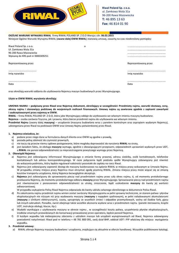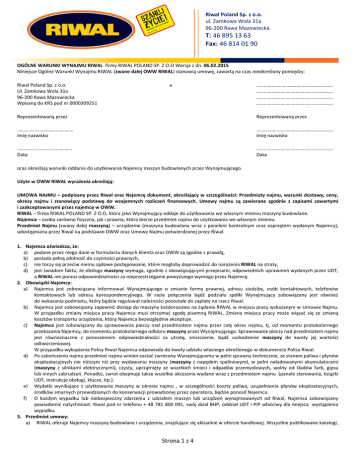 Riwal Poland Sp. z o.o. ul. Zamkowa Wola 31a 96-200 Rawa Mazowiecka T: 46 895 13 63 Fax: 46 814 01 90 OGÓLNE WARUNKI WYNAJMU RIWAL firmy RIWAL POLAND SP. Z O.O Wersja z dn. 06.02.2015 Niniejsze Ogólne Warunki Wynajmu RIWAL (zwane dalej OWW RIWAL) stanowią umowę, zawartą na czas nieokreślony pomiędzy: Riwal Poland Sp. z o.o. Ul. Zamkowa Wola 31a 96-200 Rawa Mazowiecka Wpisaną do KRS pod nr 0000309251 a ……………………………………………………. ……………..…………………………………….. ……………..…………………………………….. ……………..…………………………………….. Reprezentowaną przez Reprezentowaną przez ……………………………………… Imię nazwisko ……………..…………………………………….. Imię nazwisko …………………………………….. Data ……………..…………………………………….. Data oraz określają warunki oddania do użytkowania Najemcy maszyn budowlanych przez Wynajmującego. Użyte w OWW RIWAL wyrażenia określają: UMOWA NAJMU – podpisany przez Riwal oraz Najemcę dokument, określający w szczególności: Przedmioty najmu, warunki dostawy, ceny, okresy najmu i stanowiący podstawę do wzajemnych rozliczeń finansowych. Umowy najmu są zawierane zgodnie z zapisami zawartymi i zaakceptowanymi przez najemcę w OWW. RIWAL – firma RIWAL POLAND SP. Z O.O, która jako Wynajmujący oddaje do użytkowania we własnym imieniu maszyny budowlane. Najemca – osoba zarówno fizyczna, jak i prawna, która bierze przedmiot najmu do użytkowania we własnym imieniu. Przedmiot Najmu (zwany dalej maszyną) – urządzenie (maszyna budowlana wraz z panelem kontrolnym oraz osprzętem wydanym Najemcy), udostępniana przez Riwal na podstawie OWW oraz Umowy Najmu potwierdzonej przez Riwal. 1. Najemca oświadcza, że: a) podane przez niego dane w formularzu danych klienta oraz OWW są zgodne z prawdą, b) posiada pełną zdolność do czynności prawnych, c) nie toczy się przeciw niemu sądowe postępowanie, które mogłoby doprowadzić do narażenia RIWAL na straty, d) jest świadom faktu, że obsługa maszyny wymaga, zgodnie z obowiązującymi przepisami, odpowiednich uprawnień wydanych przez UDT, a RIWAL nie ponosi odpowiedzialności za nieprzestrzeganie powyższego wymogu przez Najemcę. 2. Obowiązki Najemcy: a) Najemca jest zobowiązany informować Wynajmującego o zmianie formy prawnej, adresu siedziby, osób kontaktowych, telefonów kontaktowych lub adresu korespondencyjnego. W razie połączenia bądź podziału spółki Wynajmujący zobowiązany jest również do wskazania podmiotu, który będzie regulował należności pozostałe do zapłaty na rzecz Riwal. b) Najemca jest zobowiązany zapewnić dostęp do maszyny każdorazowo na żądanie RIWAL w miejscu pracy wskazanym w Umowie Najmu. W przypadku zmiany miejsca pracy Najemca musi otrzymać zgodę pisemną RIWAL. Zmiana miejsca pracy może wiązać się ze zmianą kosztów transportu urządzenia, którą Najemca bezwzględnie akceptuje. c) Najemca jest zobowiązany do sprawowania pieczy nad przedmiotem najmu przez cały okres najmu, tj. od momentu protokolarnego przekazania Najemcy, do momentu protokolarnego odbioru maszyny przez Wynajmującego. Sprawowanie pieczy nad przedmiotem najmu jest równoznaczne z ponoszeniem odpowiedzialności za utratę, zniszczenie, bądź uszkodzenie maszyny do kwoty jej wartości odtworzeniowej. W przypadku wykupienia Polisy Riwal Najemca odpowiada do kwoty udziału własnego określonego w dokumencie Polisa Riwal. d) Po zakończeniu najmu przedmiot najmu winien zostać zwrócony Wynajmującemu w pełni sprawny technicznie, ze stanem paliwa i płynów eksploatacyjnych nie niższym niż przy wydawaniu maszyny (maszyny z napędem spalinowym), w pełni naładowanymi akumulatorami (maszyny z silnikami elektrycznymi), czysty, uprzątnięty ze wszelkich śmieci i odpadów przemysłowych, wolny od śladów farb, gipsu lub innych zabrudzeń. Ponadto, zwrot obejmuje także wszelkie akcesoria wydane wraz z przedmiotem najmu (panele sterowania, książki UDT, instrukcje obsługi, klucze, itp.). e) Wydatki wynikające z użytkowania maszyny w okresie najmu , w szczególności koszty paliwa, uzupełnienia płynów eksploatacyjnych, środków smarnych przewidzianych do konserwacji prowadzonej przez operatora, będzie ponosił Najemca. f) O każdym wypadku lub niebezpieczny zdarzeniu z udziałem maszyn lub urządzeń wynajmowanych od Riwal, Najemca zobowiązany powiadomić natychmiast: Riwal pod nr telefonu + 48 781 800 091, swój dział BHP, oddział UDT i PIP właściwy dla miejsca wystąpienia wypadku. 3. Przedmiot umowy: a) RIWAL oferuje Najemcy maszyny budowlane i urządzenia, znajdujące się aktualnie w ofercie handlowej. Wszystkie publikowane katalogi, Strona 1 z 4 Riwal Poland Sp. z o.o. ul. Zamkowa Wola 31a 96-200 Rawa Mazowiecka T: 46 895 13 63 Fax: 46 814 01 90 zdjęcia lub foldery reklamowe i dane techniczne dotyczące przedmiotu najmu mają jedynie charakter informacyjny i nie stanowią oferty w rozumieniu przepisów prawa cywilnego. Wiążące są jedynie dane techniczne potwierdzone przez RIWAL. b) Typ maszyny jest wskazany na Umowie Najmu – Najemca tym samym potwierdza zgodność zamawianego sprzętu i nie wnosi uwag do rodzaju wybranego sprzętu. Każdorazowe wydanie i zwrot maszyny jest potwierdzony protokołem zdawczo-odbiorczym zawierającym informacje o stanie technicznym sprzętu jak i jego rodzaju. Protokół jest potwierdzany przez obie strony, w przypadku braku osoby kontaktowej ze strony Najemcy uwagi zapisane przez Riwal uznawane są za wiążące dla obu stron. 4. Czas trwania Umowy Najmu a) Zawarcie umowy następuje poprzez otrzymanie przez RIWAL podpisanego dokumentu Umowy Najmu. Umowa najmu może być podpisana wyłącznie przez osoby upoważnione do reprezentowania Najemcy lub osoby upoważnione, wskazane w Formularzu Dany