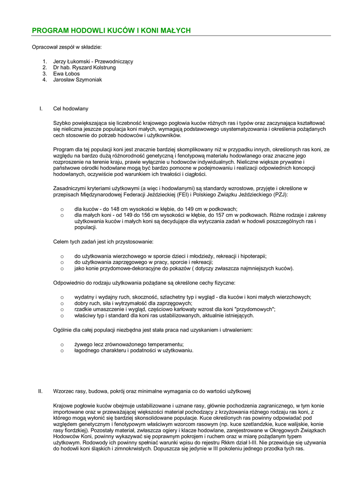 PROGRAM HODOWLI KUCÓW I KONI MAŁYCH Opracował zespół w składzie: 1. 2. 3. 4. I. Jerzy Łukomski - Przewodniczący Dr hab. Ryszard Kolstrung Ewa Łobos Jarosław Szymoniak Cel hodowlany Szybko powiększająca się liczebność krajowego pogłowia kuców różnych ras i typów oraz zaczynająca kształtować się nieliczna jeszcze populacja koni małych, wymagają podstawowego usystematyzowania i określenia pożądanych cech stosownie do potrzeb hodowców i użytkowników. Program dla tej populacji koni jest znacznie bardziej skomplikowany niż w przypadku innych, określonych ras koni, ze względu na bardzo dużą różnorodność genetyczną i fenotypową materiału hodowlanego oraz znaczne jego rozproszenie na terenie kraju, prawie wyłącznie u hodowców indywidualnych. Nieliczne większe prywatne i państwowe ośrodki hodowlane mogą być bardzo pomocne w podejmowaniu i realizacji odpowiednich koncepcji hodowlanych, oczywiście pod warunkiem ich trwałości i ciągłości. Zasadniczymi kryteriami użytkowymi (a więc i hodowlanymi) są standardy wzrostowe, przyjęte i określone w przepisach Międzynarodowej Federacji Jeździeckiej (FEI) i Polskiego Związku Jeździeckiego (PZJ): o o dla kuców - do 148 cm wysokości w kłębie, do 149 cm w podkowach; dla małych koni - od 149 do 156 cm wysokości w kłębie, do 157 cm w podkowach. Różne rodzaje i zakresy użytkowania kuców i małych koni są decydujące dla wytyczania zadań w hodowli poszczególnych ras i populacji. Celem tych zadań jest ich przystosowanie: o o o do użytkowania wierzchowego w sporcie dzieci i młodzieży, rekreacji i hipoterapii; do użytkowania zaprzęgowego w pracy, sporcie i rekreacji; jako konie przydomowe-dekoracyjne do pokazów ( dotyczy zwłaszcza najmniejszych kuców). Odpowiednio do rodzaju użytkowania pożądane są określone cechy fizyczne: o o o o wydatny i wydajny ruch, skoczność, szlachetny typ i wygląd - dla kuców i koni małych wierzchowych; dobry ruch, siła i wytrzymałość dla zaprzęgowych; rzadkie umaszczenie i wygląd, częściowo karłowaty wzrost dla koni "przydomowych"; właściwy typ i standard dla koni ras ustabilizowanych, aktualnie istniejących. Ogólnie dla całej populacji niezbędna jest stała praca nad uzyskaniem i utrwaleniem: o o II. żywego lecz zrównoważonego temperamentu; łagodnego charakteru i podatności w użytkowaniu. Wzorzec rasy, budowa, pokrój oraz minimalne wymagania co do wartości użytkowej Krajowe pogłowie kuców obejmuje ustabilizowane i uznane rasy, głównie pochodzenia zagranicznego, w tym konie importowane oraz w przeważającej większości materiał pochodzący z krzyżowania różnego rodzaju ras koni, z którego mogą wyłonić się bardziej skonsolidowane populacje. Kuce określonych ras powinny odpowiadać pod względem genetycznym i fenotypowym właściwym wzorcom rasowym (np. kuce szetlandzkie, kuce walijskie, konie rasy fiordzkiej). Pozostały materiał, zwłaszcza ogiery i klacze hodowlane, zarejestrowane w Okręgowych Związkach Hodowców Koni, powinny wykazywać się poprawnym pokrojem i ruchem oraz w miarę pożądanym typem użytkowym. Rodowody ich powinny spełniać warunki wpisu do rejestru Rkkm dział I-III. Nie przewiduje się używania do hodowli koni śląskich i zimnokrwistych. Dopuszcza się jedynie w III pokoleniu jednego przodka tych ras. Populacja koni małych obejmuje konie różnych ras szlachetnych, które nie spełniają warunków wpisu do rasowych ksiąg stadnych oraz pochodzące z kojarzenia koni szlachetnych i kuców. Ogiery i klacze hodowlane, rejestrowane w Okręgowych Związkach Hodowców Koni powinny wykazywać się poprawnym pokrojem i dobrym ruchem oraz pożądanym typem użytkowym. Rodowody ich powinny spełniać warunki wpisu do rejestru Rkkm dział IV. Nie przewiduje się używania do hodowli koni zimnokrwistych; dopuszczalny jest jeden przodek rasy zimnokrwistej w III pokoleniu. Minimalne wymagania co do wartości użytkowej ogierów i klaczy hodowlanych kuców i koni małych: o o zaliczenie wstępnej próby użytkowości z oceną na co najmniej 3 pkt. bonifikacyjne w wieku 2,5-3 lat; zaliczenie zasadniczej wierzchowej lub zaprzęgowej próby użytkowości w wieku 3 do 5 lat wg osobnych programów. Dla klaczy obu grup oraz ogierów kuców do 110 cm i klaczy kuców do 120 cm wzrostu dopuszcza się możliwość przeprowadzania i zaliczania tylko wstępnej próby użytkowości. III. Wielkość populacji ogierów i klaczy dla prowadzenia pracy hodowlanej oraz faktyczna wielkość populacji na której prowadzi się prace hodowlane Jako niezbędną wielkość populacji poszczególnych grup kuców i koni małych dla prowadzenia pracy hodowlanej należałoby przyjąć po 50 klaczy i 25 ogierów (oprócz fiordingów). Opracowany i wydany przez Polski Związek Hodowców Koni w 1995 roku pierwszy Krajowy Rejestr Koni Małych obejmuje 145 ogierów i 325 klaczy kuców w trzech zasadniczych grupach: o o o 62 ogiery i 205 klaczy szetlandzkich i ich pochodnych do 110 cm; 76 ogierów i 105 klaczy kuców innych ras i krzyżówek; 7 ogierów i 15 klaczy fiordingów. Na początku 1998 roku w Okręgowych Związkach Hodowców Koni było zarejestrowanych około: o o o 107 ogierów i 276 klaczy szetlandzkich i ich pochodnych; 124 ogiery i 239 klaczy kuców innych ras i ich pochodnych; 9 ogierów i 28 klaczy fiordingów. Praca hodowlana nad populacją małych koni zostanie zapoczątkowana w roku 2000 po wejściu w życie oficjalnego programu hodowlanego; dopiero wówczas będzie można rozpocząć prace hodowlane w tej populacji. Wielkość populacji kuców, w której prowadzi się prace hodowlane jest trudna do określenia ze względu na ich podział na szereg grup różnej wielkości ( od kilku do kilkudziesięciu sztuk) rozmieszczonych w różnych rejonach kraju. Znakomita ich większość znajduje się w rękach hodowców prywatnych. Szereg z nich prowadzi prace hodowlane nad poszczególnymi rasami i populacjami, do