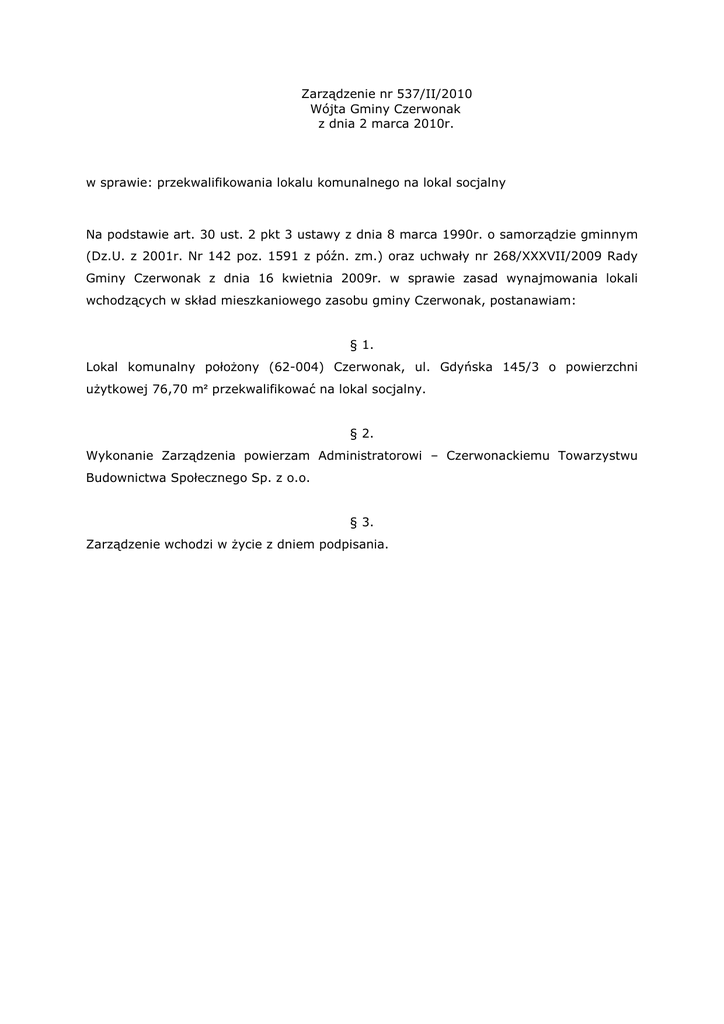 Zarządzenie nr 537/II/2010 Wójta Gminy Czerwonak z dnia 2 marca 2010r. w sprawie: przekwalifikowania lokalu komunalnego na lokal socjalny Na podstawie art. 30 ust. 2 pkt 3 ustawy z dnia 8 marca 1990r. o samorządzie gminnym (Dz.U. z 2001r. Nr 142 poz. 1591 z późn. zm.) oraz uchwały nr 268/XXXVII/2009 Rady Gminy Czerwonak z dnia 16 kwietnia 2009r. w sprawie zasad wynajmowania lokali wchodzących w skład mieszkaniowego zasobu gminy Czerwonak, postanawiam: § 1. Lokal komunalny połoŜony (62-004) Czerwonak, ul. Gdyńska 145/3 o powierzchni uŜytkowej 76,70 m² przekwalifikować na lokal socjalny. § 2. Wykonanie Zarządzenia powierzam Administratorowi – Czerwonackiemu Towarzystwu Budownictwa Społecznego Sp. z o.o. § 3. Zarządzenie wchodzi w Ŝycie z dniem podpisania.