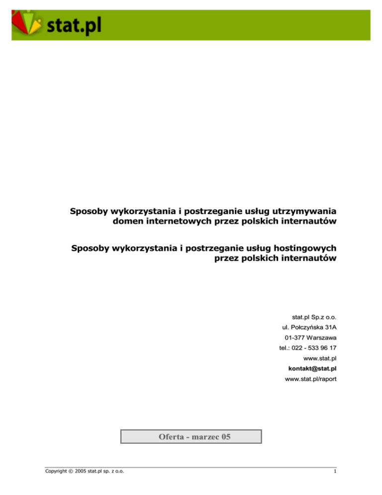Sposoby wykorzystania i postrzeganie usług utrzymywania domen internetowych przez polskich internautów Sposoby wykorzystania i postrzeganie usług hostingowych przez polskich internautów stat.pl Sp.z o.o. ul. Połczyńska 31A 01-377 W arszawa tel.: 022 - 533 96 17 www. stat.pl [email protected] www. stat.pl/raport Oferta - marzec 05 Copyright © 2005 stat.pl sp. z o.o. 1 1. Wstęp Raporty „Sposoby wykorzystania i postrzeganie usług utrzymywania domen internetowych przez polskich internautów” oraz „Sposoby wykorzystania i postrzeganie usług hostingowych przez polskich internautów”” zostały przygotowane przez firmę badawczą Gemius SA we współpracy ze stat.pl Sp. z o.o. Zakres tematyczny raportów został skonstruowany w oparciu o sugestie i konsultacje ze strony podmiotów oferujących usługi będące przedmiotem badania. Informacje zawarte w raportach stanowią pierwszą tego typu próbę oceny sytuacji na polskim rynku domen internetowych i usług hostingowych. Dane z pewnością zainteresują wszystkie firmy oferujące usługi hostingowe (płatne i bezpłatne) jak również podmioty skupiające się w swojej działalności wyłącznie na rejestracji domen internetowych. Jak dowodzą przeprowadzone badania umiejętne łączenie ofert i tworzenie kompleksowych rozwiązań może przynieść efekty w postaci wzrostu lojalności klientów i zwiększeniu sprzedaży. Raporty powinny być również interesujące dla firm świadczących usługi dostępu do internetu gdyż jak wskazują wyniki badań istnieje ważny związek pomiędzy usługami dostępowymi a korzystaniem przez internautów z domen internetowych i usług hostingowych. Raporty skierowane są również do wszystkich przedsiębiorców planujących rozpoczęcie działalności lub rozszerzenie dotychczasowej oferty w zakresie usług będących przedmiotem badania. Informacje zgromadzone w trakcie realizacji projektu badawczego będą również wartościowe dla firm poszukujących skutecznych sposobów na uzyskanie przewagi w określonych segmentach rynku. 2. Metodologia Badania przeprowadzono za pomocą dwóch odrębnych kwestionariuszy: a) Sposoby wykorzystania i postrzeganie internetowych przez polskich internautów” usług utrzymywania domen • Badanie przeprowadzono za pomocą kwestionariusza wyświetlanego w internecie. Ankiety były emitowane w dniach 22.12.2004–14.01.2005 r. na witrynach korzystających z bezpłatnego audytu site-centric stat.pl/PBI. • Ankietę wyświetlano losowo co n-temu użytkownikowi. • Grupa ankietowana to osoby w wieku 15 i więcej lat, które zarejestrowały bądź planują zarejestrować domenę internetową • W ramach badania zebrano 11587 kwestionariuszy, z których wyłoniono 2105 kwestionariuszy, respondentów odpowiadających kryteriom grupy celowej, tzn. osoby, które zarejestrowały domenę lub planują zarejestrować Copyright © 2005 stat.pl sp. z o.o. 2 b) Sposoby wykorzystania i postrzeganie usług hostingowych przez polskich internautów • Badanie przeprowadzono za pomocą kwestionariusza wyświetlanego w internecie. Ankiety były emitowane w dniach 28.XII.2004 - 17.I.2005 r. na witrynach korzystających z bezpłatnego audytu site-centric stat.pl/PBI. • Ankietę wyświetlano losowo co n-temu użytkownikowi. • Grupa ankietowana to osoby w wieku 15 i więcej lat, które założyły bądź planują założyć serwer u dostawcy rozwiązań hostingowych. • W ramach badania zebrano 9993 kwestionariuszy, z których wyłoniono 1162 kwestionariuszy respondentów odpowiadających kryteriom grupy celowej. W celu zapewniania pełnej reprezentatywności badań, wyniki dla wszystkich internautów uzyskano przy uwzględnieniu struktury społeczno-demograficznej pochodzącej z badania Interbus TNS OBOP. 3. Zawartość raportu „Sposoby wykorzystania i postrzeganie usług utrzymywania domen internetowych przez polskich internautów” Wyniki 69,1% osób z grupy celowej w trakcie przeprowadzania badania miało już zarejestrowaną domenę, natomiast 30,9% respondentów dopiero planowało taki krok. Połowa badanych z drugiej wymienionej grupy przeglądała oferty dotyczące rejestracji domen. Wykres 1. Skład grupy celowej dla badania Źródło: Gemius SA. 22.XII.2004 – 14.I. 2005 N = 2105 (wszyscy badani z grupy celowej) Copyright © 2005 stat.pl sp. z o.o. 3 Badani z grupy celowej najczęściej deklarowali, że mają lub myślą tylko o jednej domenie: 52,6% spośród tych, którzy już mają zarejestrowaną domenę i – nieco więcej – 68,2% spośród planujących takie przedsięwzięcie. Natomiast osoby mające już domenę częściej deklarowały, że mają zarejestrowane 2-3 domeny (32,2%), niż te, które planowały zarejestrowanie takiej liczby domen (20%). Wykres 2. Ile domen ma Pan(i) zarejestrowanych? Ile domen ma Pan(i) zamiar zarejestrować? Źródło: Gemius SA. 22.XII.2004 – 14.I. 2005 N = 2105 (wszyscy badani z grupy celowej) 79,9% osób posiadających domenę deklarowało, że ją wykorzystuje. Najczęściej do celów związanych z prywatną stroną www (69,8%), serwerem pocztowym (50,4%) oraz firmową stroną www (43,9%). Wykres 3. Do jakich celów używa Pan(i) domenę/domeny WWW? W jakim celu chce Pan(i) zarejestrować domenę/domeny WWW? Źródło: Gemius SA. 22.XII.2004 – 14.I. 2005 N = 1809 (Badani deklarujący używanie domeny WWW oraz ci, którzy planują zarejestrować domenę) Copyright © 2005 stat.pl sp. z o.o. 4 Spośród podanych firm rejestrujących domeny najwięcej respondentów znało firmy NetArt i home.pl (odpowiednio 39,7% i 39,3%), nieznacznie mniej osób deklarowało, że zna serwis domeny.onet.pl (35,5%). Więcej niż ¼ badanych deklarowała, że zna również serwisy: nask.pl (30,1%), domeny.interia.pl (29,7%), domeny.pl (28,4%), domeny.wp.pl (27,9%) i domena.pl (27,8%). 13,4% badanych deklarowało, że nie zna żadnej firmy rejestrującej domeny. Odpowiedzi nie sumują się do 100%, gdyż badani mogli zaznaczyć w