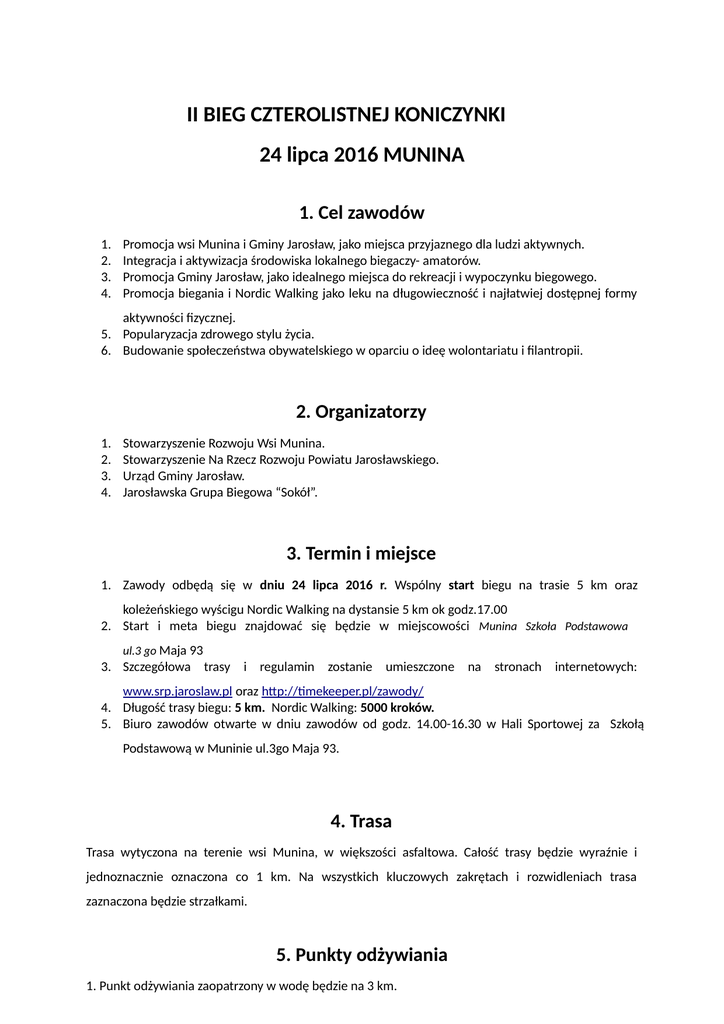 II BIEG CZTEROLISTNEJ KONICZYNKI 24 lipca 2016 MUNINA 1. Cel zawodów 1. 2. 3. 4. Promocja wsi Munina i Gminy Jarosław, jako miejsca przyjaznego dla ludzi aktywnych. Integracja i aktywizacja środowiska lokalnego biegaczy- amatorów. Promocja Gminy Jarosław, jako idealnego miejsca do rekreacji i wypoczynku biegowego. Promocja biegania i Nordic Walking jako leku na długowieczność i najłatwiej dostępnej formy aktywności fizycznej. 5. Popularyzacja zdrowego stylu życia. 6. Budowanie społeczeństwa obywatelskiego w oparciu o ideę wolontariatu i filantropii. 2. Organizatorzy 1. 2. 3. 4. Stowarzyszenie Rozwoju Wsi Munina. Stowarzyszenie Na Rzecz Rozwoju Powiatu Jarosławskiego. Urząd Gminy Jarosław. Jarosławska Grupa Biegowa “Sokół”. 3. Termin i miejsce 1. Zawody odbędą się w dniu 24 lipca 2016 r. Wspólny start biegu na trasie 5 km oraz koleżeńskiego wyścigu Nordic Walking na dystansie 5 km ok godz.17.00 2. Start i meta biegu znajdować się będzie w miejscowości Munina Szkoła Podstawowa ul.3 go Maja 93 3. Szczegółowa trasy i regulamin zostanie umieszczone na stronach internetowych: www.srp.jaroslaw.pl oraz http://timekeeper.pl/zawody/ 4. Długość trasy biegu: 5 km. Nordic Walking: 5000 kroków. 5. Biuro zawodów otwarte w dniu zawodów od godz. 14.00-16.30 w Hali Sportowej za Szkołą Podstawową w Muninie ul.3go Maja 93. 4. Trasa Trasa wytyczona na terenie wsi Munina, w większości asfaltowa. Całość trasy będzie wyraźnie i jednoznacznie oznaczona co 1 km. Na wszystkich kluczowych zakrętach i rozwidleniach trasa zaznaczona będzie strzałkami. 5. Punkty odżywiania 1. Punkt odżywiania zaopatrzony w wodę będzie na 3 km. 6. Zasady uczestnictwa 1. Zgłoszenie się zawodnika do biegu jest równoważne z oświadczeniem, że biegnie na własną odpowiedzialność z pełną świadomością niebezpieczeństw i ryzyka wynikającego z charakteru tego wydarzenia, posiada dobry stan zdrowia, bez przeciwwskazań medycznych do uczestnictwa w wydarzeniu, wyraża zgodę na przetwarzanie danych osobowych oraz wizerunku dla potrzeb materiałów reklamujących biegu oraz potrzebnej dokumentacji. 2. Warunkiem dopuszczenia zawodnika niepełnoletniego do startu jest obecność rodzica lub opiekuna prawnego w momencie weryfikacji zawodnika w biurze zawodów oraz podpisanie oświadczenia o braku przeciwwskazań do uczestnictwa w zawodach lub okazanie oryginału ważnego zaświadczenia od lekarza o braku przeciwwskazań do pokonania dystansu 5 km. Opiekun bierze odpowiedzialność za udział dziecka w biegu i ewentualne tego skutki, oraz wyraża, zgodę na przetwarzanie danych osobowych, wizerunku w materiałach reklamowych i dokumentacyjnych . 3. Każdy uczestnik zawodów jest zobowiązany do umieszczenia numeru startowego w widocznym miejscu. 4. Warunkiem sklasyfikowania zawodnika jest pokonanie zatwierdzonej trasy w regulaminowym czasie 1 godziny. Zawodnicy, którzy nie ukończą biegu lub marszu do godz.18.00 zobowiązani są do przerwania biegu i zejścia z trasy. Ktokolwiek pozostanie na trasie po upływie tego czasu, ponosi za to odpowiedzialność (obowiązują go przepisy o ruchu drogowym oraz Kodeks Cywilny). 5. W biegu i wyścigu Nordic Walking mogą uczestniczyć osoby, które ukończyły 14 lat, zaś w grupie rodzinnej możliwe jest uczestnictwo młodszych biegaczy pod bezpośrednią opieką opiekuna prawnego. 7. Zgłoszenia i opłata startowa 1. Zgłoszenia do II Biegu Czterolistnej Koniczynki (bieg i Nordic Walking) przyjmowane będą poprzez formularz zgłoszeniowy na stronie http://timekeeper.pl/zawody / i w biurze zawodów jeśli będą wolne numery startowe. 2. E-zgłoszenia będą przyjmowane do dnia, 20 lipca 2016r. Po tym terminie zgłoszenie będzie możliwe jedynie w biurze zawodów jeśli będą wolne numery. 3. Za zgłoszenie uważa się wypełnienie prawidłowo formularza zgłoszeniowego, uiszczenie opłaty startowej, podpisania karty biegu w biurze zawodów . 4. Organizator zastrzega sobie prawo wcześniejszego zamknięcia zapisów w przypadku wypełnienia limitu zgłoszeń, który wynosi 300 osób/ decyduje kolejność zgłoszeń/. 5. Opłata startowa za udział w II Biegu Czterolistnej Koniczynki i Nordic Walking wynosi nie mniej niż 20 zł . 6. Opłata w dniu zawodów wynosi 30 zł. 7. Opłatę startową należy wpłacić do 20 lipca 2016. Po tym terminie możliwe będzie uiszczenie wyższej opłaty w biurze zawodów. 8. Istnieje możliwość wniesienia opłaty startowej za większą liczbę Uczestników na jednym blankiecie wpłaty. W takim wypadku w tytule przelewu należy wpisać imiona i nazwiska uczestników, za których wnoszona jest opłata startowa. 9. Opłata raz uiszczona nie podlega zwrotowi. Nie ma możliwości przeniesienia opłaty na innego uczestnika. 10. W ramach opłaty startowej każdy uczestnik biegu głównego otrzymuje: - medal -koszulkę okolicznościową -elektroniczny pomiar czasu - numer startowy z chipem i agrafkami, - woda na trasie i mecie biegu, - worek na odzież (depozyt), 8. Klasyfikacja Prowadzone będą klasyfikacje w kategorii: 1. 2. 3. ❏ ❏ ❏ ❏ ❏ ❏ ❏ 4. Generalnej Kobiet i Mężczyzn w biegu. Generalnej Kobiet i Mężczyzn Nordic Walking. Wiekowej Kobiet i Mężczyzn w biegu; 14-16 lat 17-19 lat najszybszy(a)po 20-tce (20-29 lat) Najszybszy(a) po 30-stce (30-39 lat) Najszybszy(a) po 40-stce(40-49 lat) Najszybszy(a) po 50-tce(50-59) Ekspert(ka) biegowy(a) (60+) Kategorie: Biegające Rodziny -drużyna liczy minimum 3 osoby ze sobą spokrewnione. Filar rodziny (osoba, od której określane jest pokrewieństwo) jest brany jako odnośnik grupy ,której członkowie są powiązani ze sobą więzami krwi (siostra, brat, ojciec, matka, córka, syn, babcia, dziadziu, kuzyn, kuzynka).W skład rodziny wchodzi również żona /mąż filara rodziny. Do klasyfikacji brane są wyniki trzech najszybszych zawodników. Drużynowa Grup Biegowych – zespoły 4-osobowe(2 kobiety i 2 mężczyzn). Drużyna zostanie s